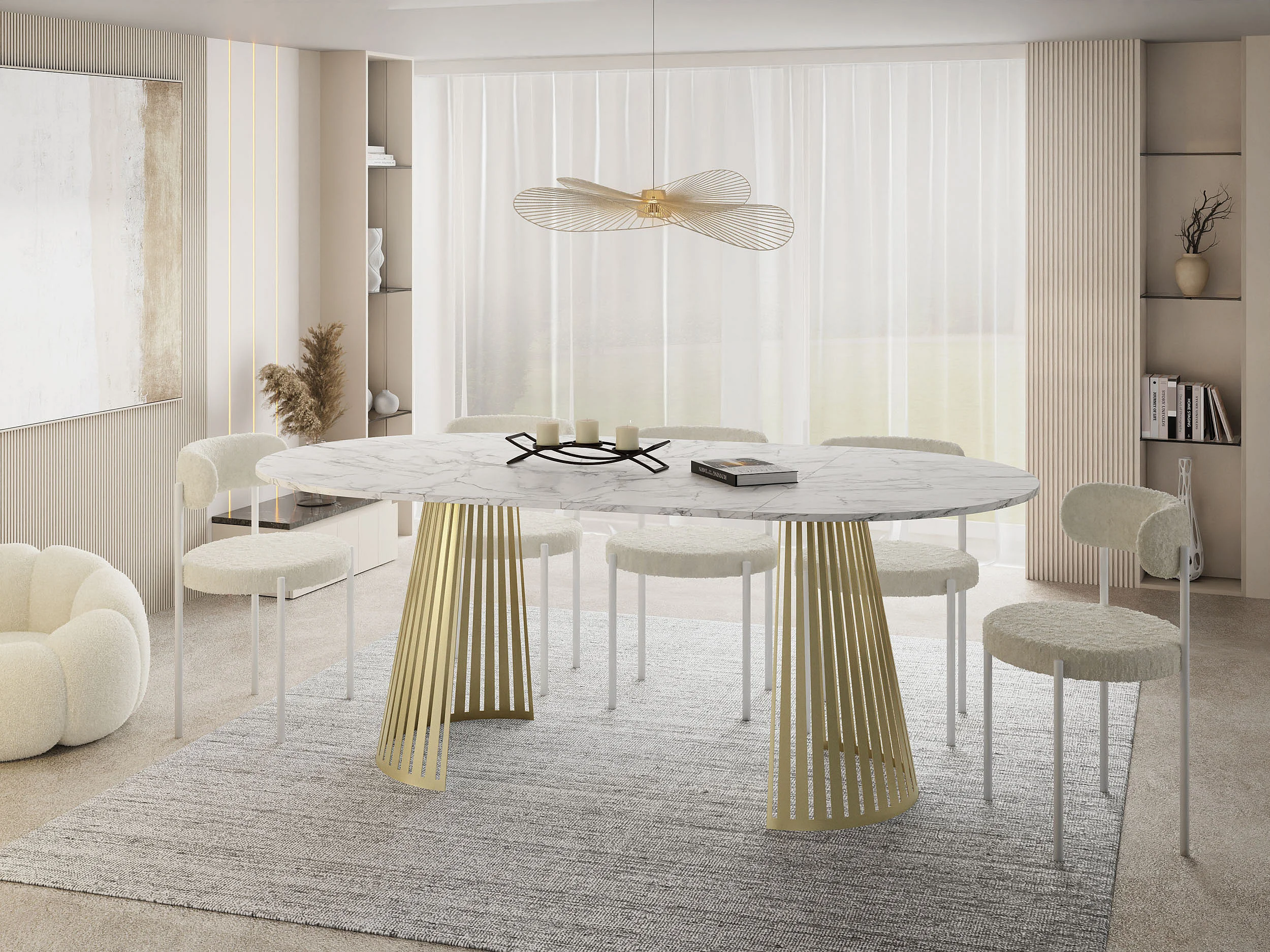 Esstisch Rund Ausziehbar mit Lamellen im Loft-Stil – 100 cm – Industrieller Tisch mit Goldenen Metallbeinen, Platzsparend für Wohnzimmer – Marmor Weiß