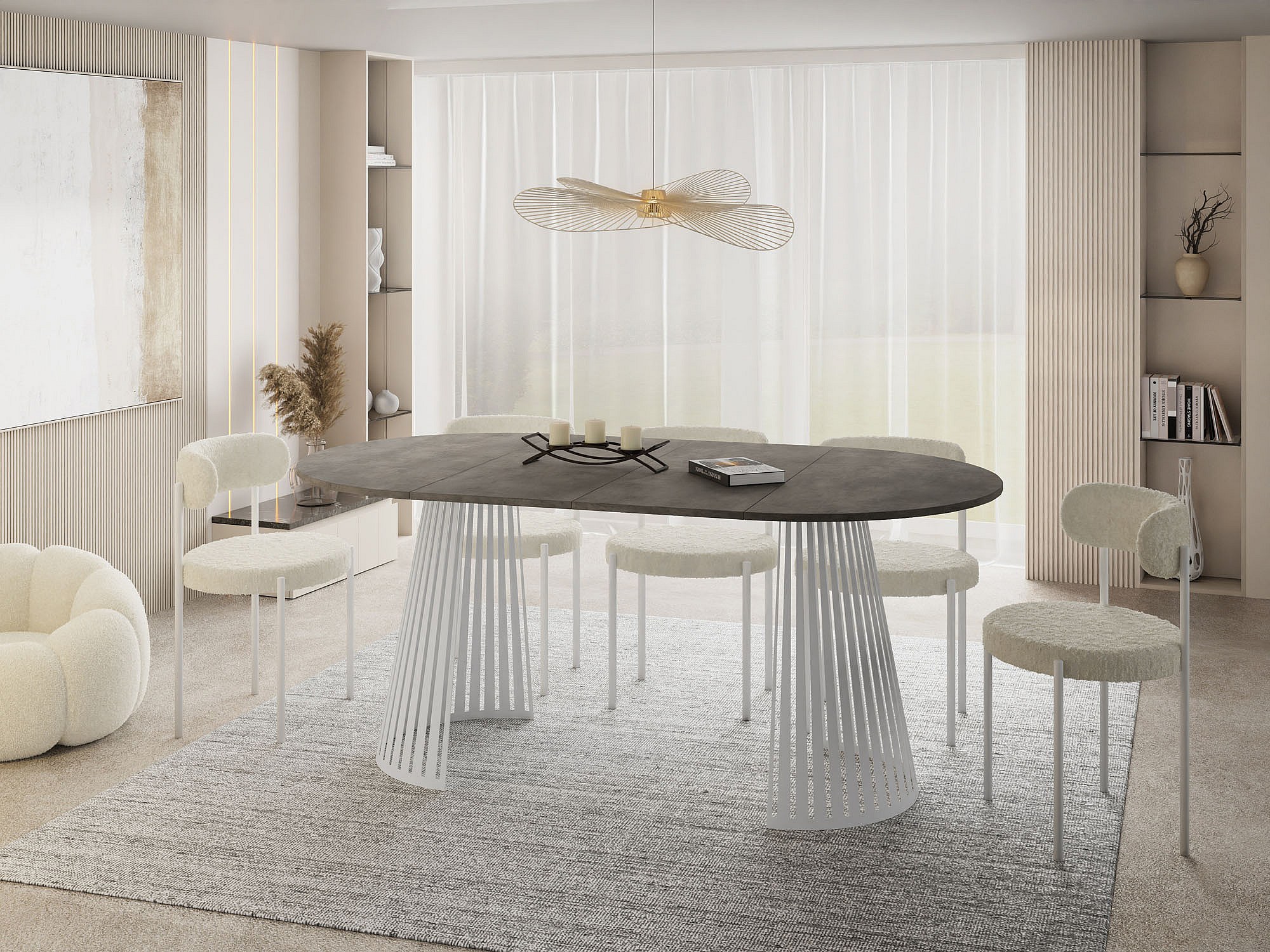 Esstisch Rund Ausziehbar mit Lamellen im Loft-Stil – 100 cm – Industrieller Tisch mit Weißen Metallbeinen, Platzsparend für Esszimmer – Beton-Optik Dunkelgrau
