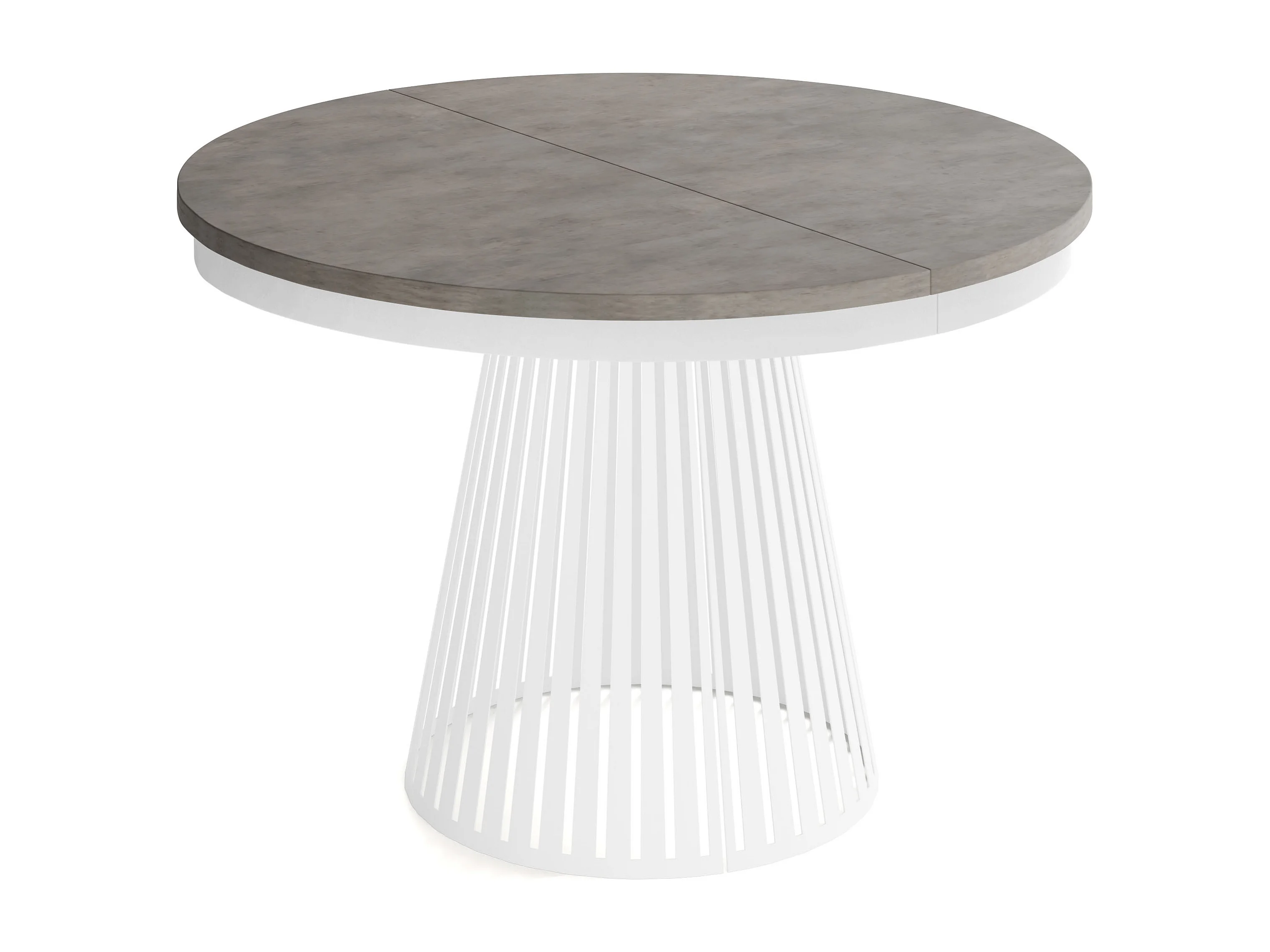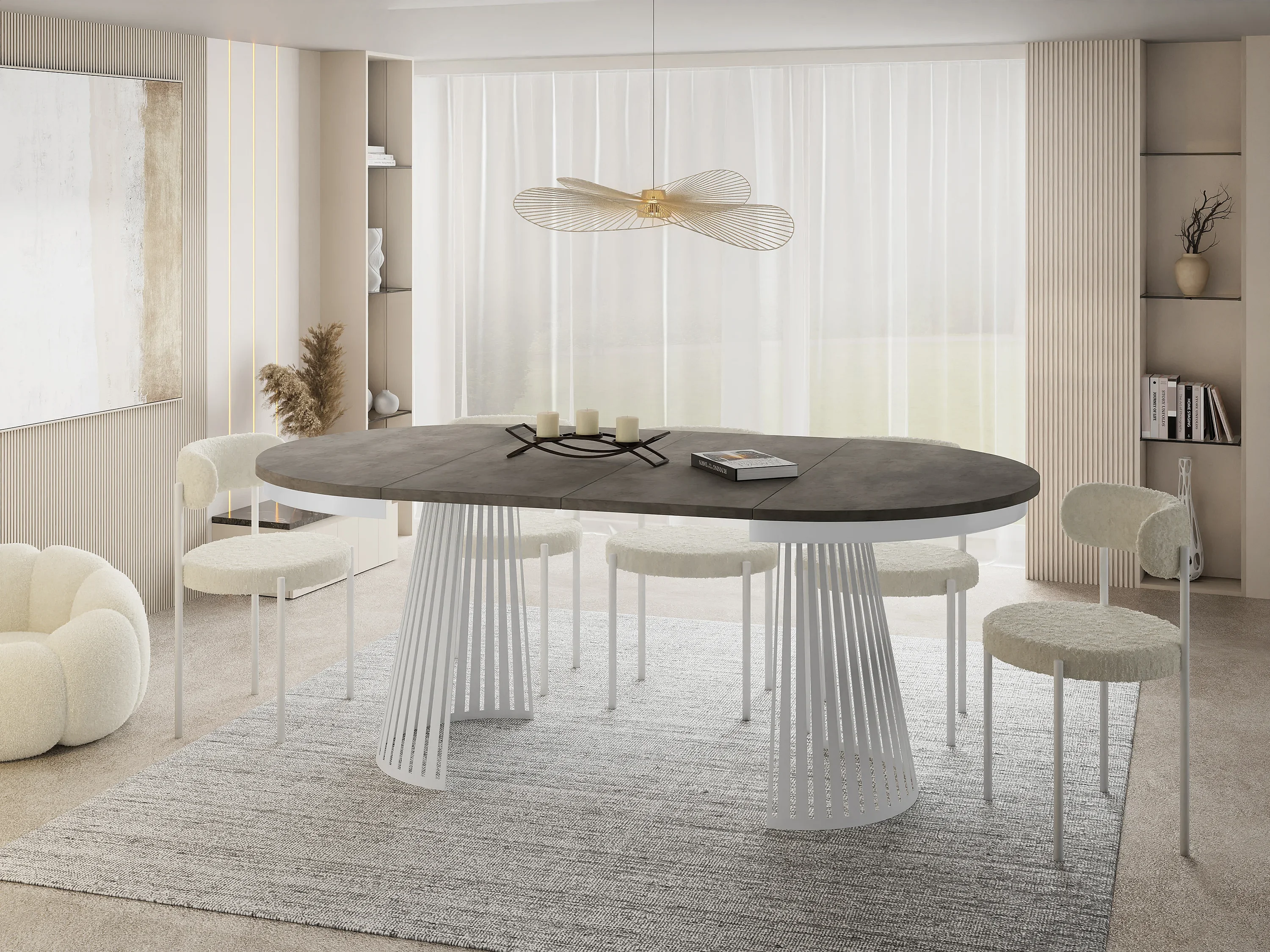 Esstisch Rund Ausziehbar mit Lamellen im Loft-Stil – 100 cm – Industrieller Tisch mit Weißen Metallbeinen, Platzsparend für Esszimmer – Beton-Optik Dunkelgrau