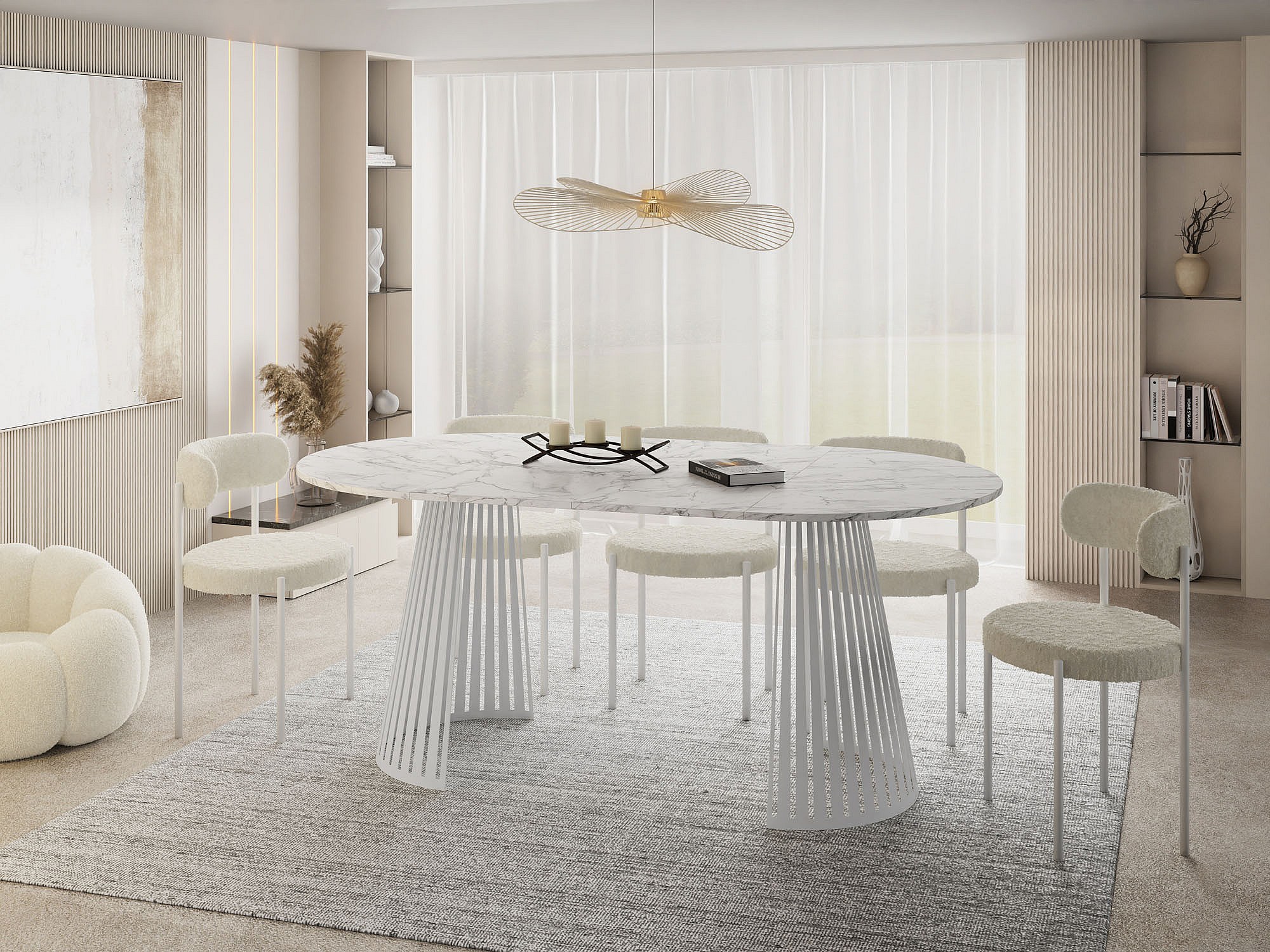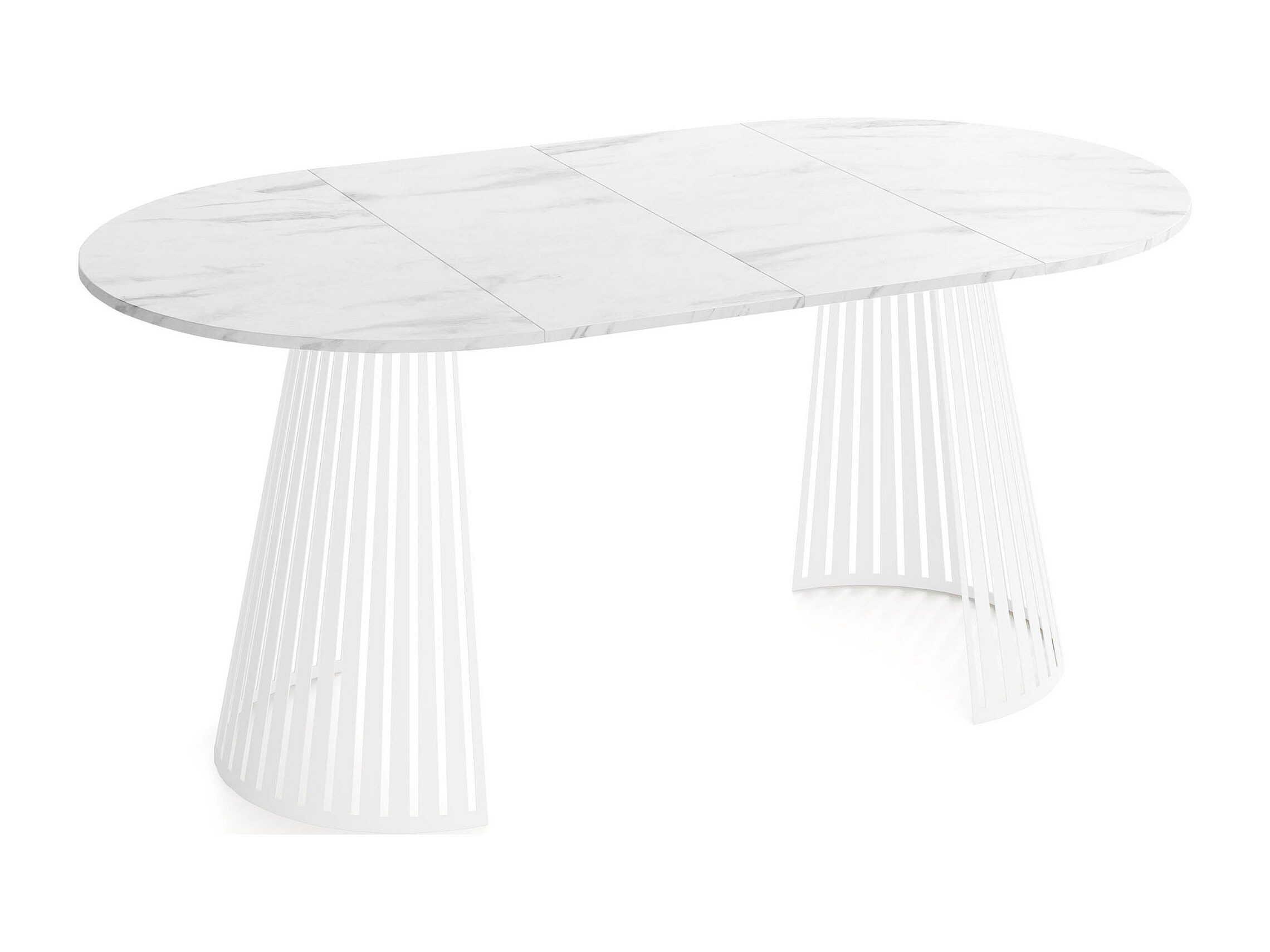 Esstisch Rund Ausziehbar mit Lamellen im Loft-Stil – 100 cm – Industrieller Tisch mit Weißen Metallbeinen, Platzsparend für Wohnzimmer Esszimmer – Marmor Weiß