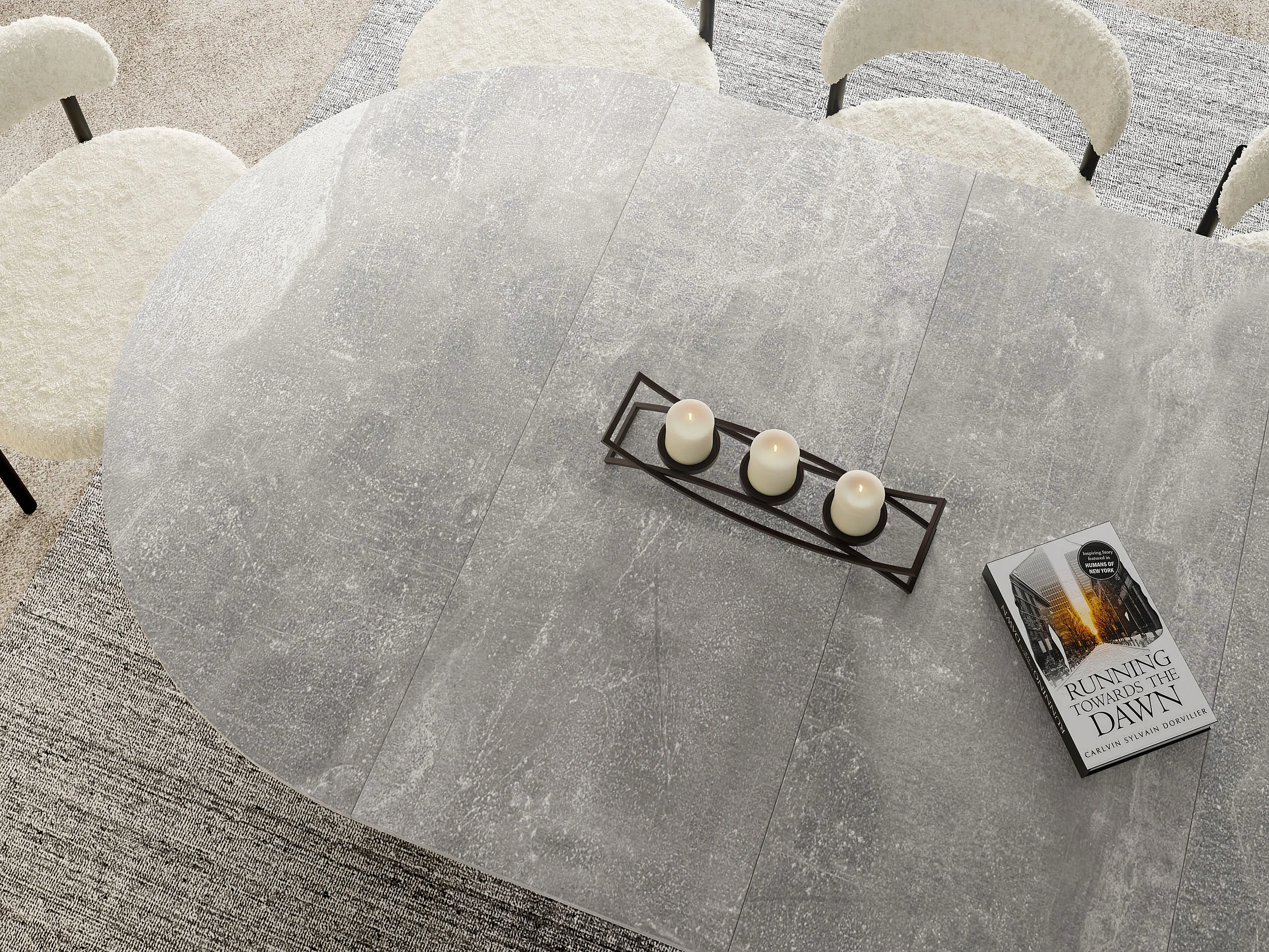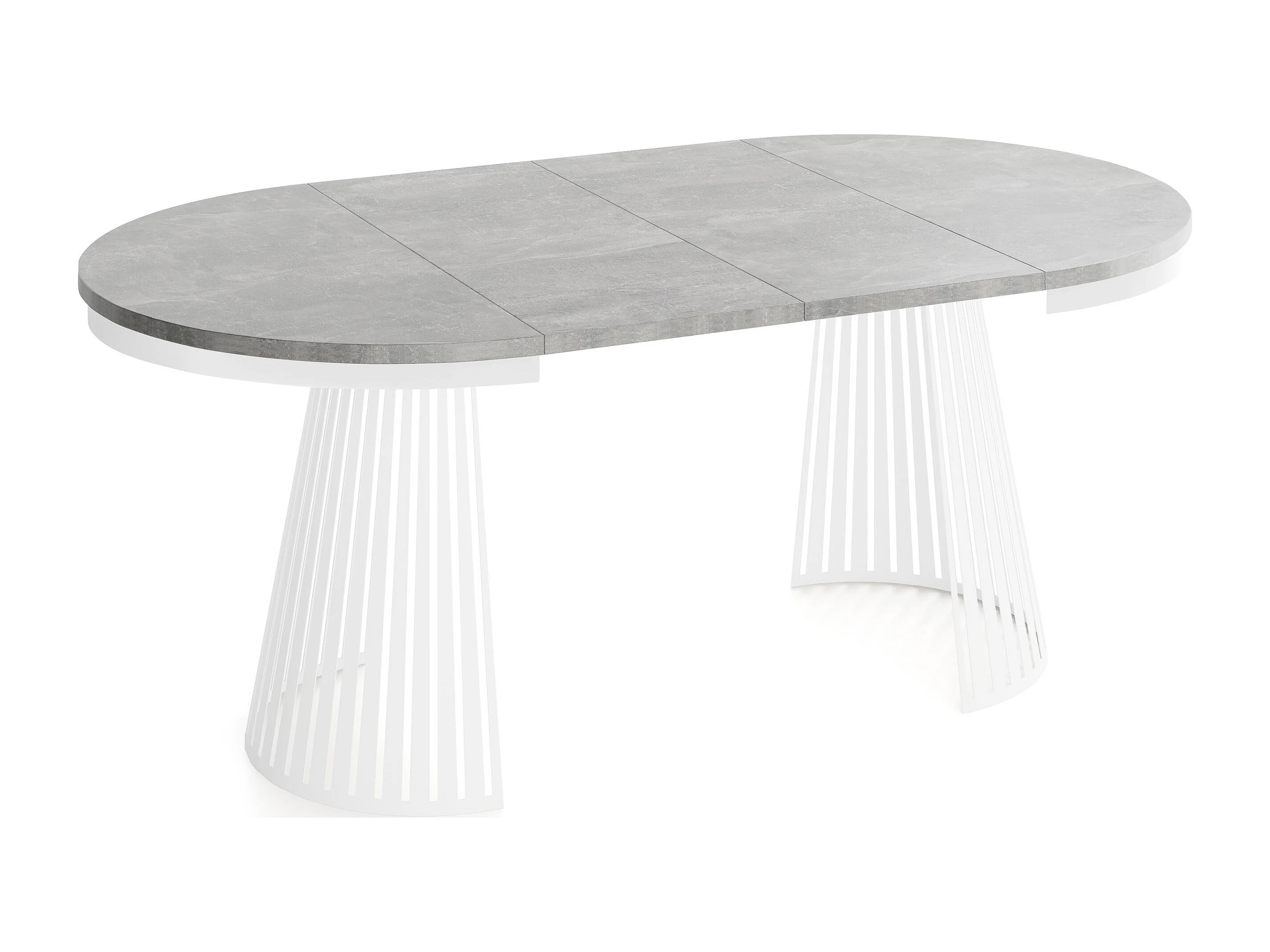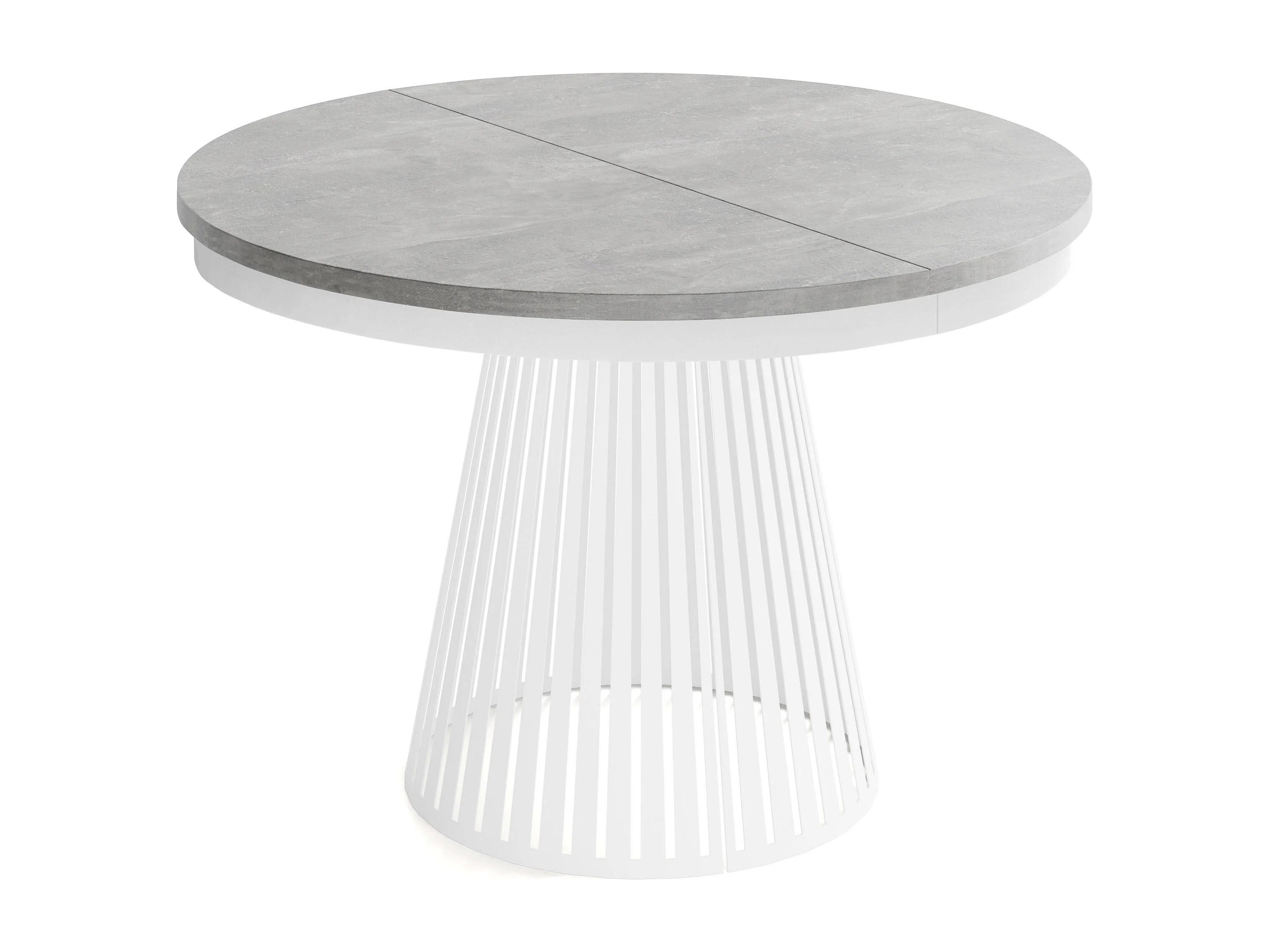 Esstisch Rund Ausziehbar mit Lamellen im Loft-Stil – 120 cm – Industrieller Tisch mit Weißen Metallbeinen, Platzsparend für Wohnzimmer Esszimmer – Grauer Beton