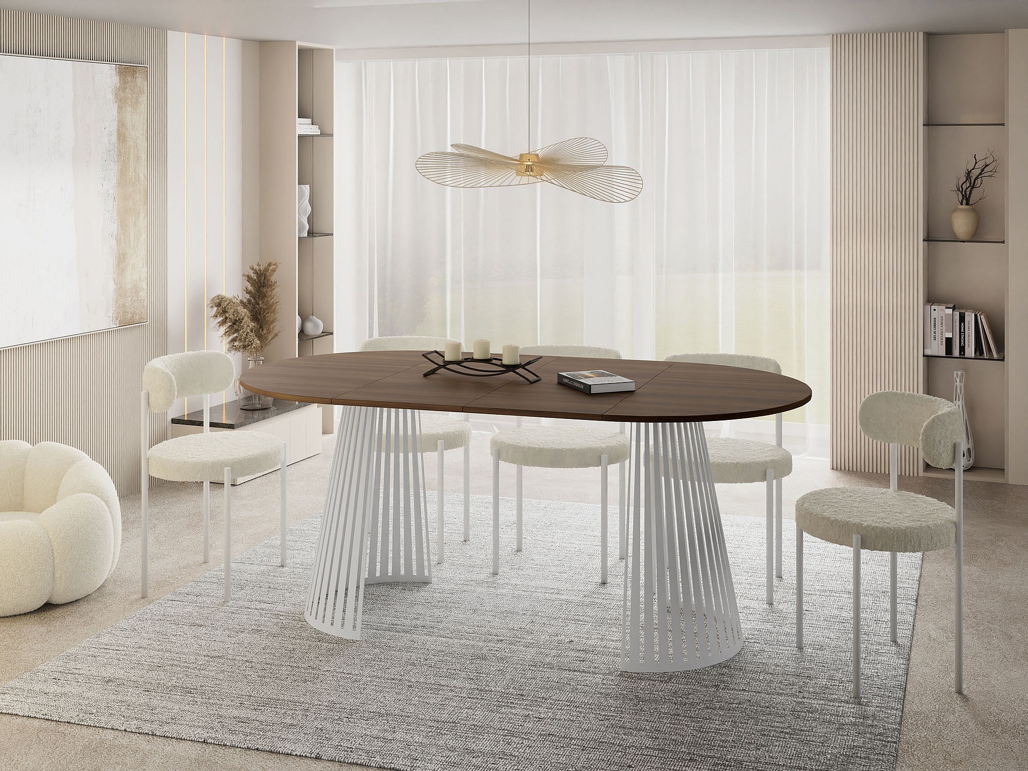 Esstisch Rund Ausziehbar mit Lamellen im Loft-Stil – 120 cm – Industrieller Tisch mit Weißen Metallbeinen, Platzsparend für Wohnzimmer – Walnuss Braun