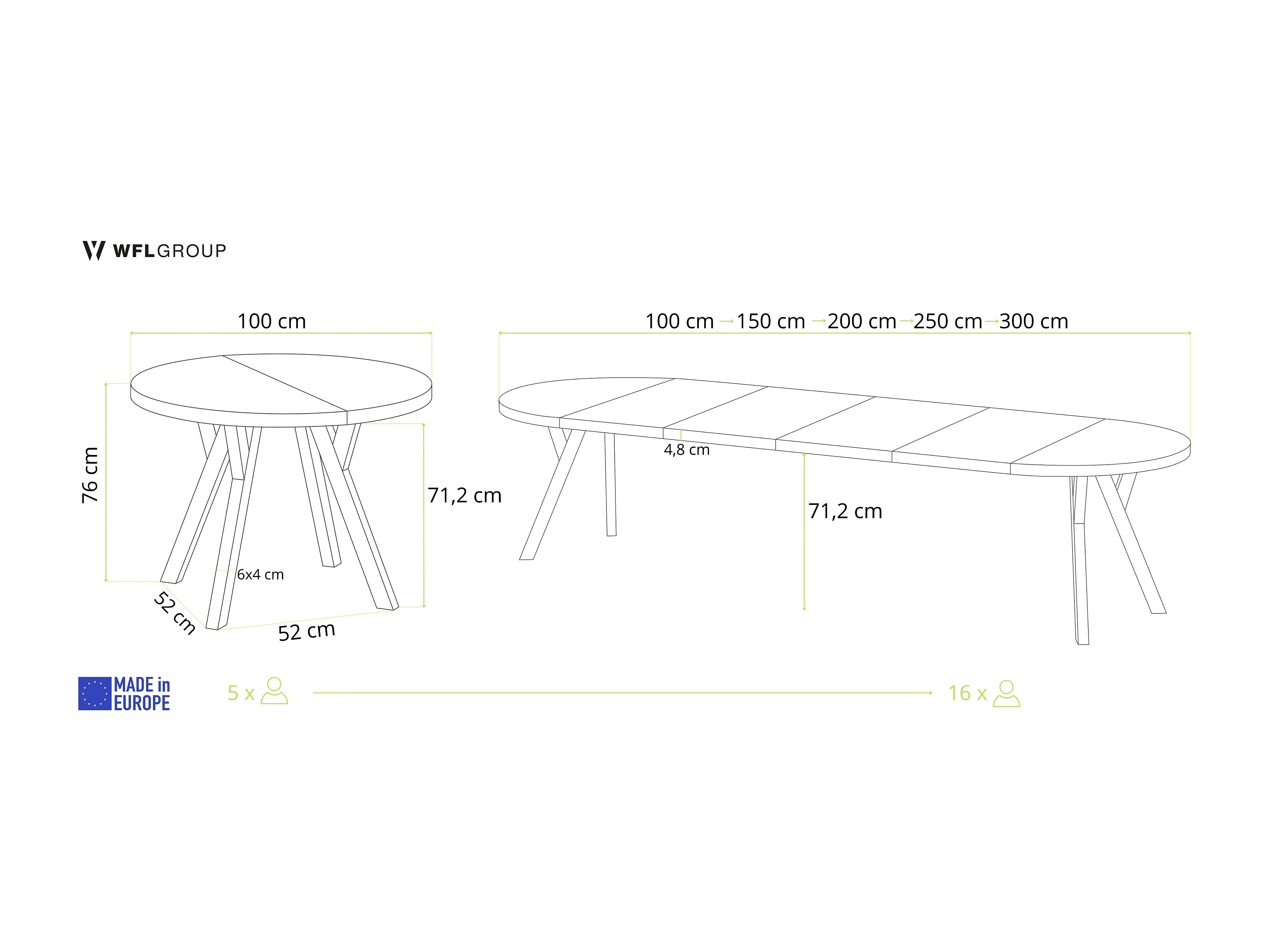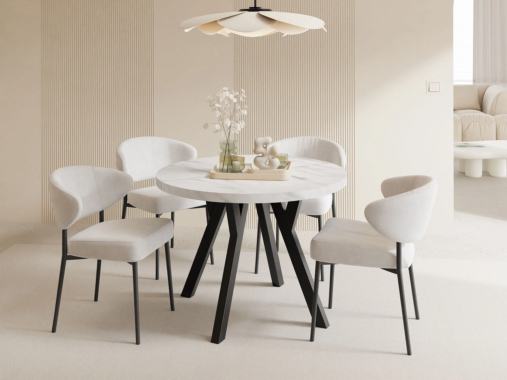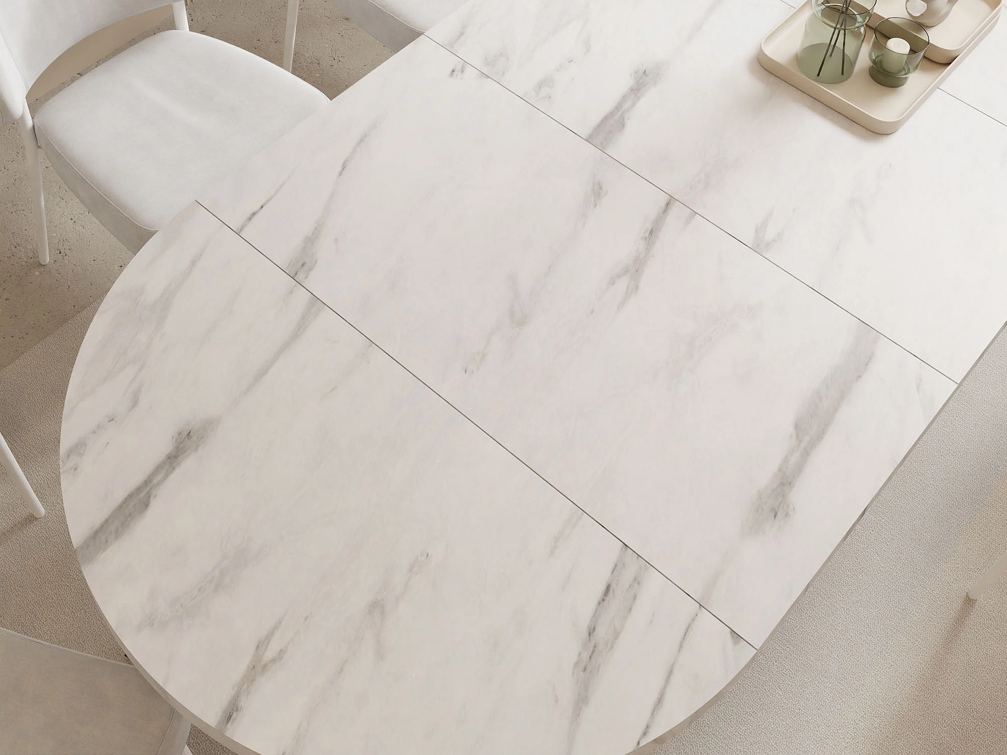 Esstisch Rund Groß XXL Ausziehbar im Loft-Stil – 100 bis 300 cm – Extra Lang Ausziehtisch mit Schwarzen Holzbeinen, Tisch für 5-16 Personen – Marmor Weiß