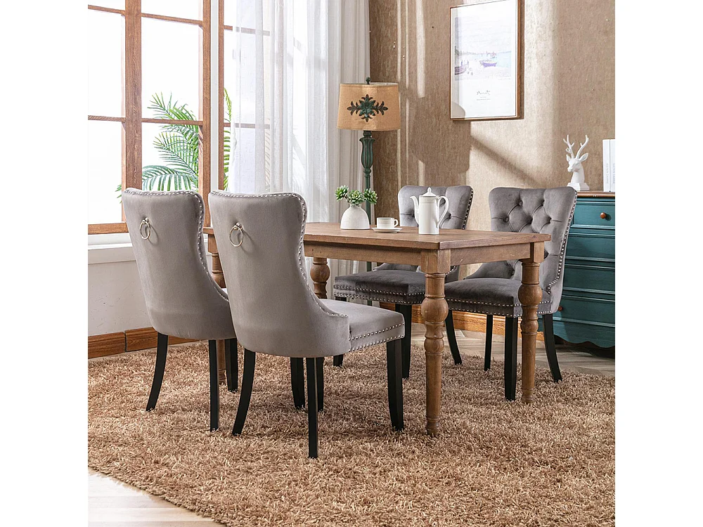 Esszimmerstuhl-Set mit Holzbeinen und Nagelverzierung, Samtbezug, Massivholzgestell, grau