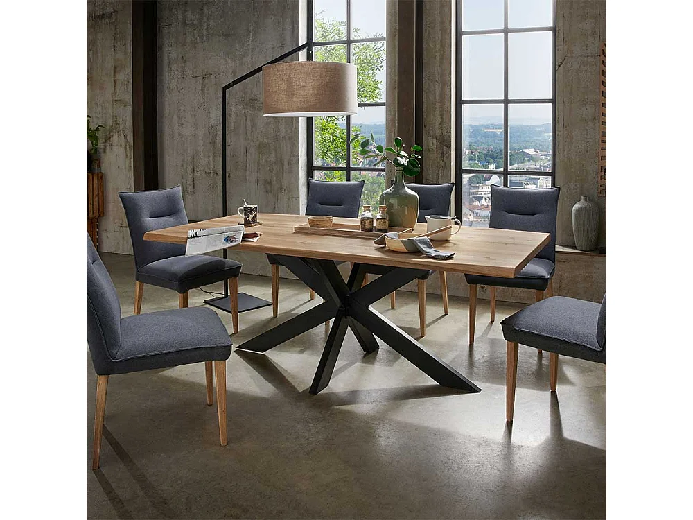 Esszimmertisch aus Wildeiche Massivholz und Stahl Spider Gestell