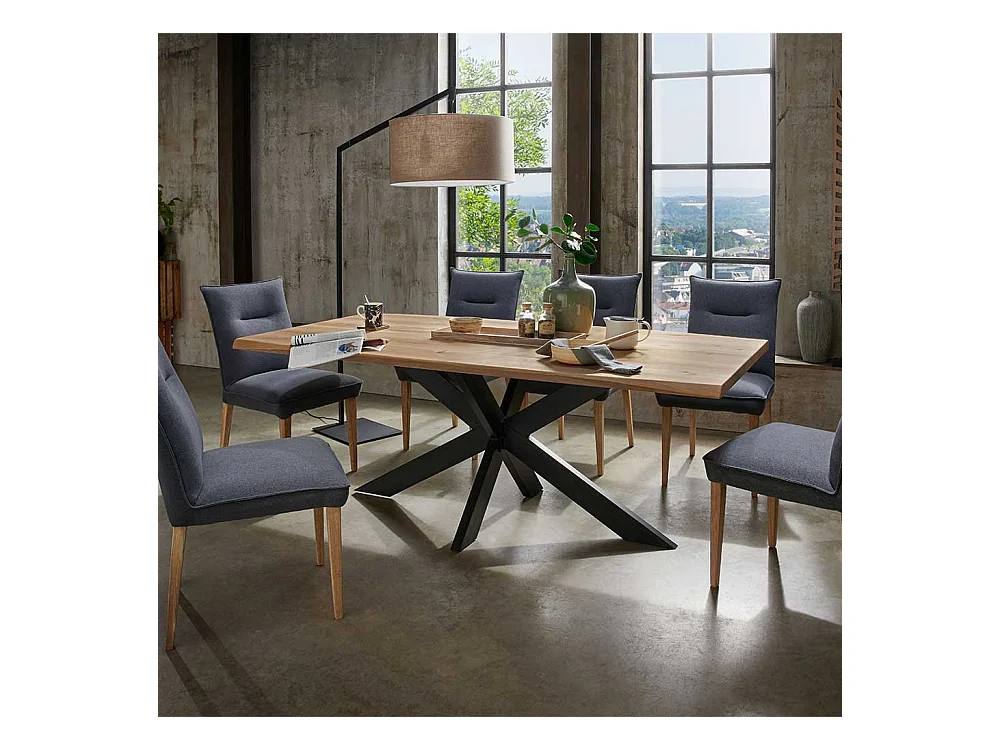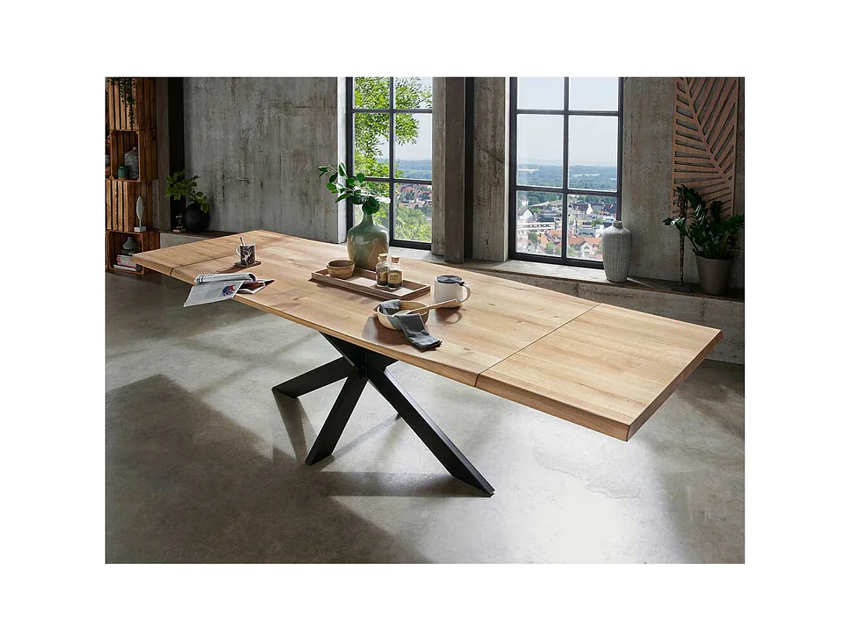 Esszimmertisch aus Wildeiche Massivholz und Stahl Spider Gestell