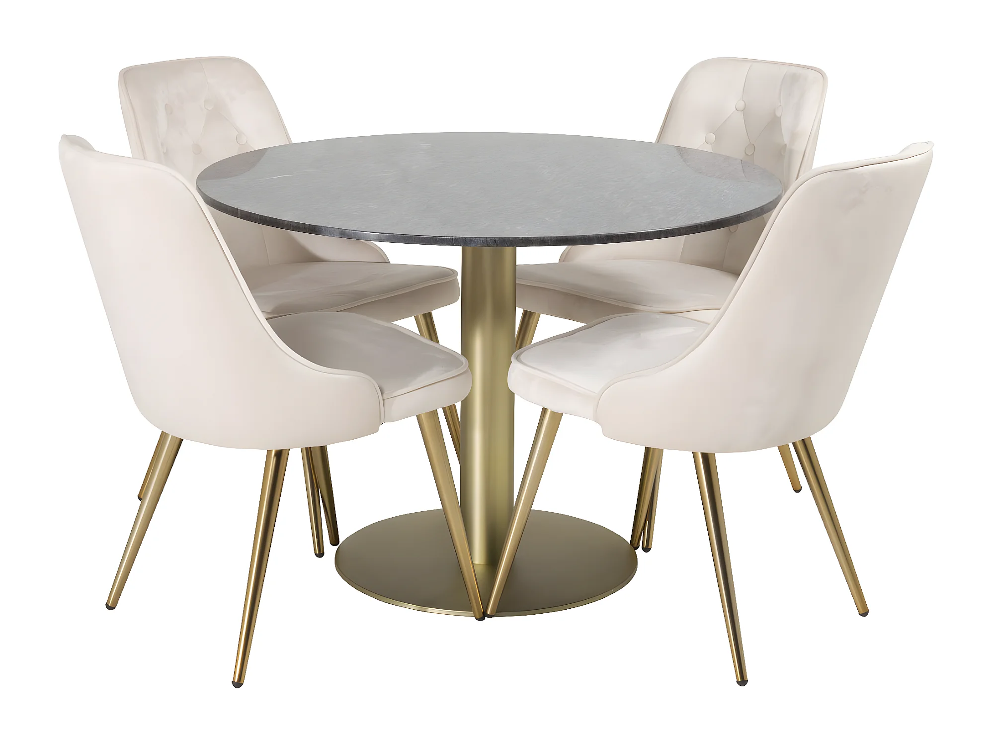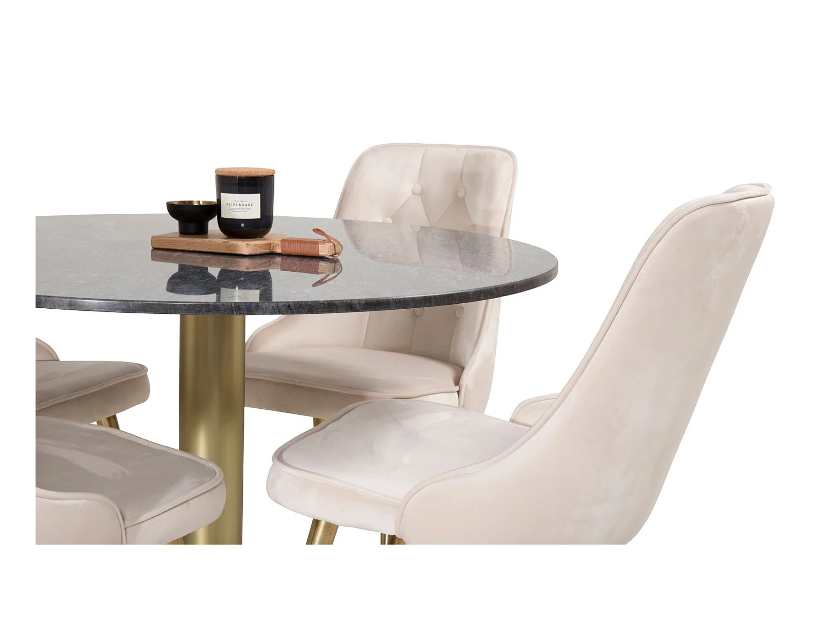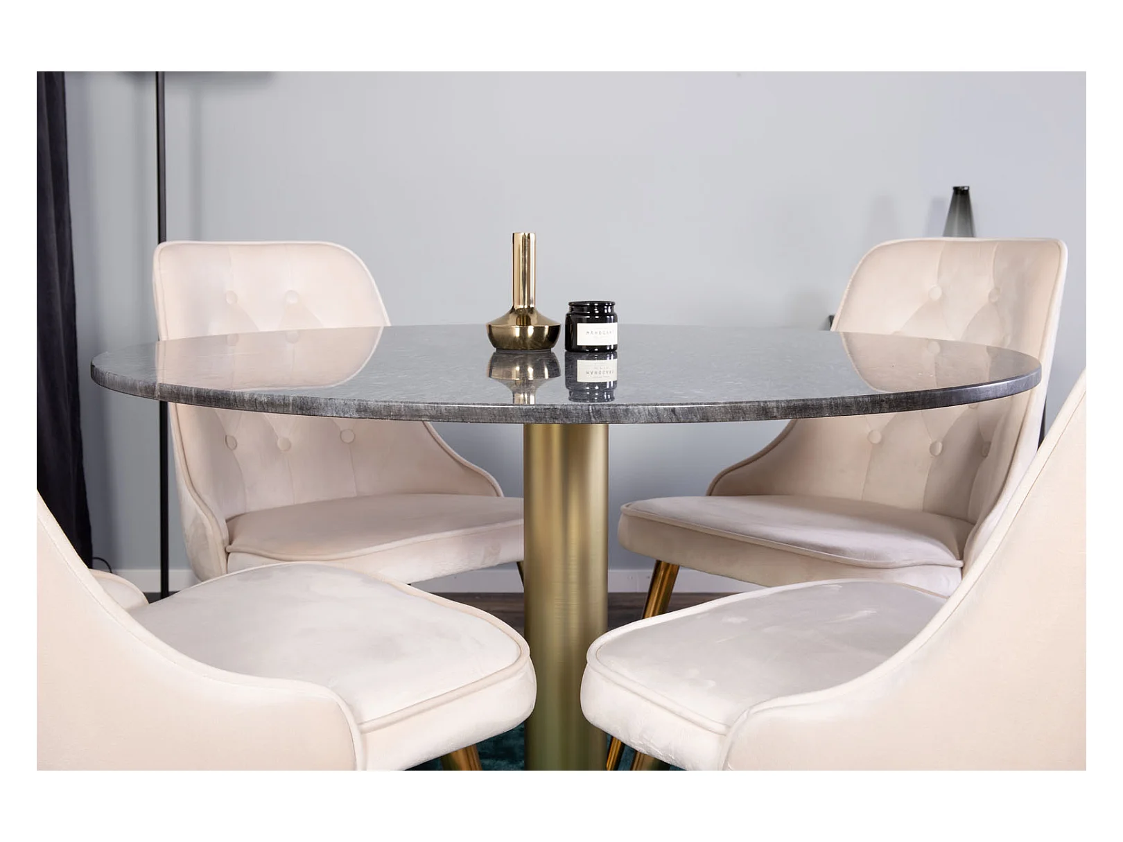 EstelleØ106BLBR Essgruppe Esstisch schwarz, Marmor und 4 Velvet Deluxe Esszimmerstühle Velour beige, Messing dekor.
