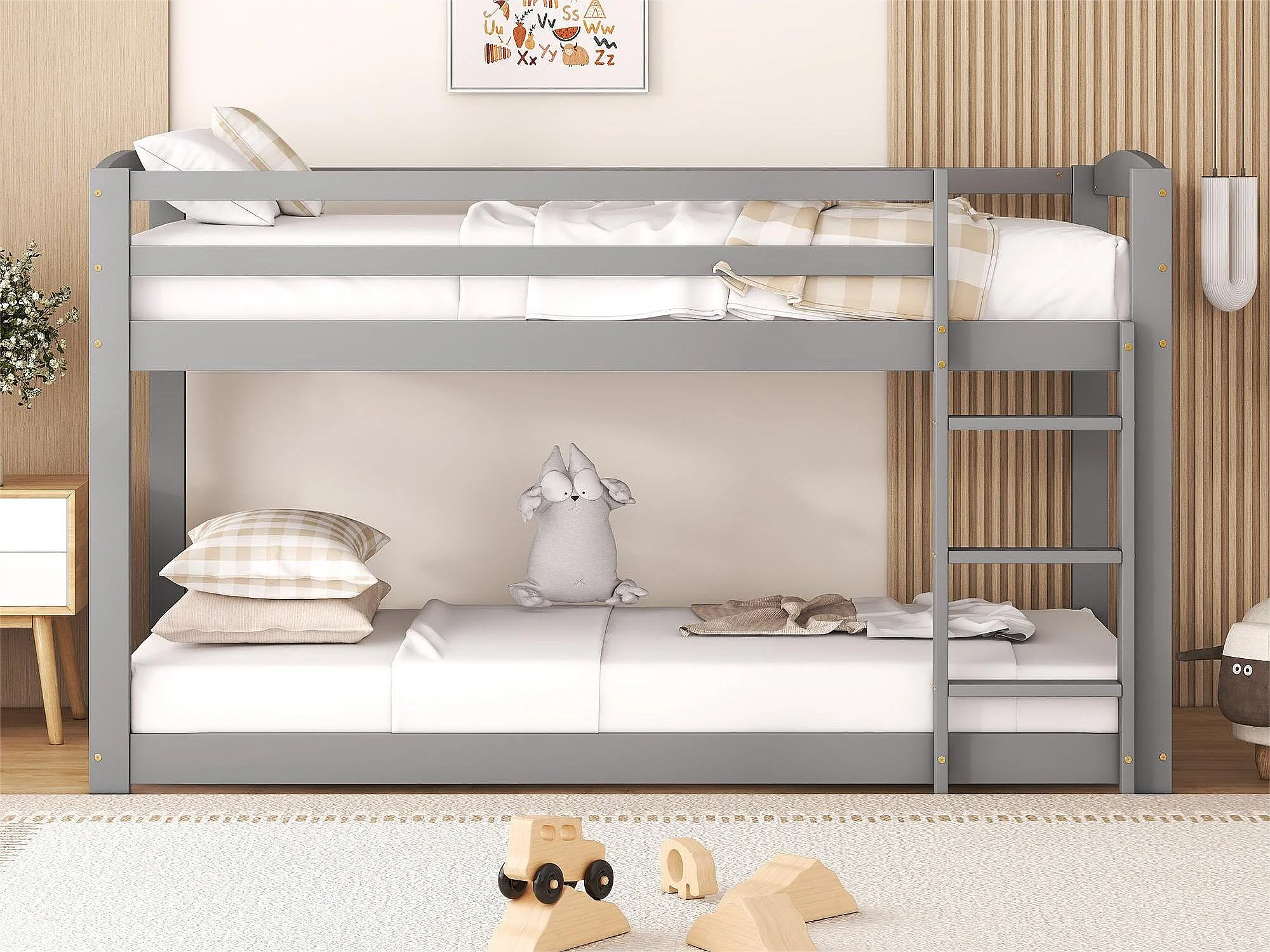 Etagenbett 2 x 90 x 200 cm für Kinder – Kiefer – Barrieren und Leiter – graue Farbe