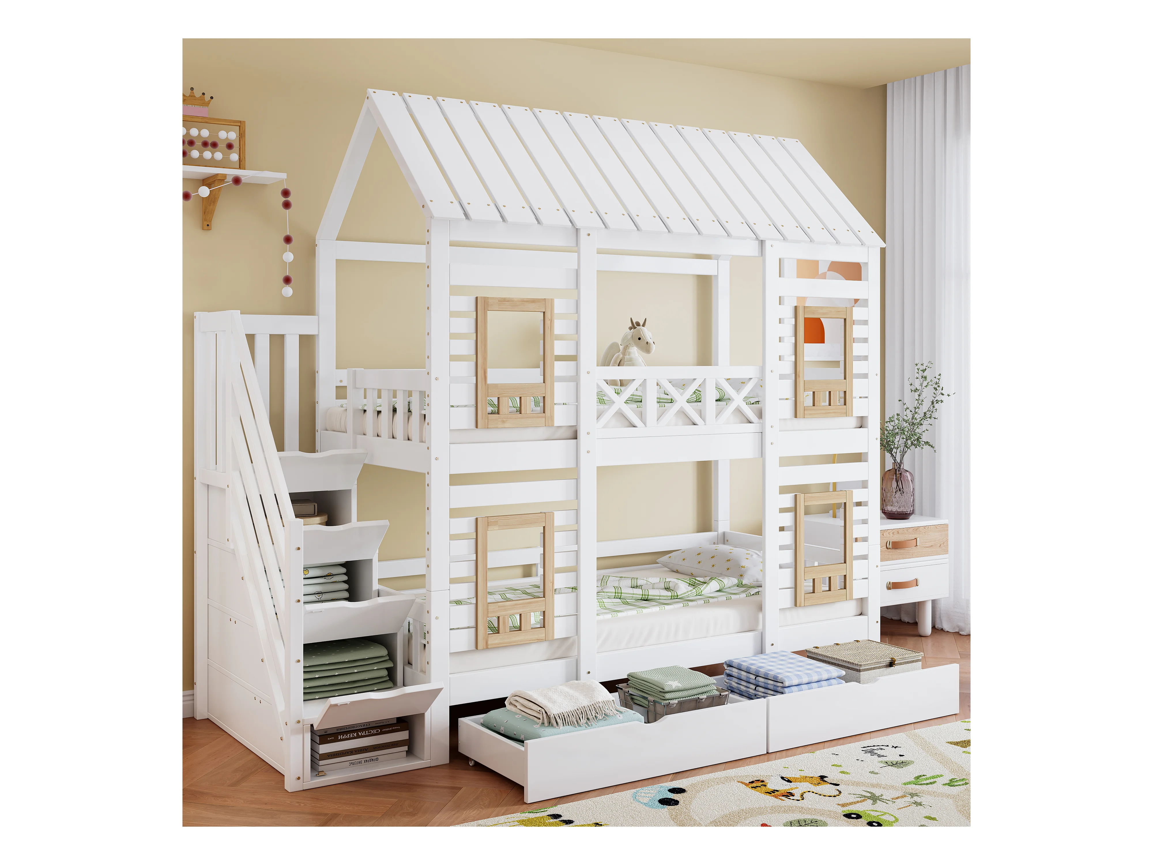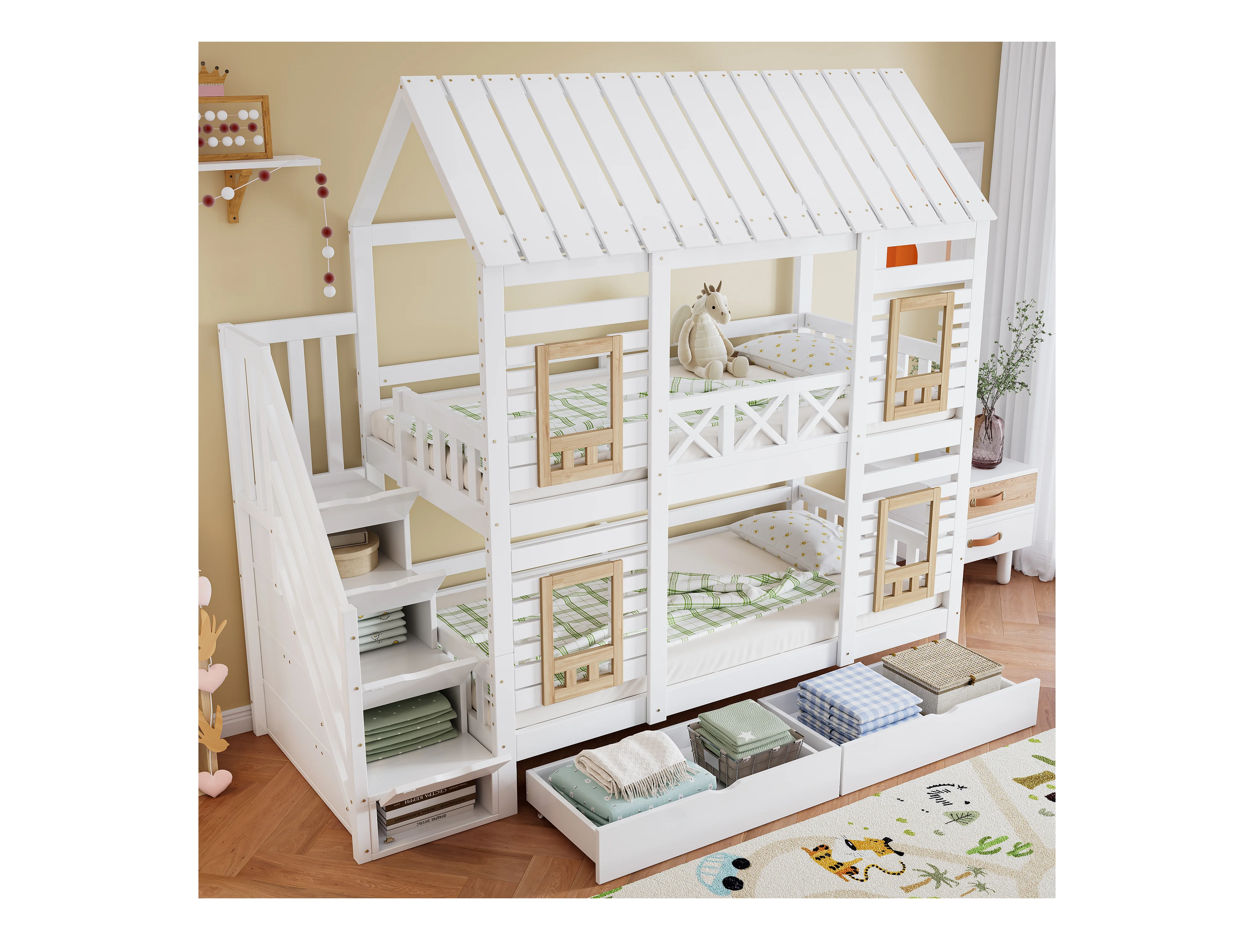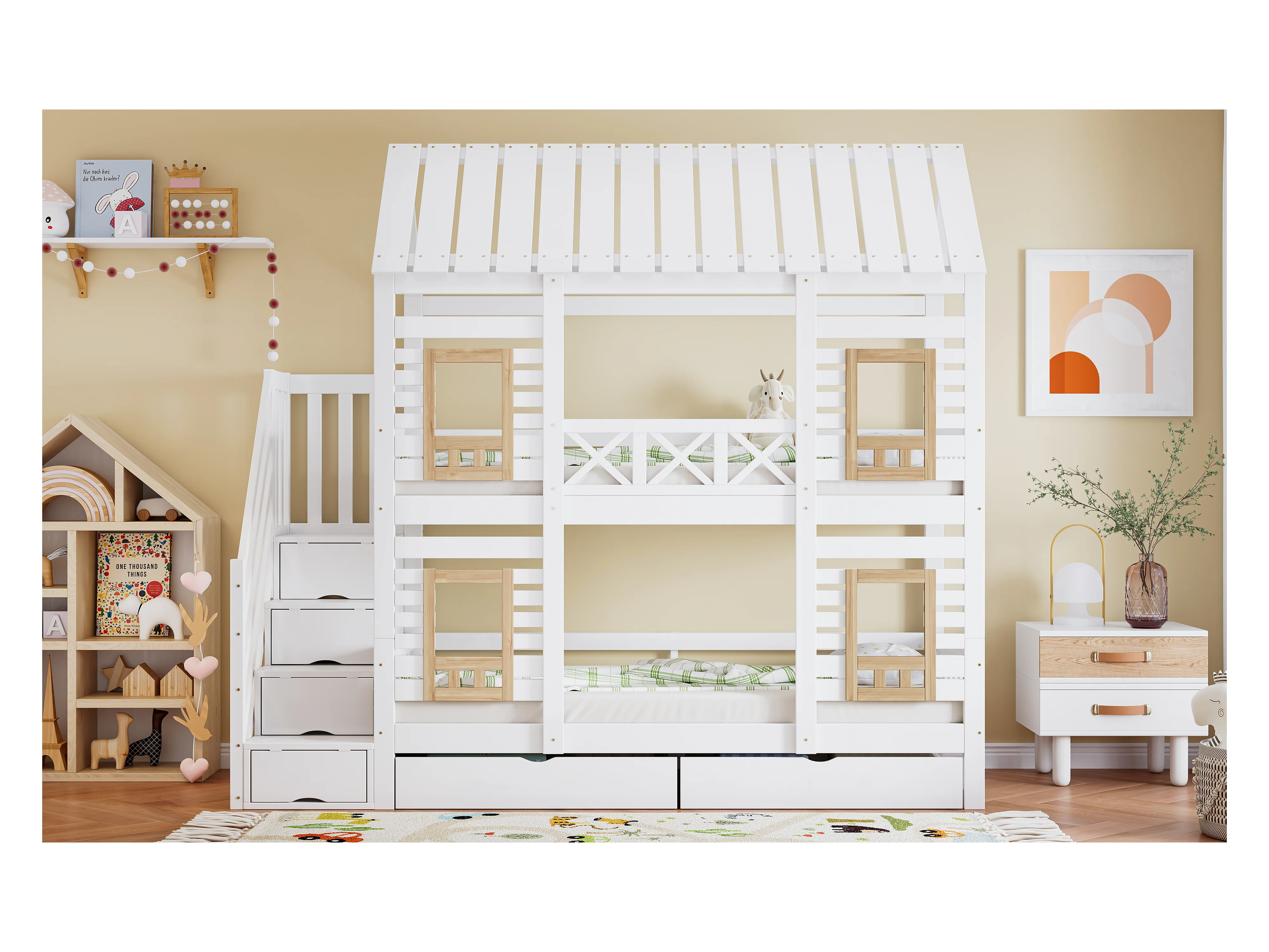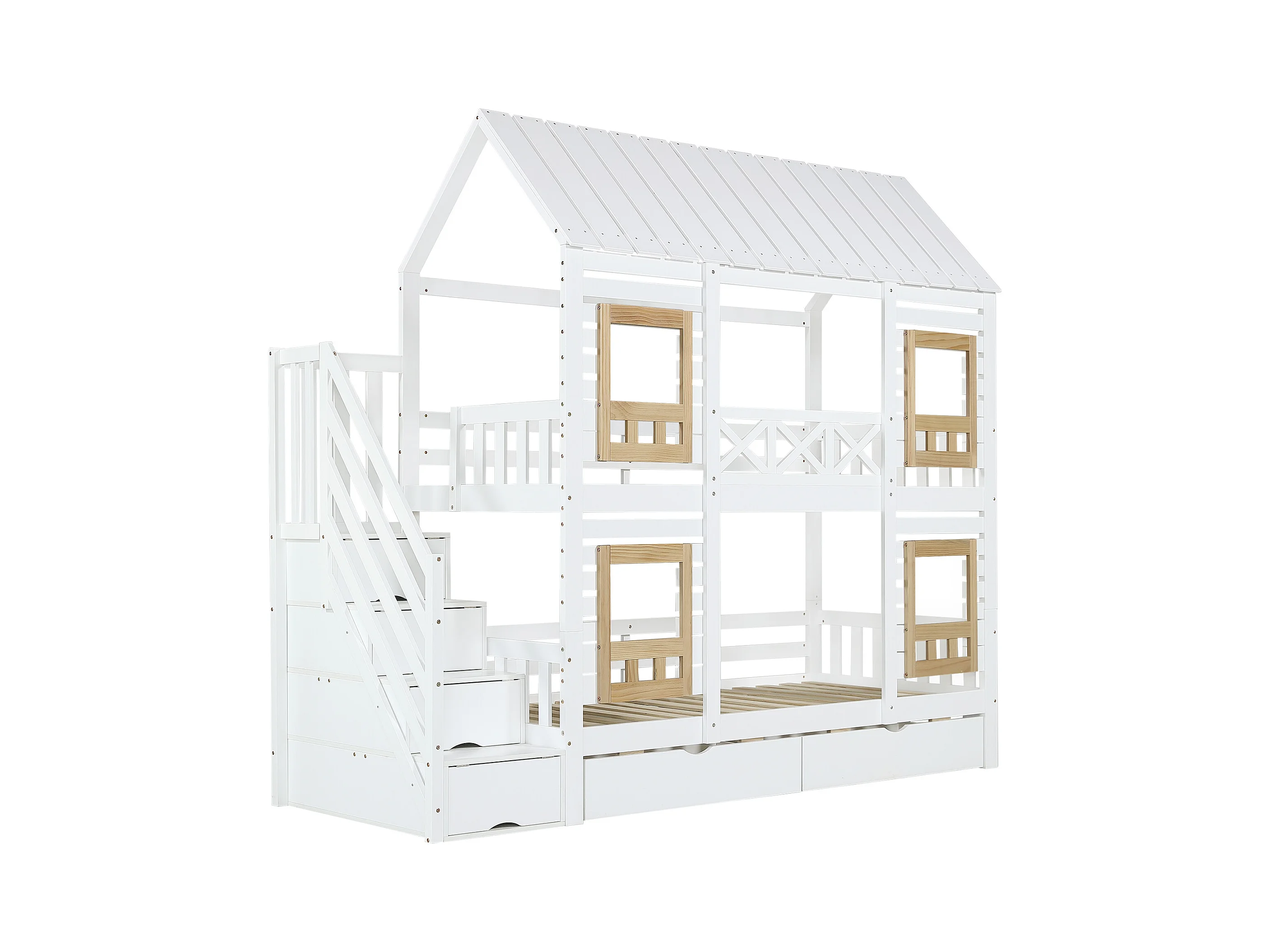Etagenbett 2 x 90 x 200 cm mit 2 Schubladen und 4 Staufächern - Kiefer + MDF - für Kinder - Weiß + Natur