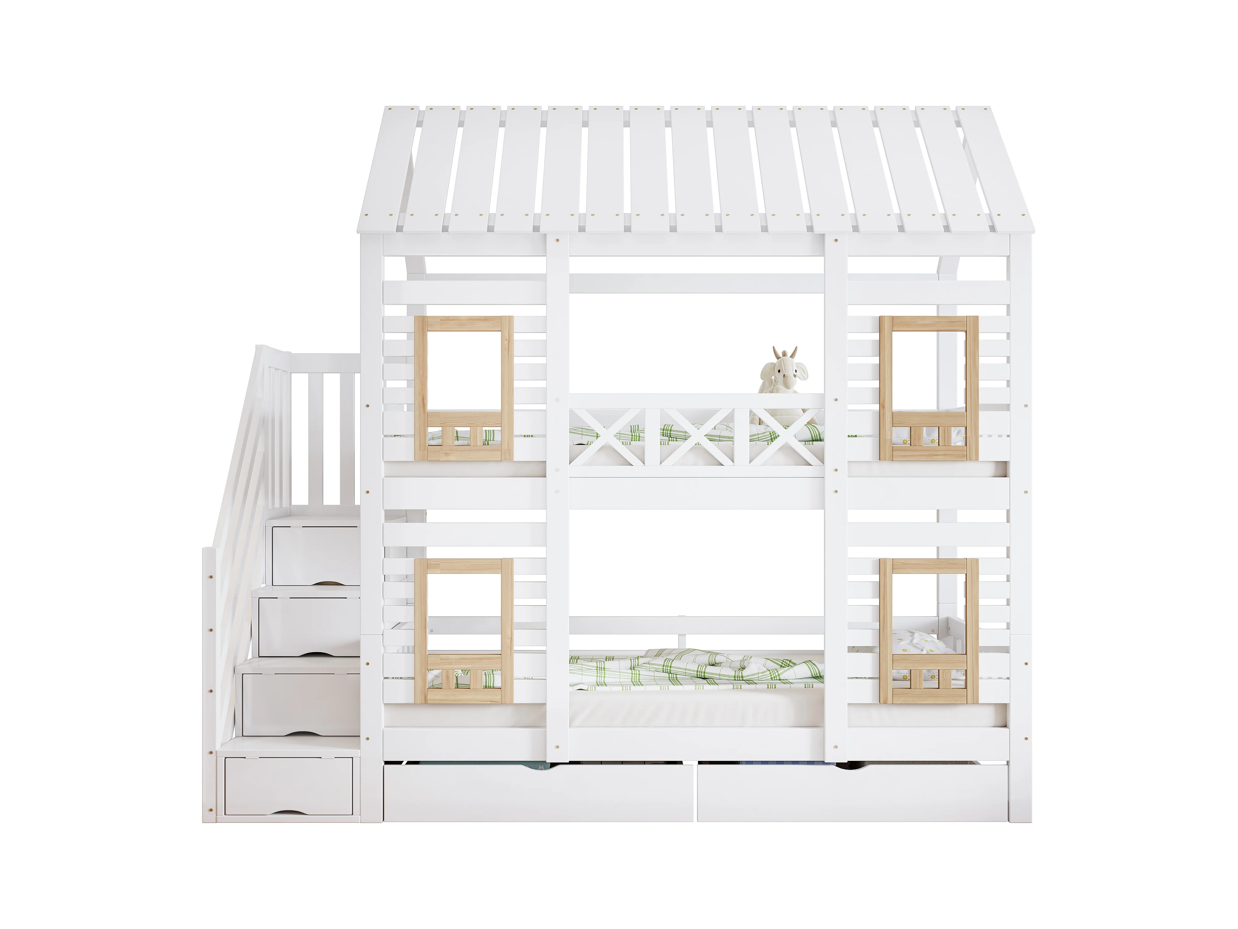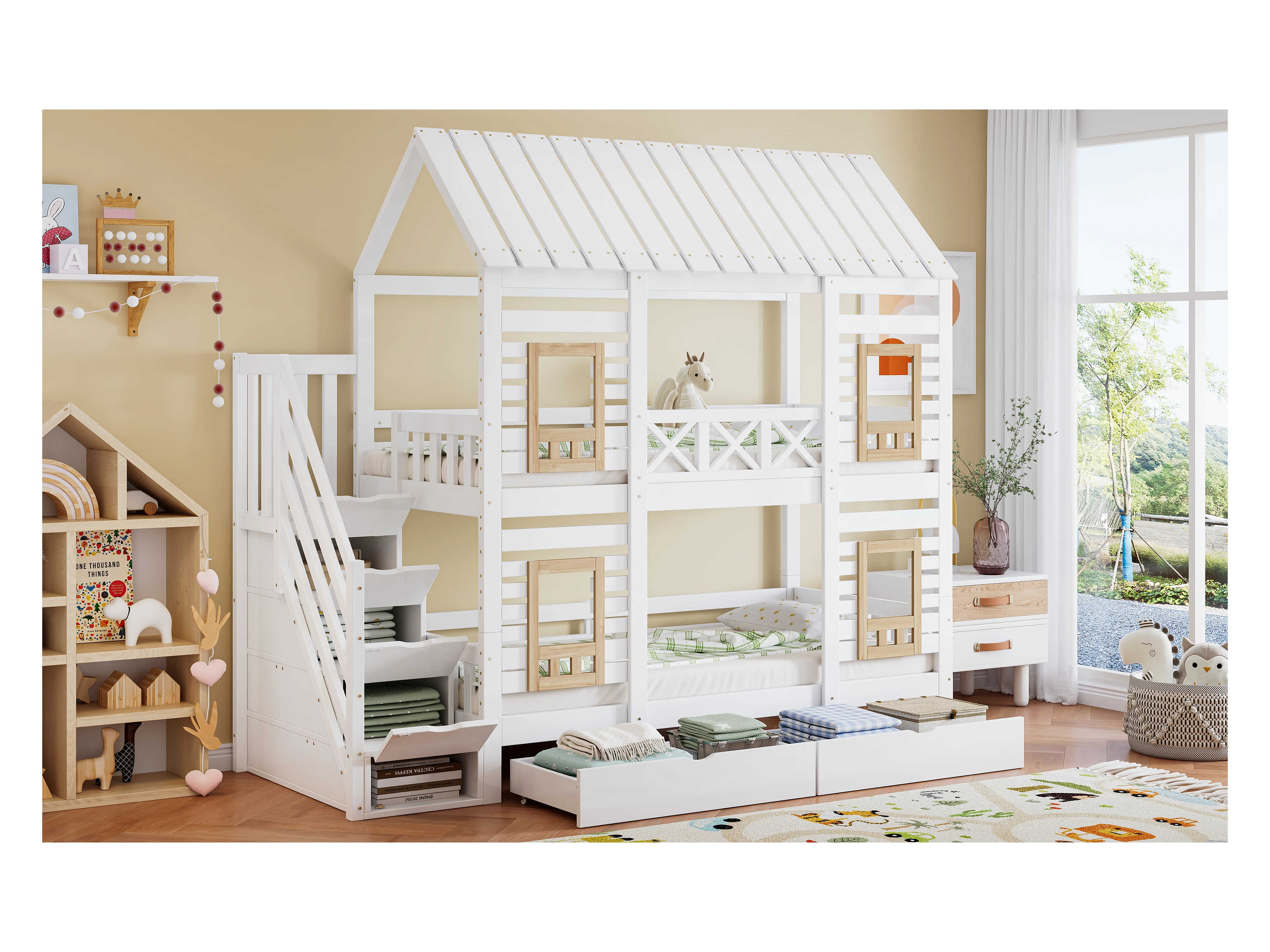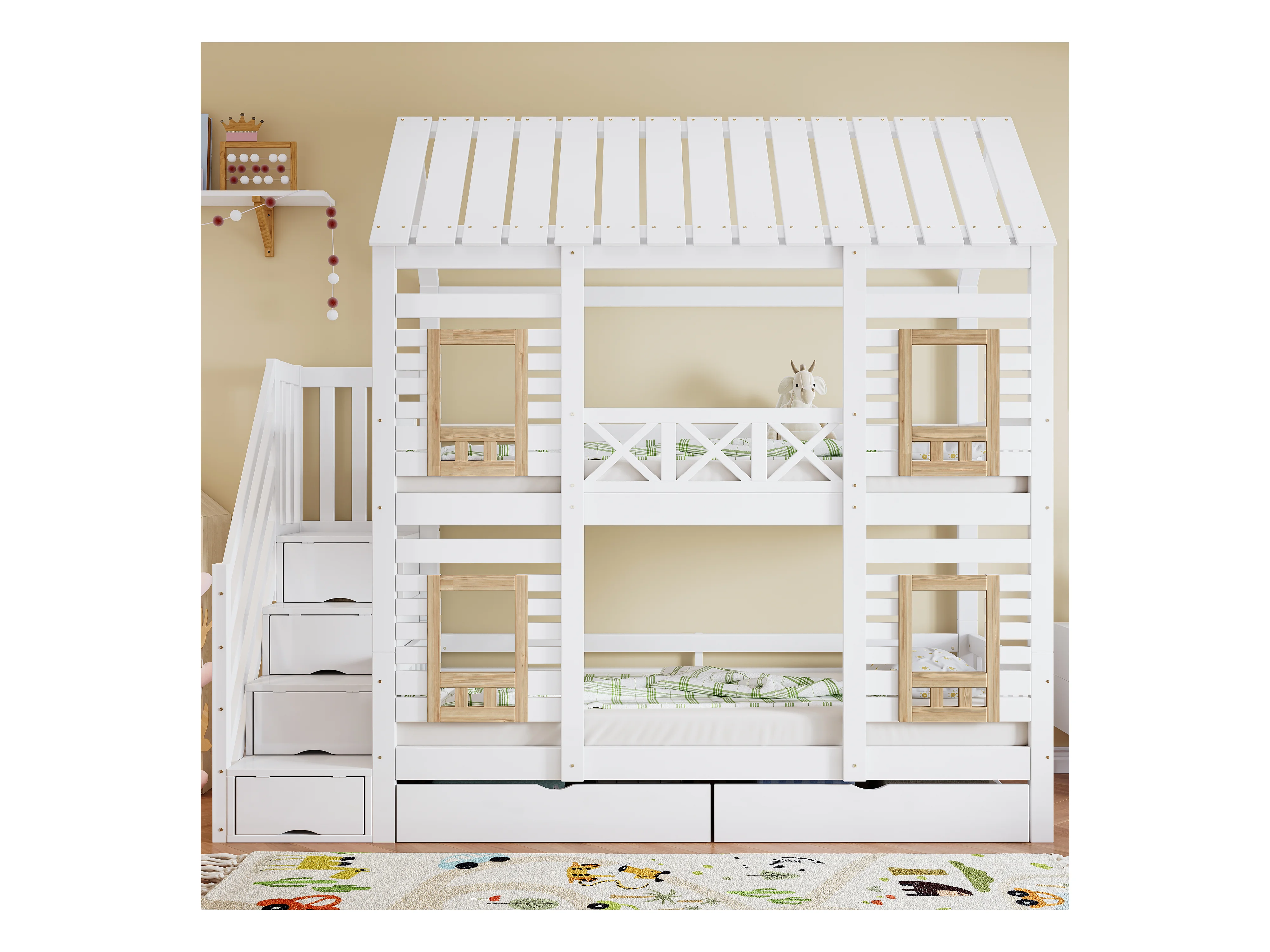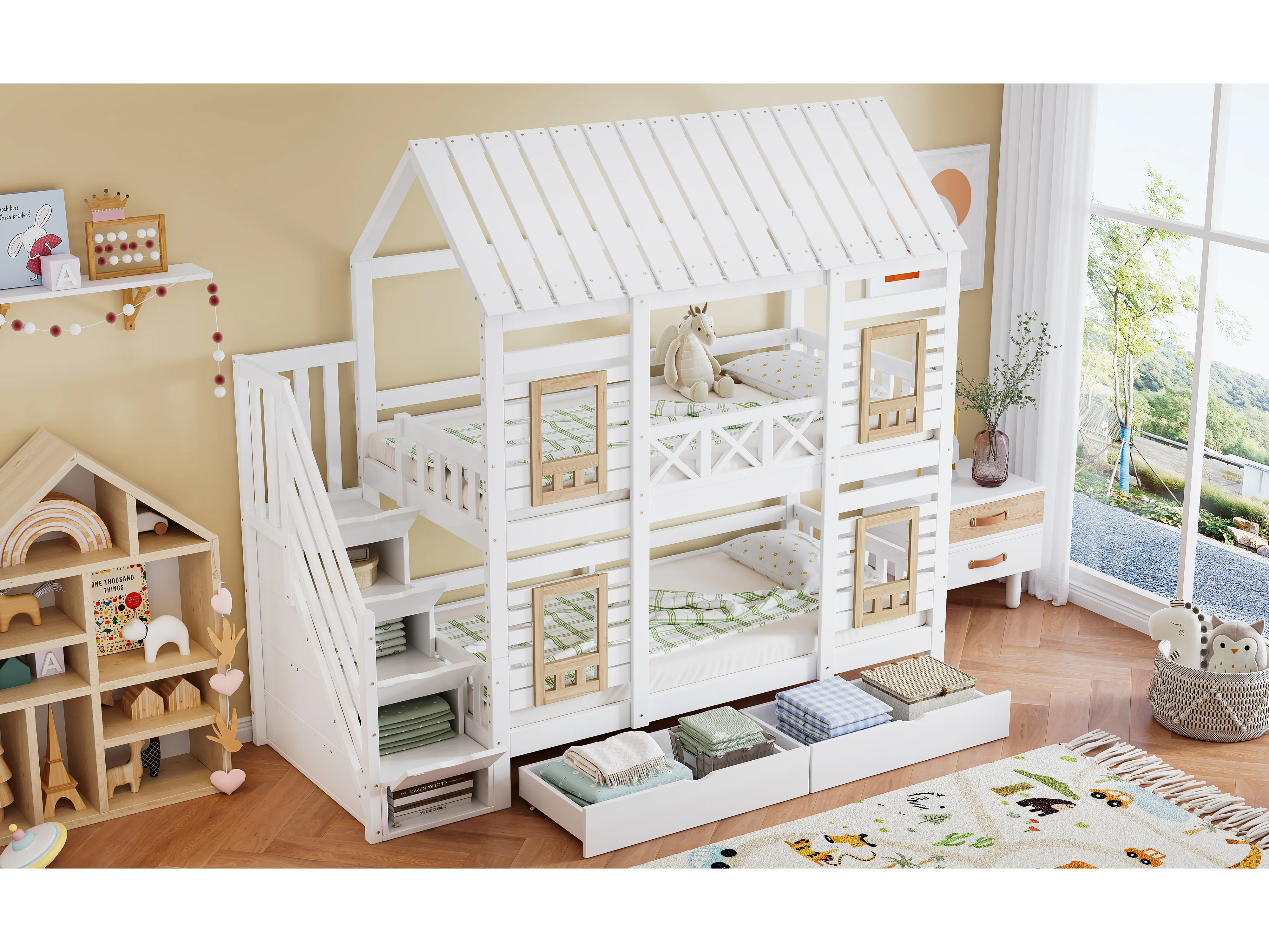 Etagenbett 2 x 90 x 200 cm mit 2 Schubladen und 4 Staufächern - Kiefer + MDF - für Kinder - Weiß + Natur
