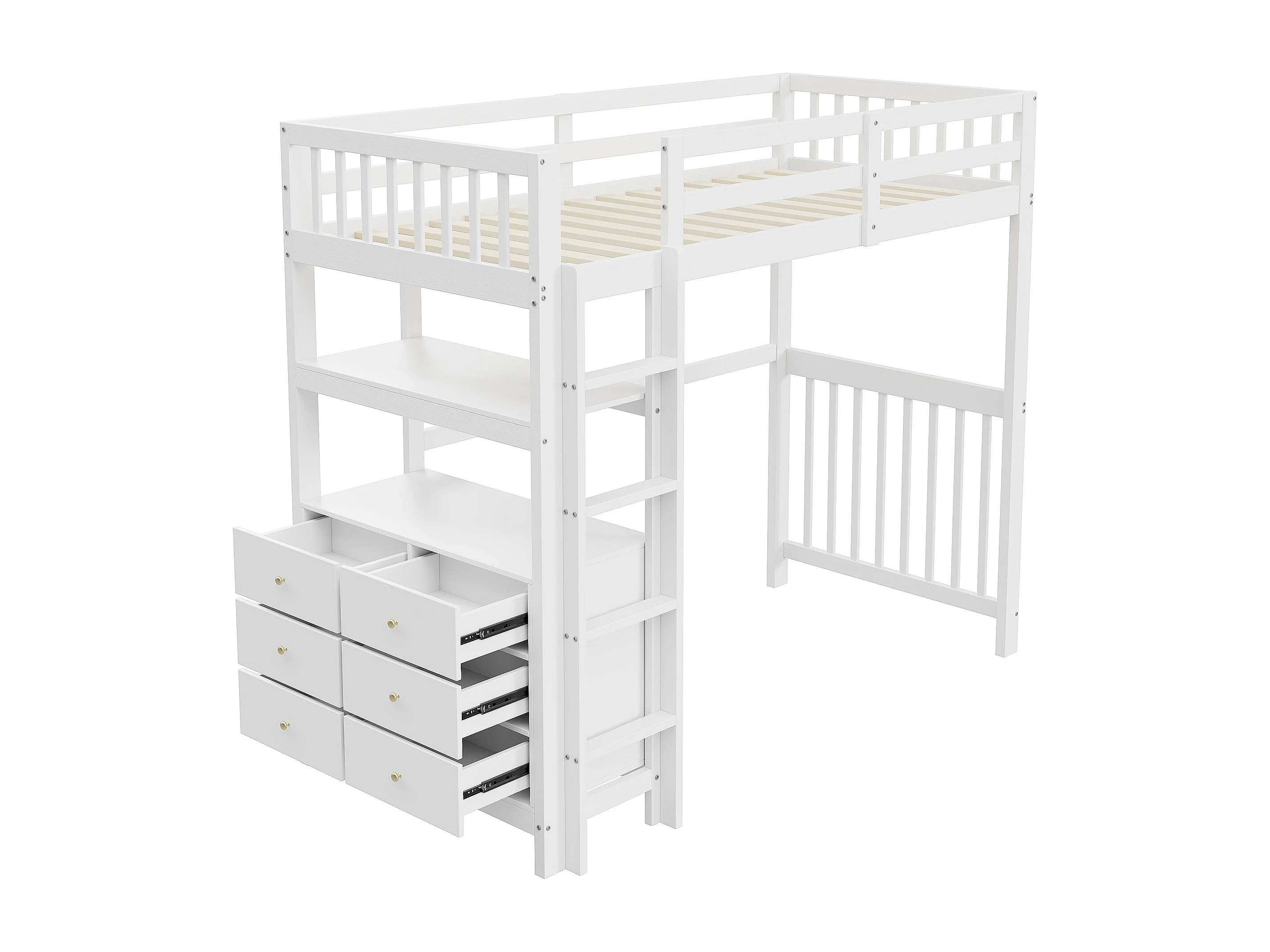 Etagenbett 90*200 cm, vertikale Sicherheitsleiter, Schubladen und Regale, high fence design, weiß.