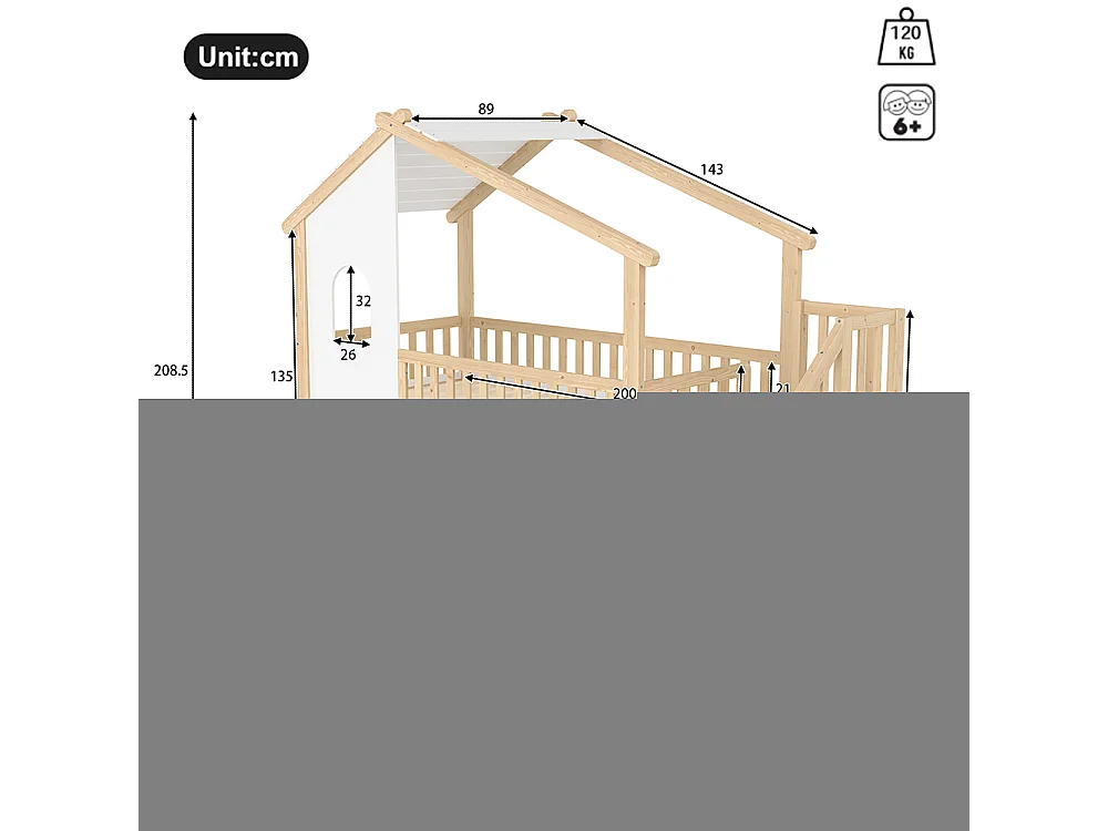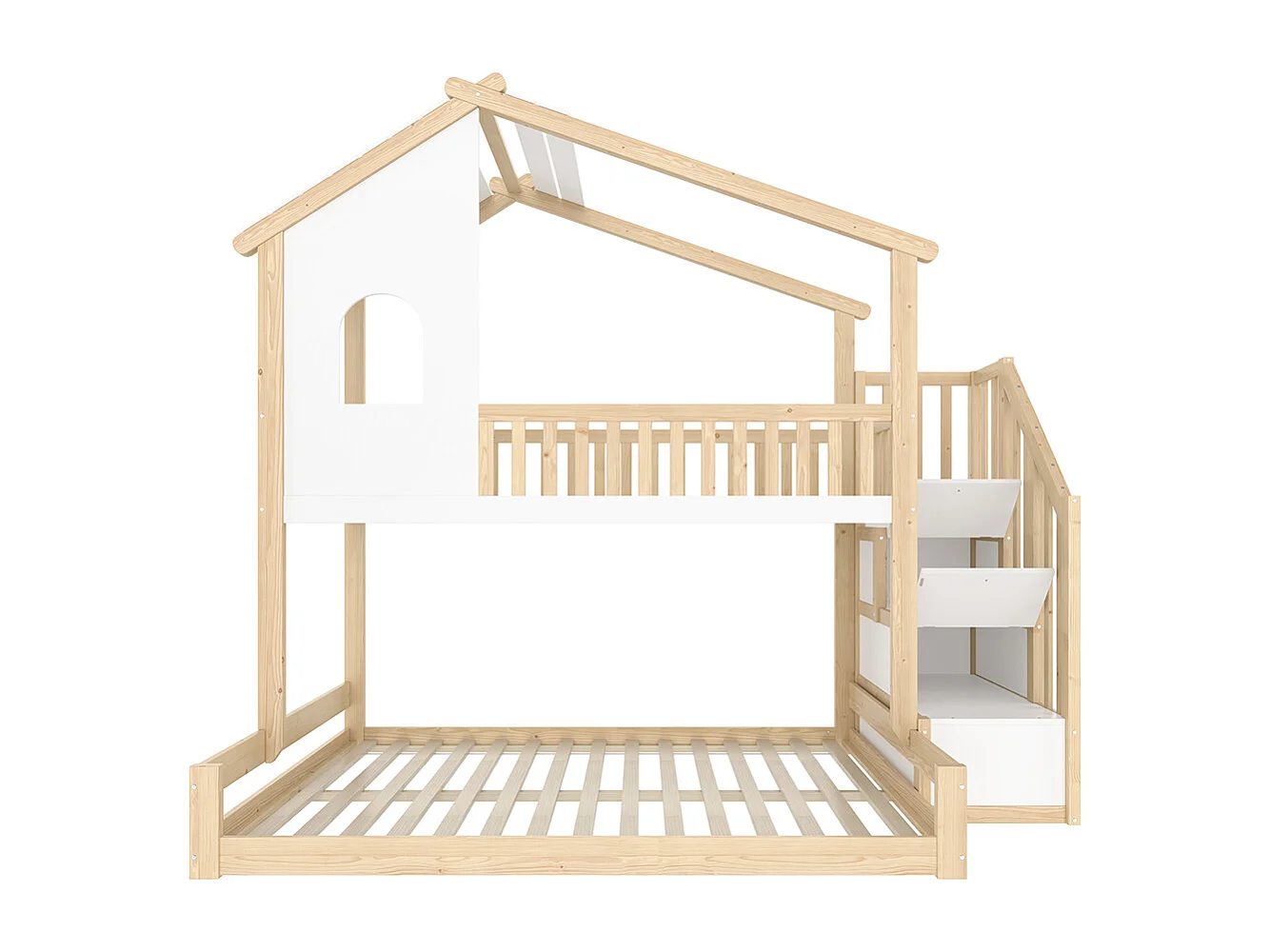 Etagenbett, 90 x 200 cm + 140 x 200 cm, Bettgitter, Aufbewahrungsleiter, Fenster, Kopfteil, Farbe Natur + Weiß