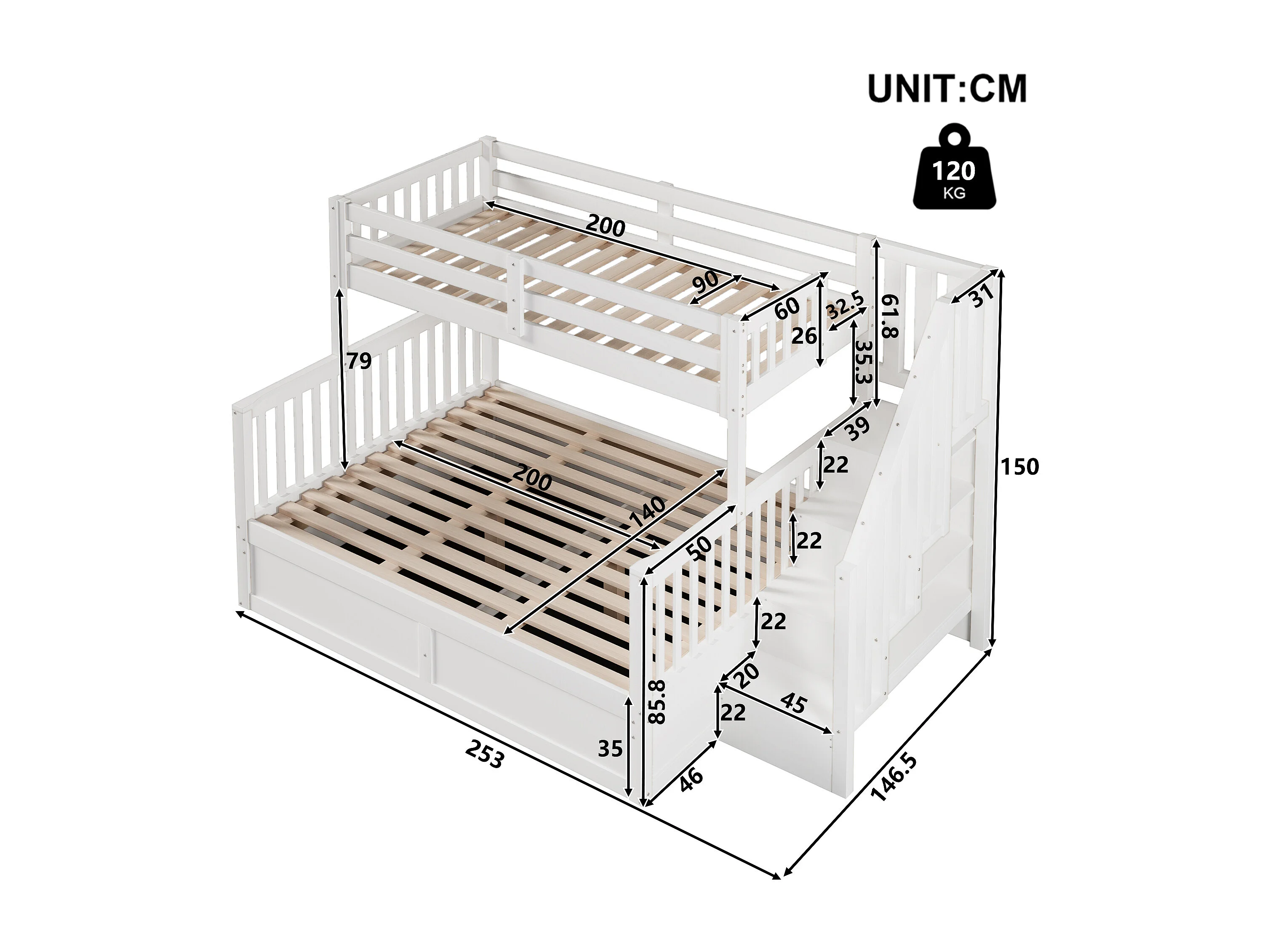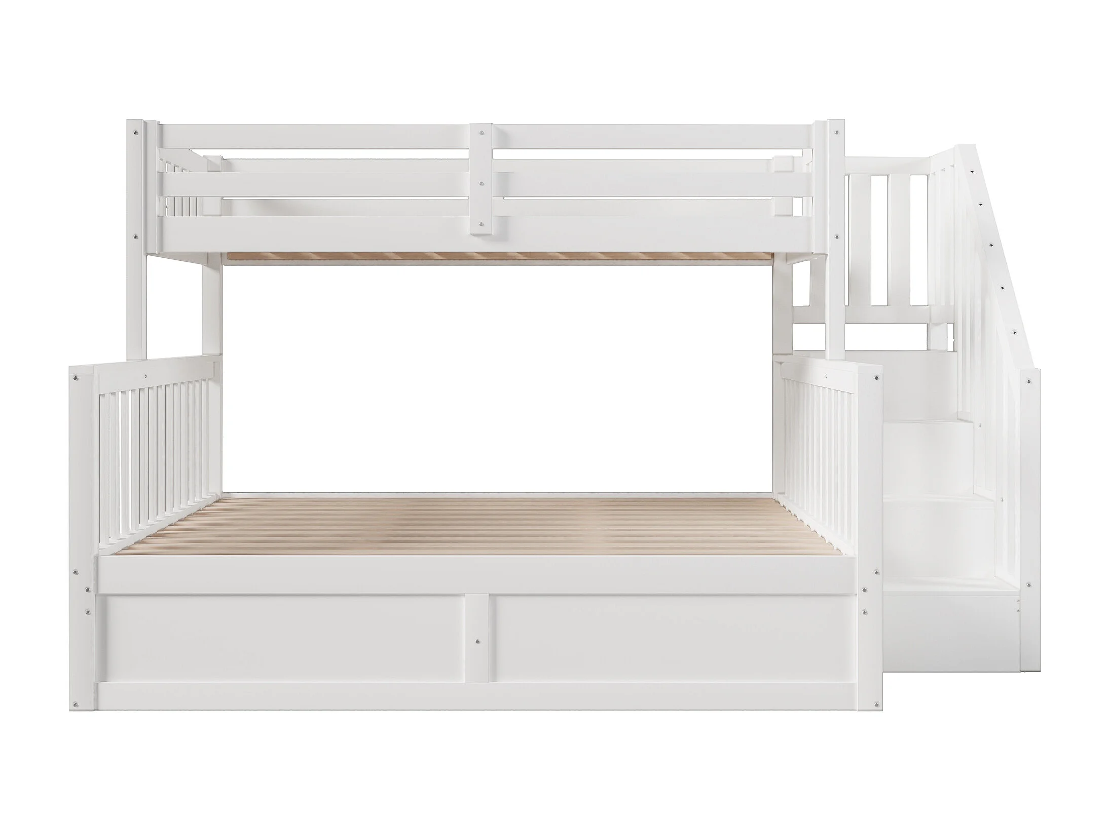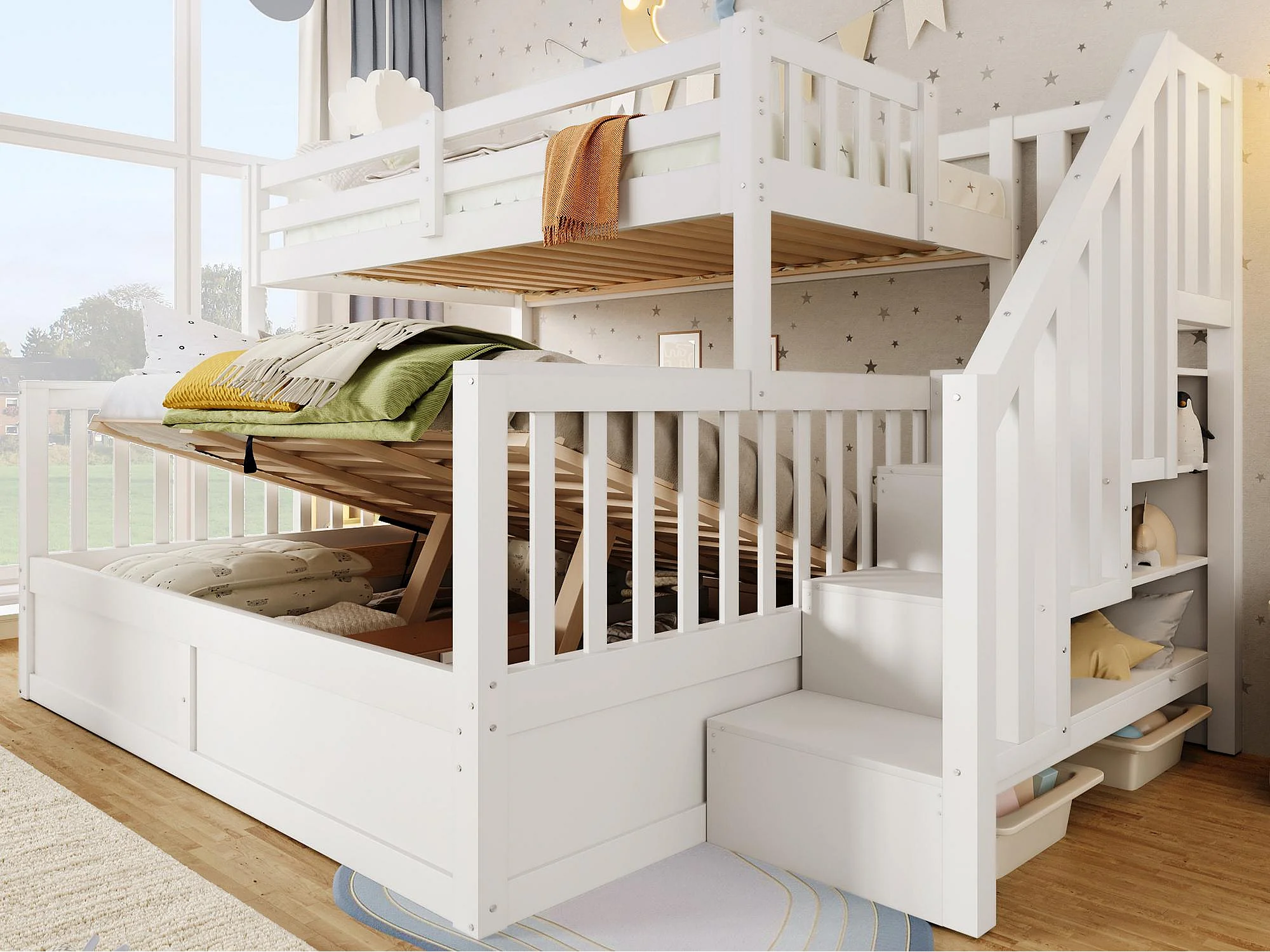 Etagenbett 90x200cm + 140x200cm - mit Leiter - mit Stauraum - weiß​ (Matratze nicht inbegriffen)
