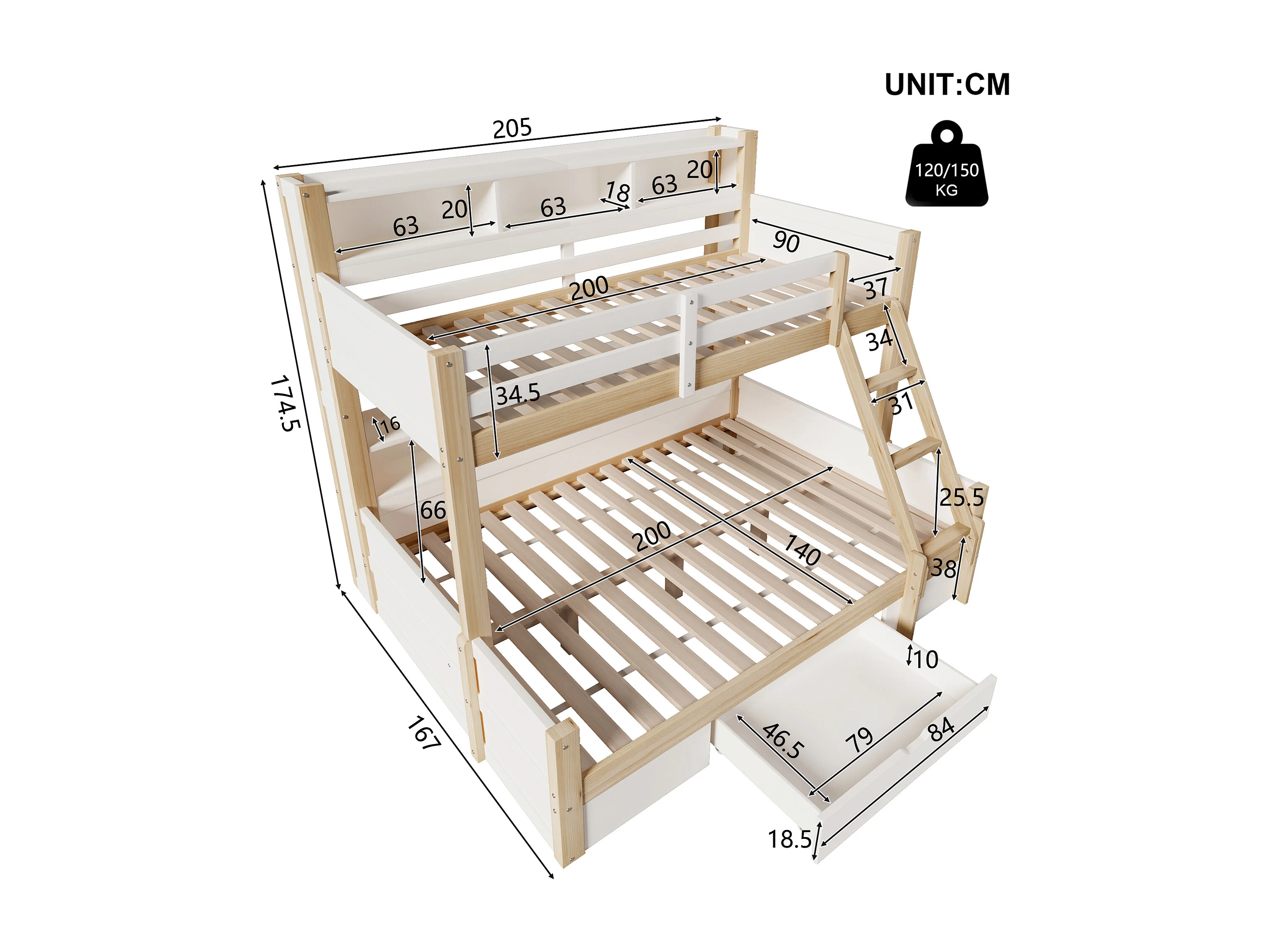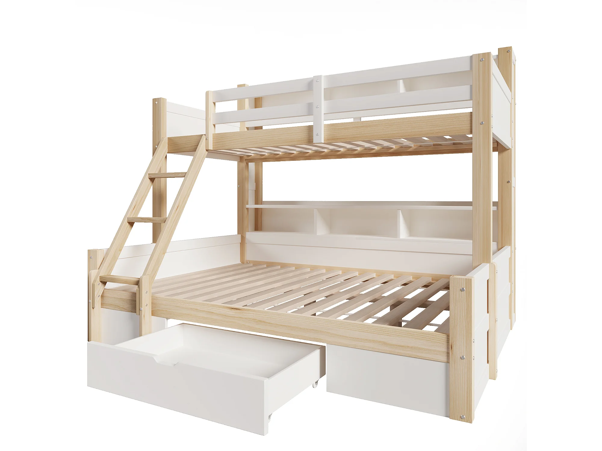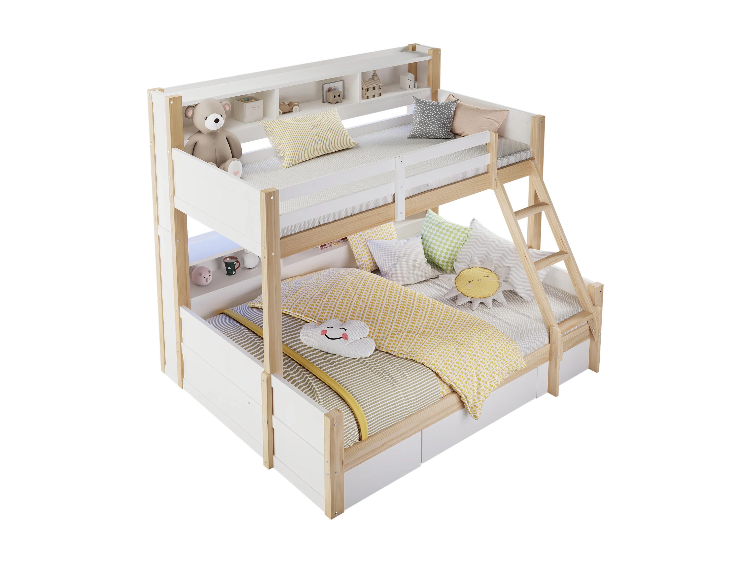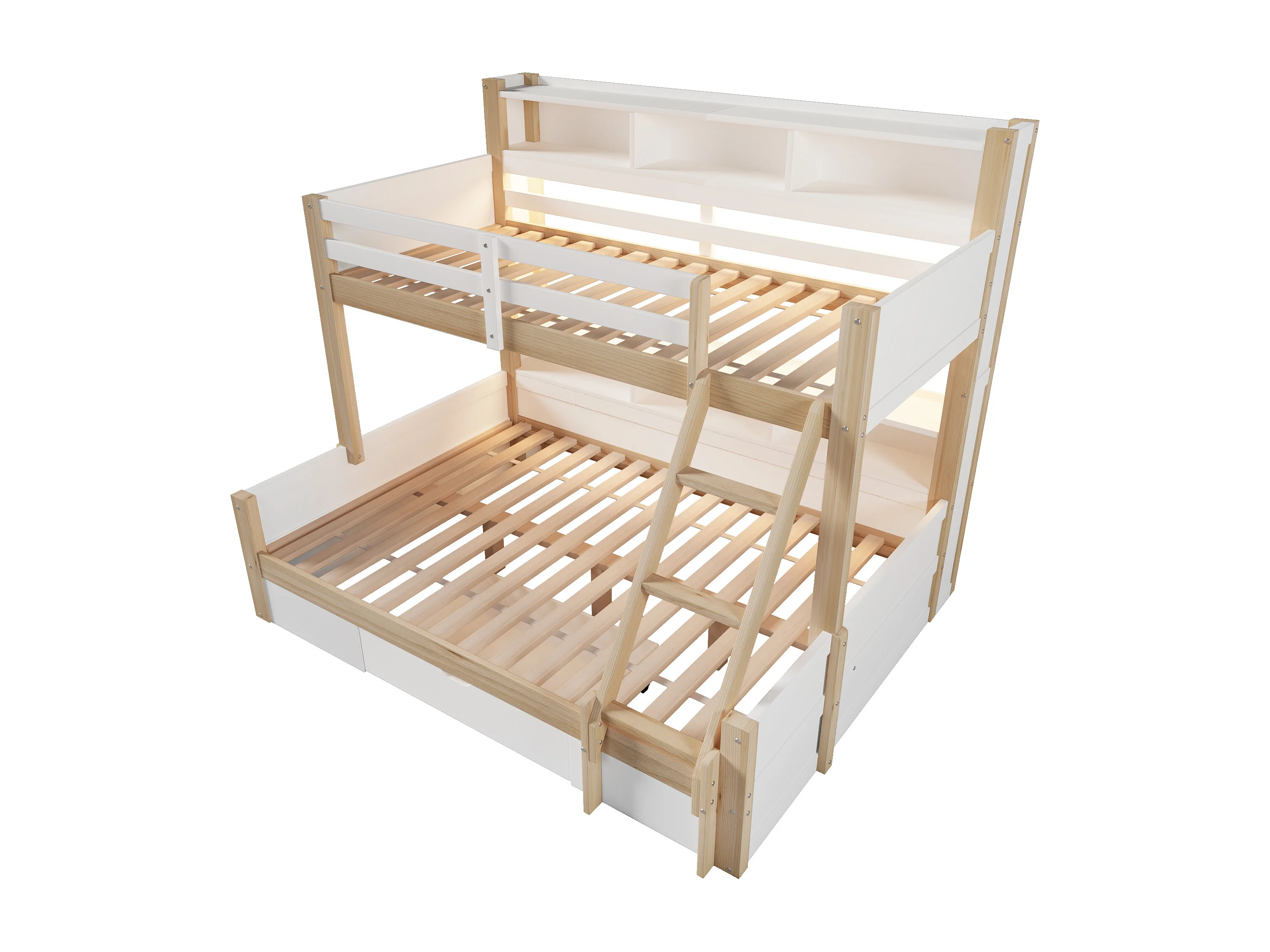 Etagenbett 90x200cm + 140x200cm - mit Leiter und Sicherheitsgitter - 1 Schublade - LED-Beleuchtung - natur (Matratze nicht inbegriffen)