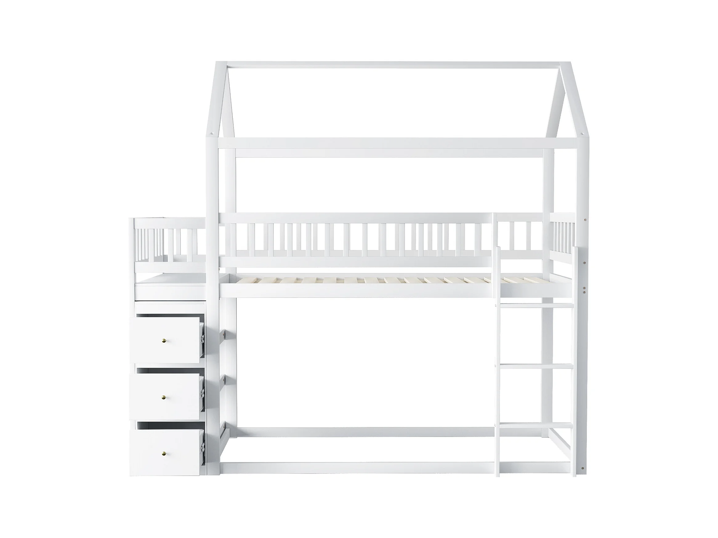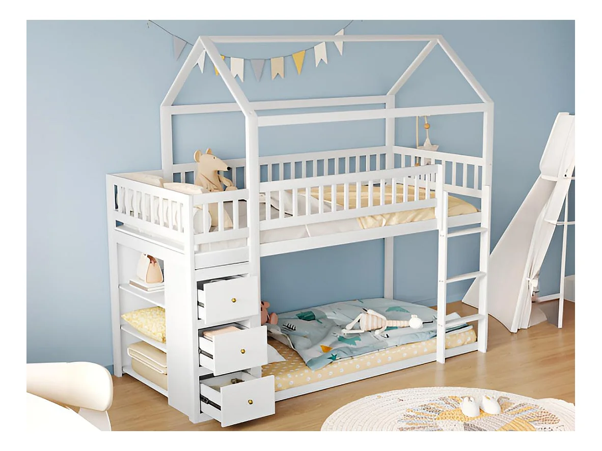 Etagenbett 90x200cm aus Massivholz – mit Schubladen + Regalen – Weiß