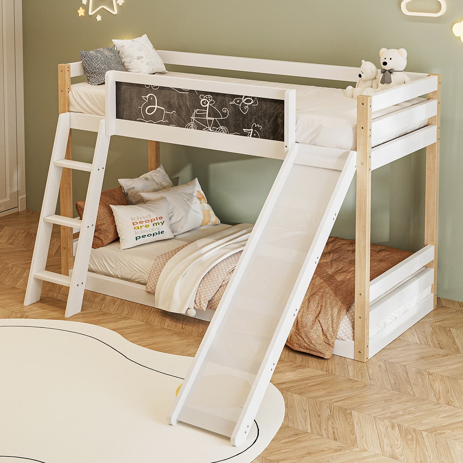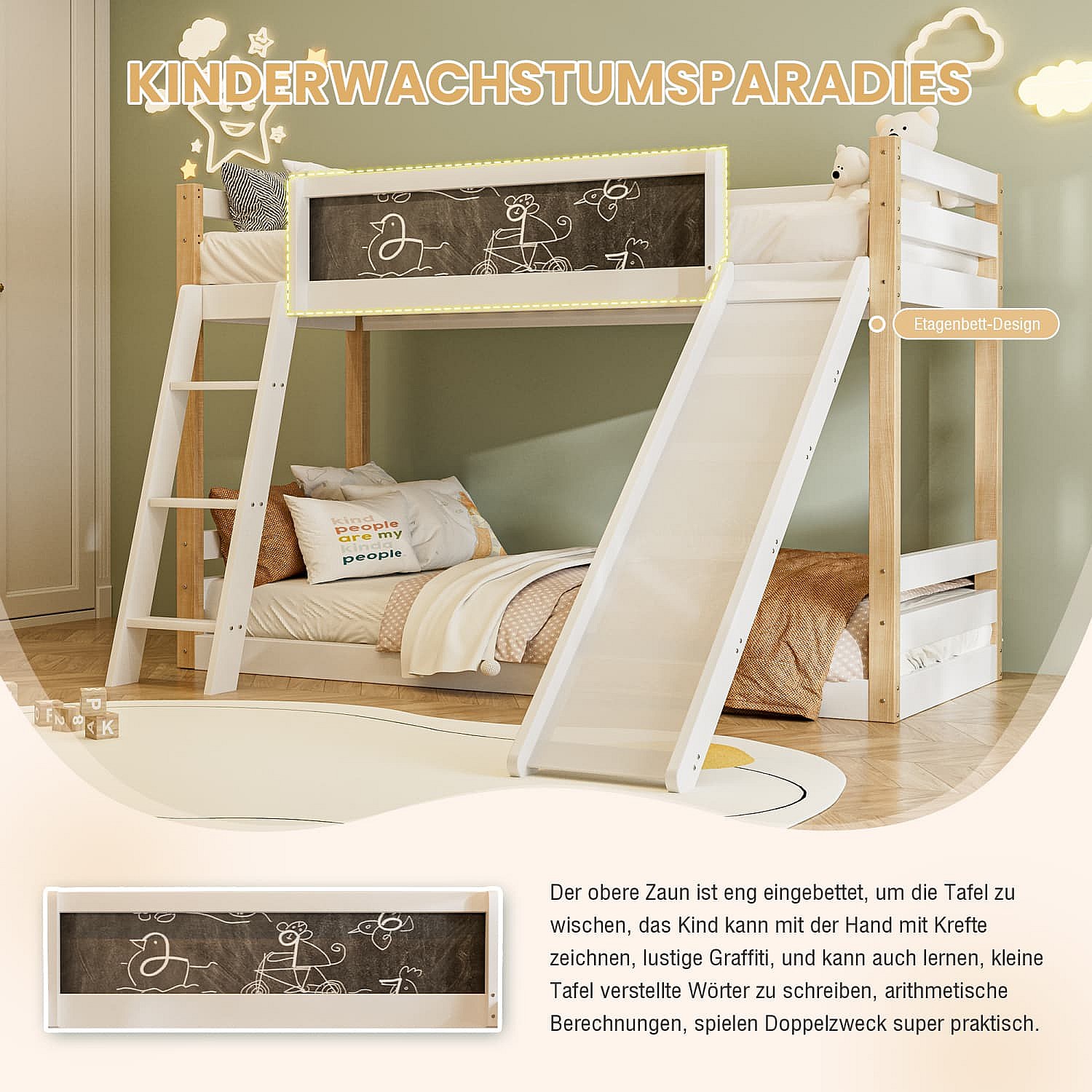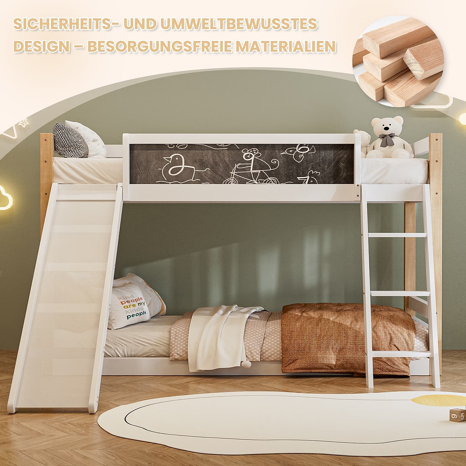 Etagenbett für Kinder mit Rutsche & Treppe, stabilem Wood+PB-Rahmen, 4-seitigem Schutzgitter, umweltfreundlich 747-zertifiziert,90×200+90×190 cm
