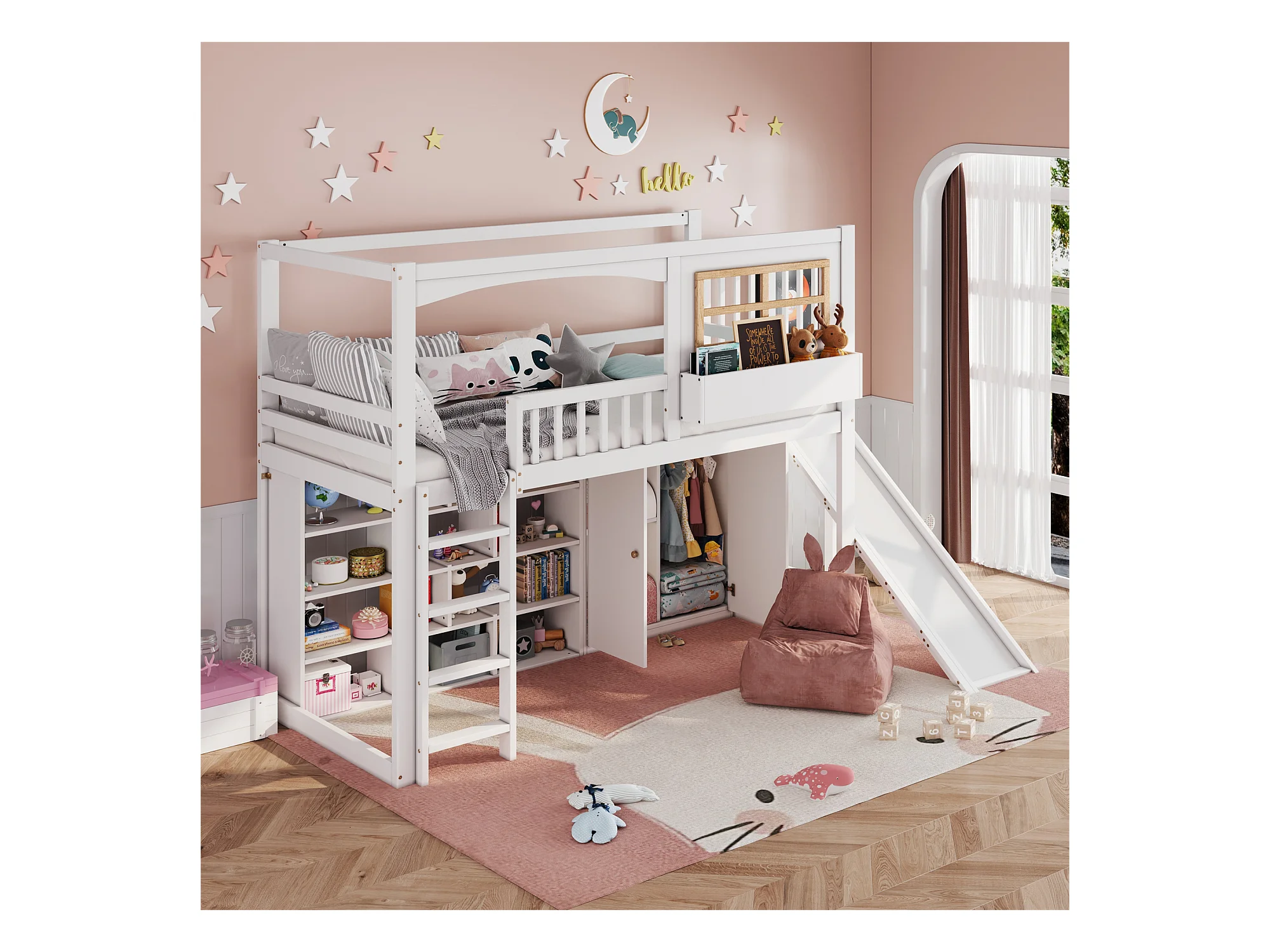 Etagenbett, Kinderbett, mit Fallschutzgitter, mit Kinderrutsche und Kleiderschrank
