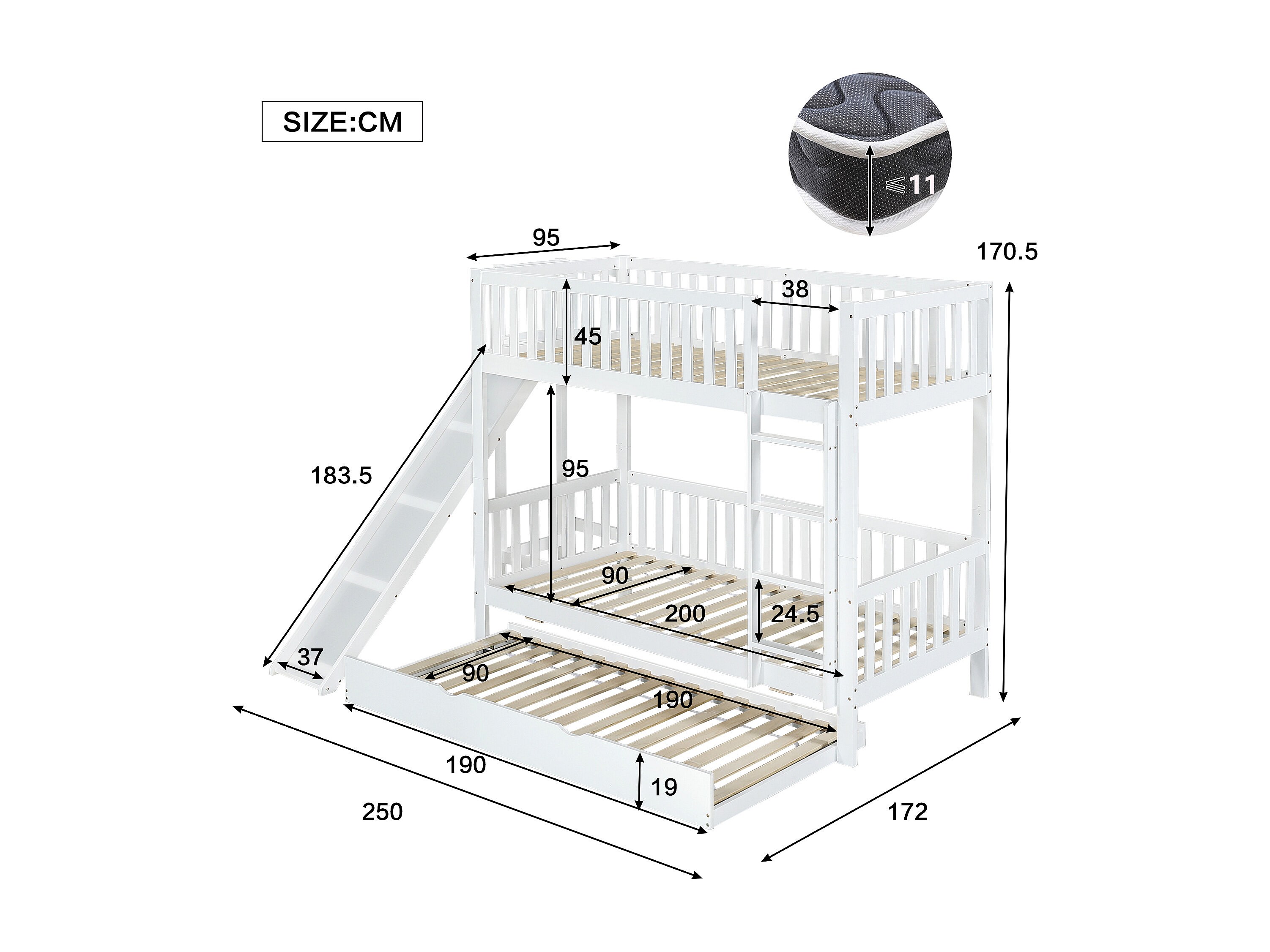 Etagenbett mit Ausziehbett 90x200/190 cm weiß, Absturzsicherung, Rutsche, Regale, 4-stufige Anlegeleiter, Kiefernholz + MDF