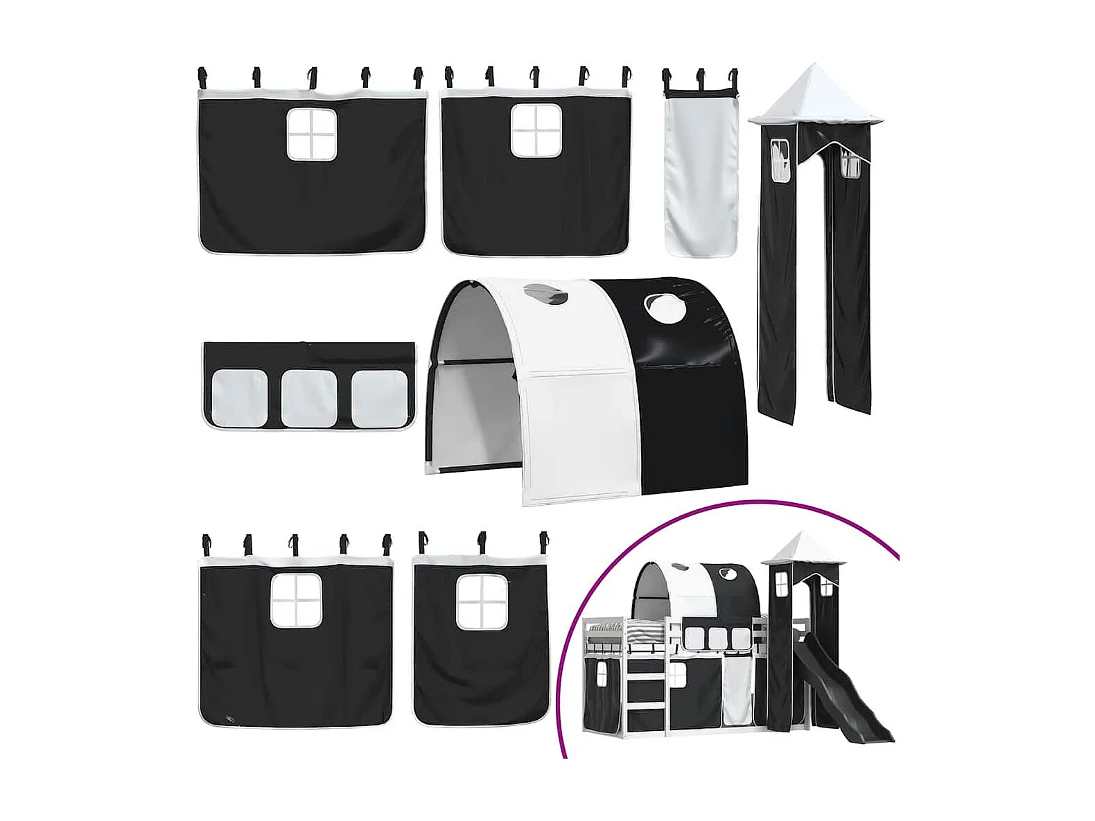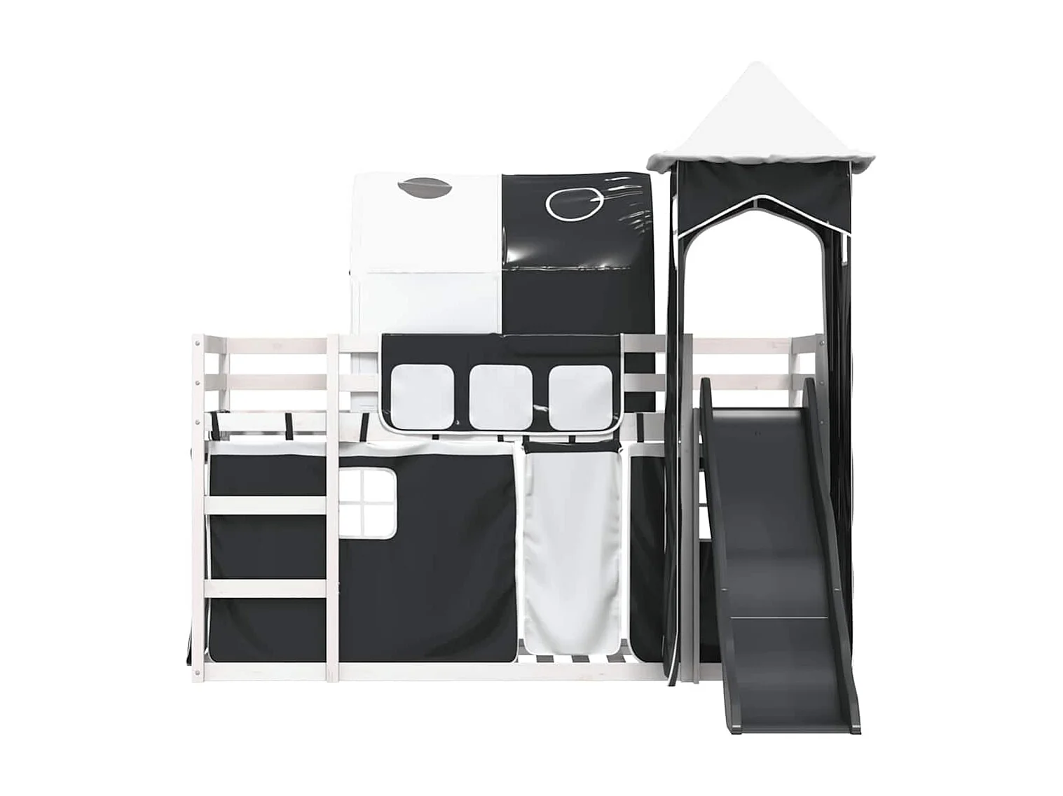 Etagenbett mit Rutsche und Gardinen Weiß und Schwarz 90x190 cm