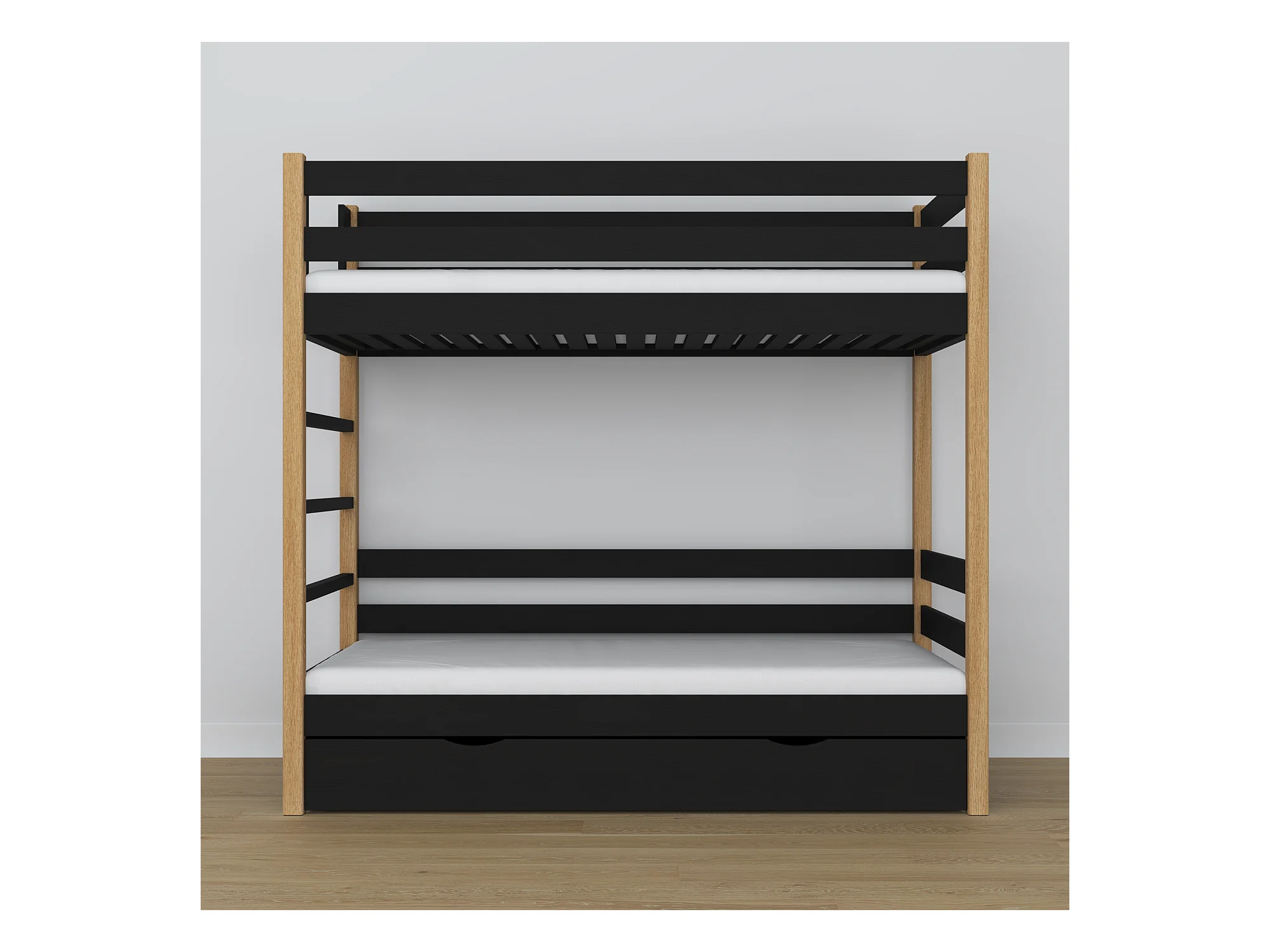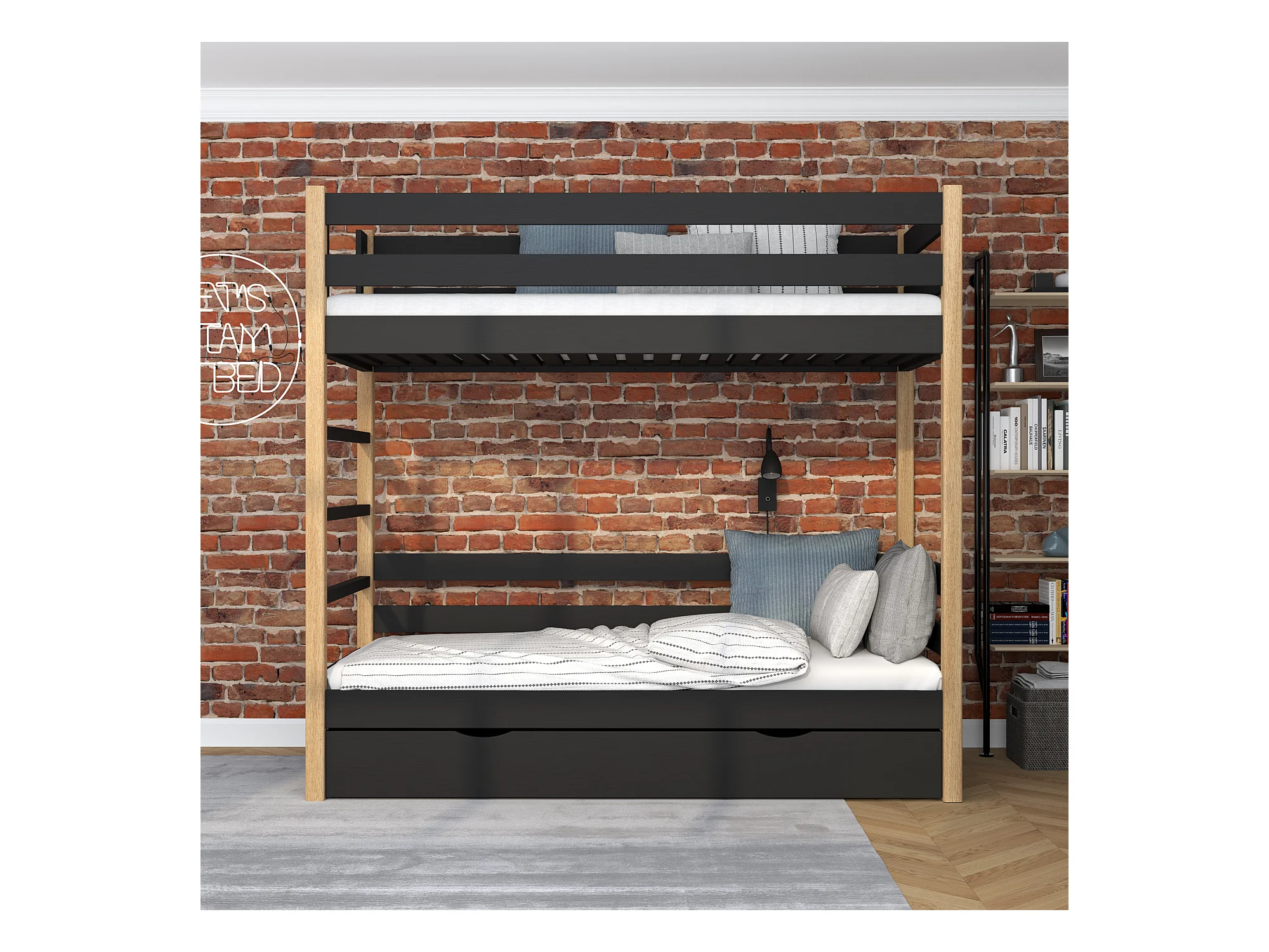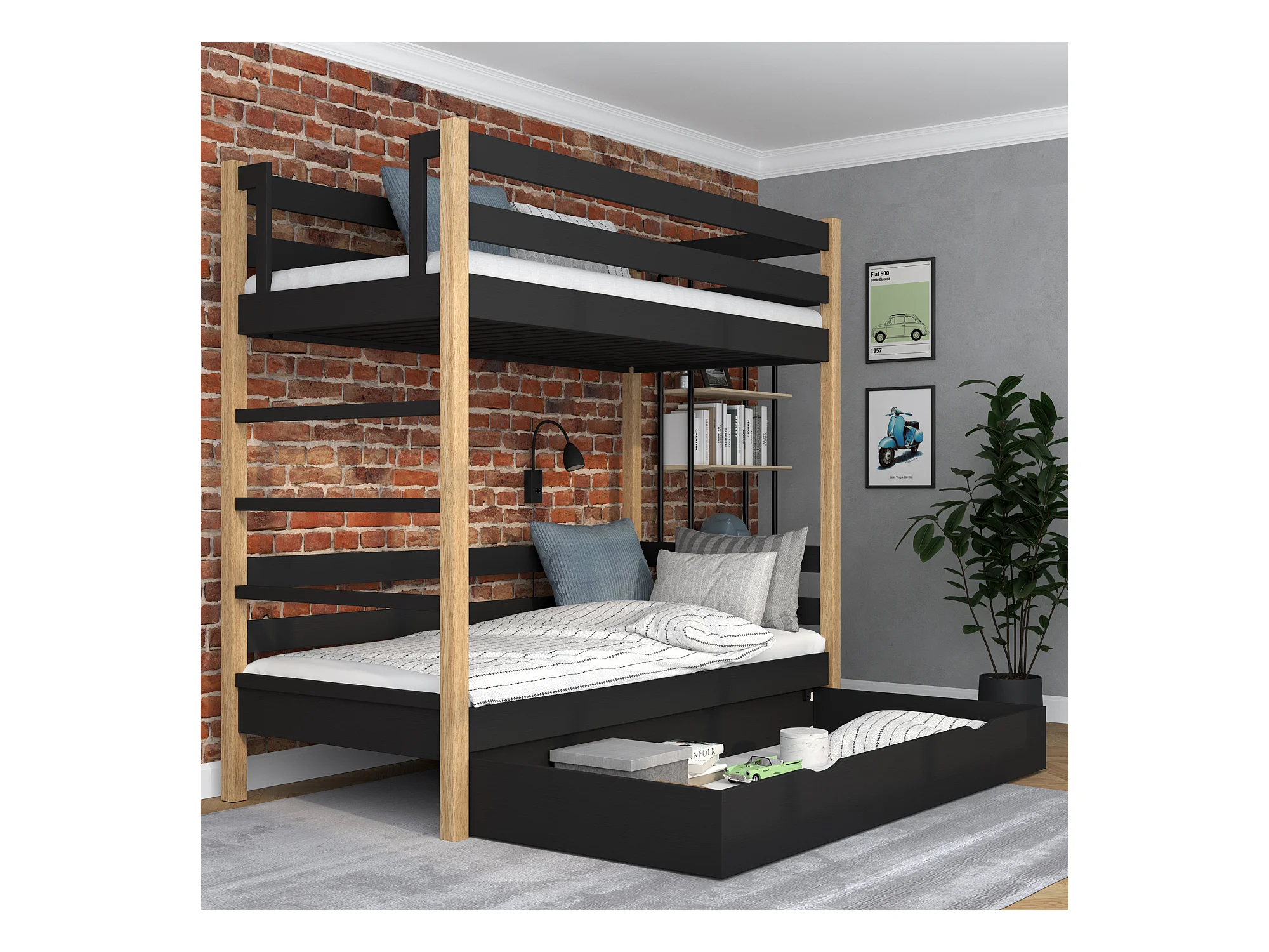 ETAGENBETT N03 mit Schublade Schwarz / Eiche Natur 120x200