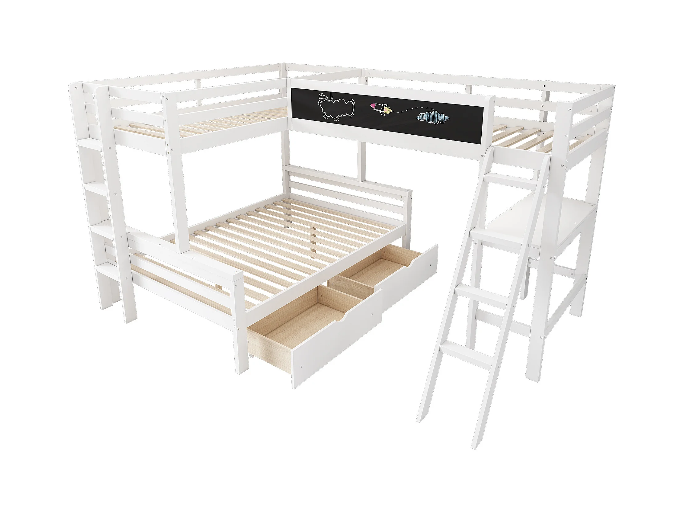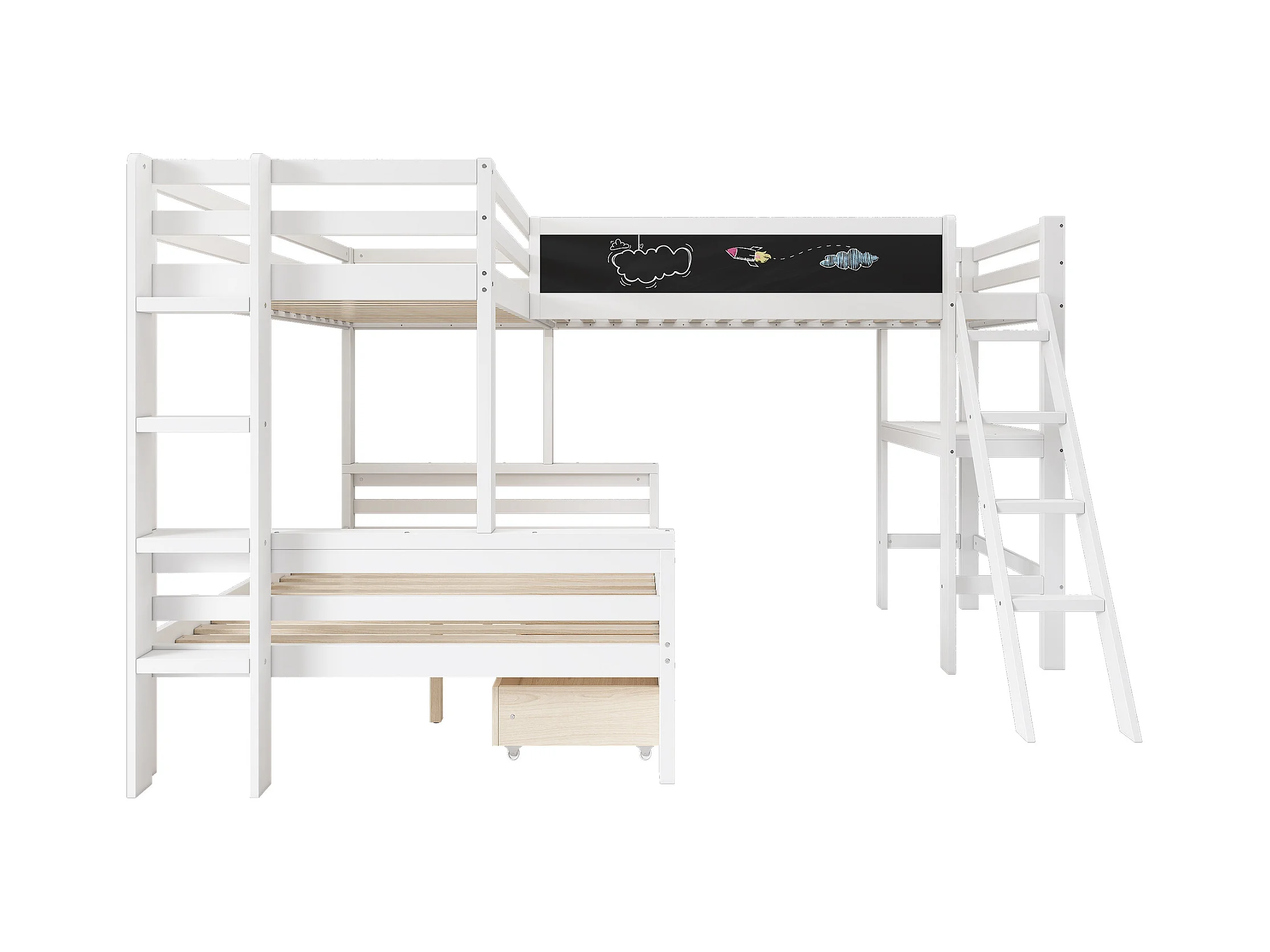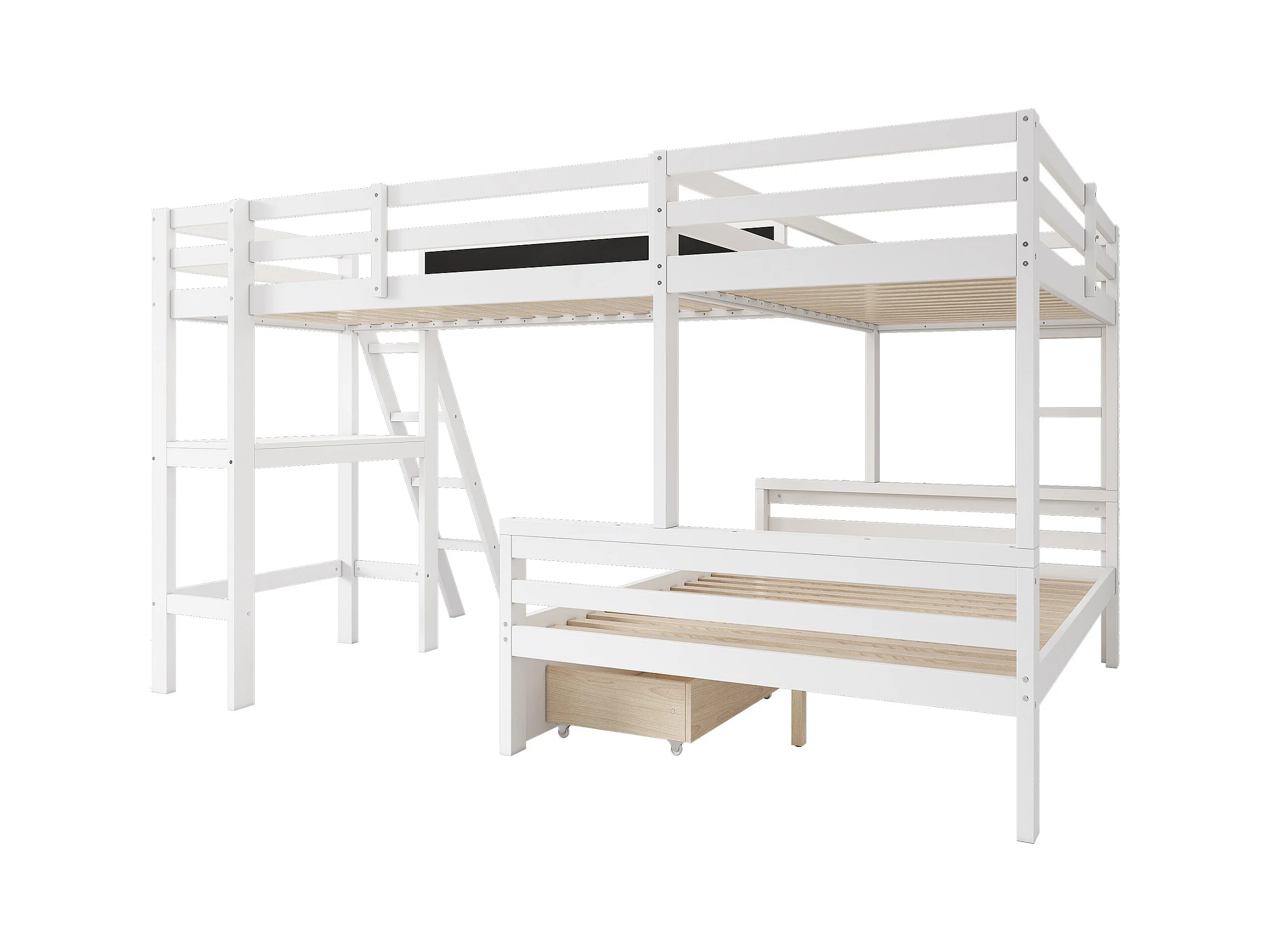 Etagenbetten 140 x 200 cm + 2 x 90 x 200 cm mit Schreibtisch und 2 Schubladen – Massivholz – Weiß (ohne Matratze)