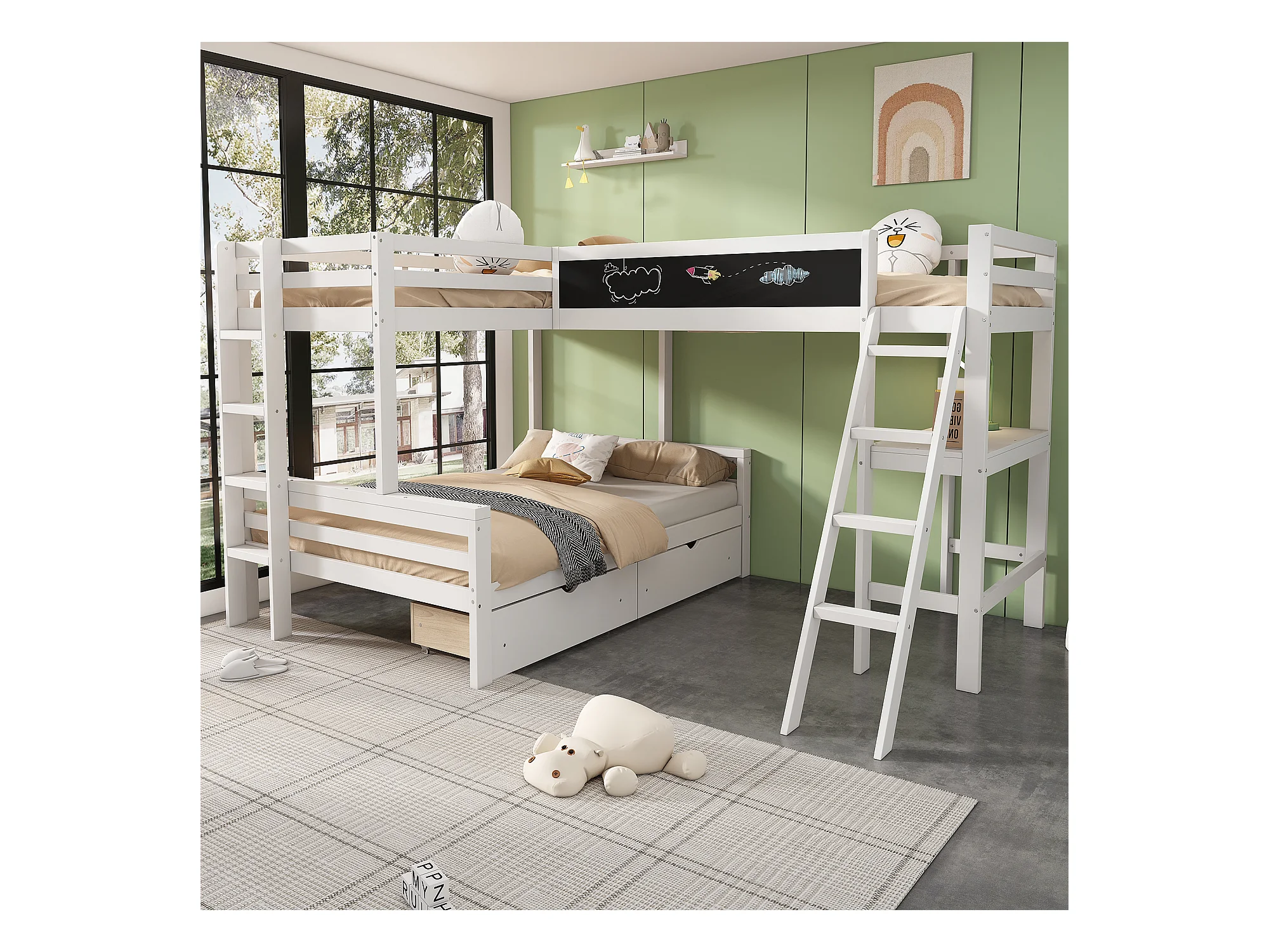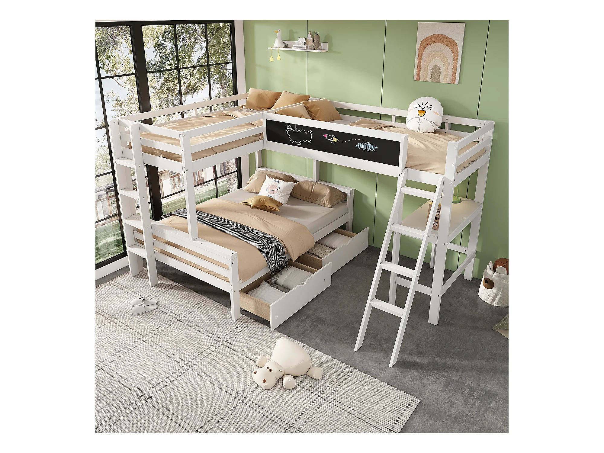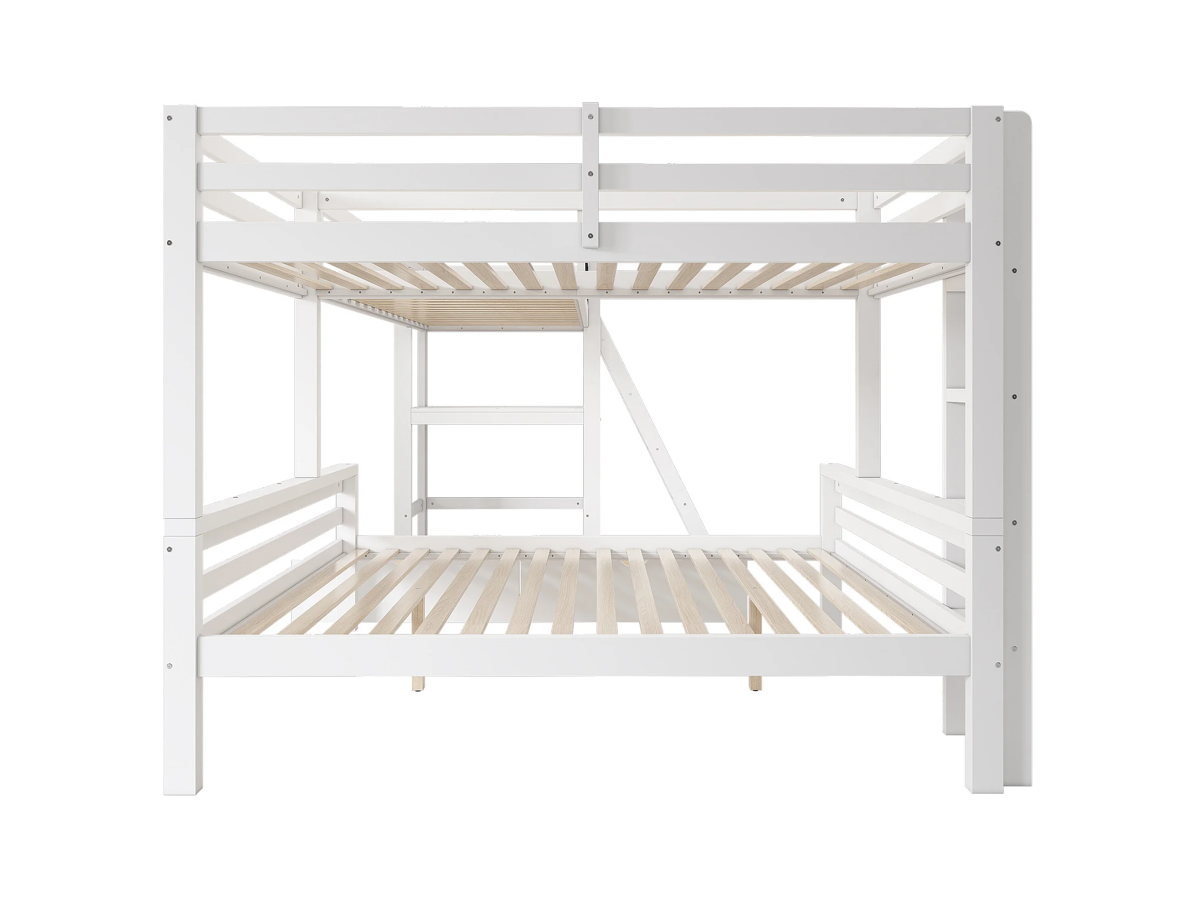 Etagenbetten 140 x 200 cm + 2 x 90 x 200 cm mit Schreibtisch und 2 Schubladen – Massivholz – Weiß (ohne Matratze)