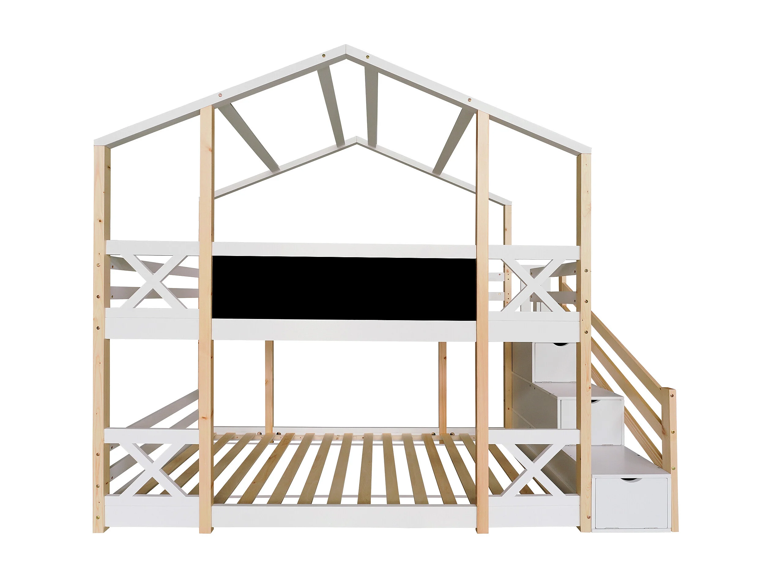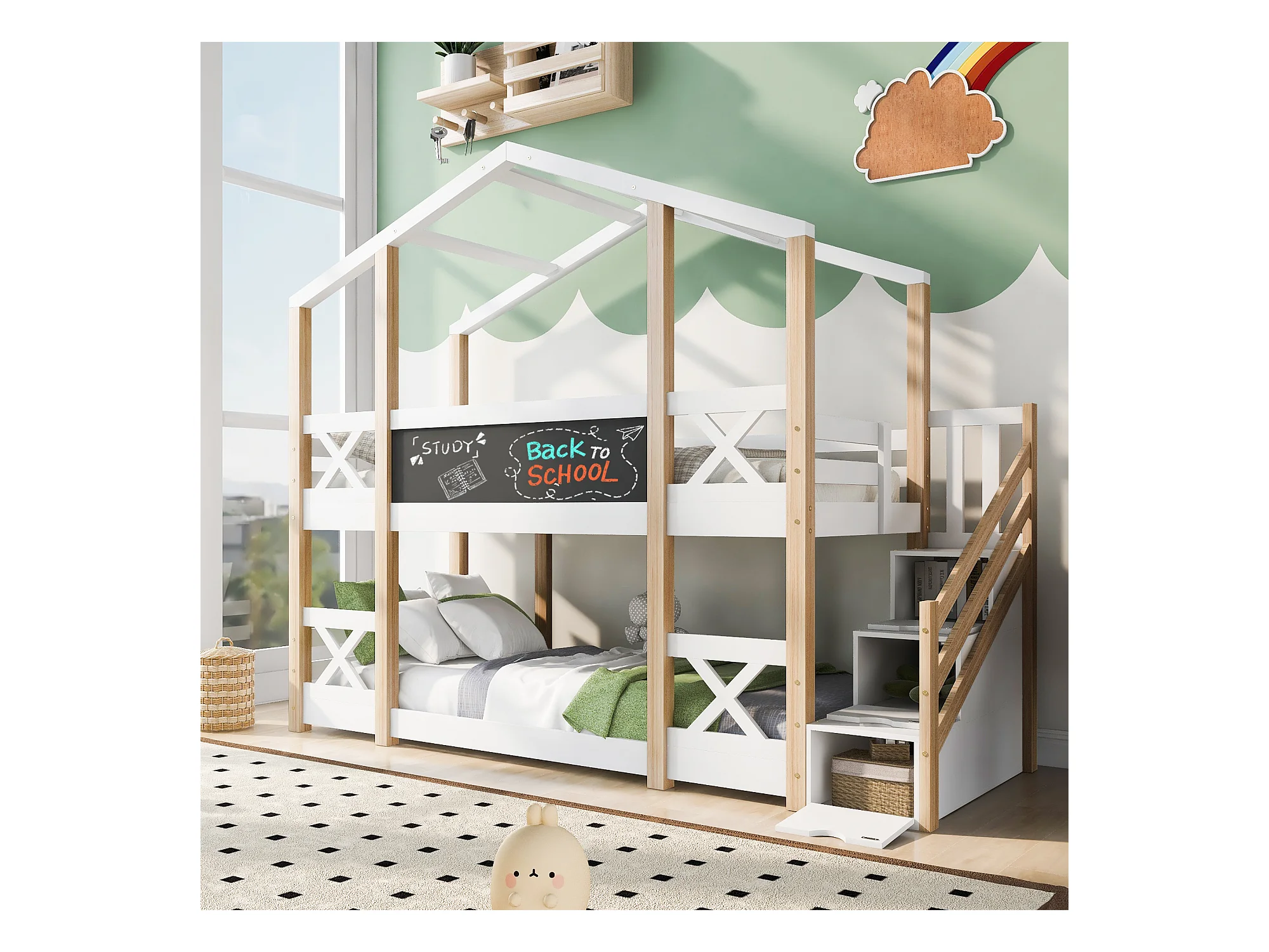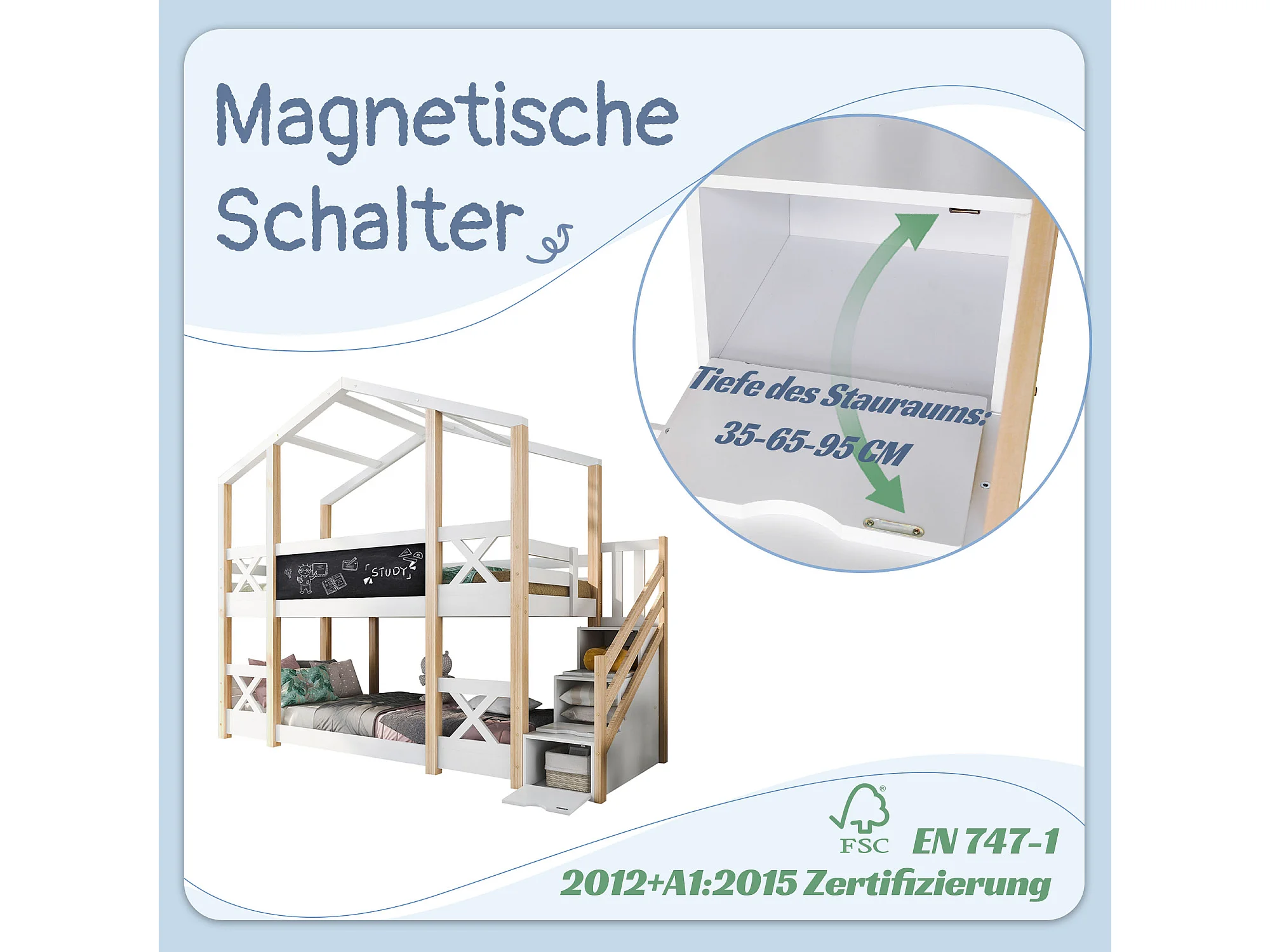 Etagenbetten 2 x 90 x 200 cm für Kinder – Hochbett – Schubladen + Treppe – Weiß + Natur