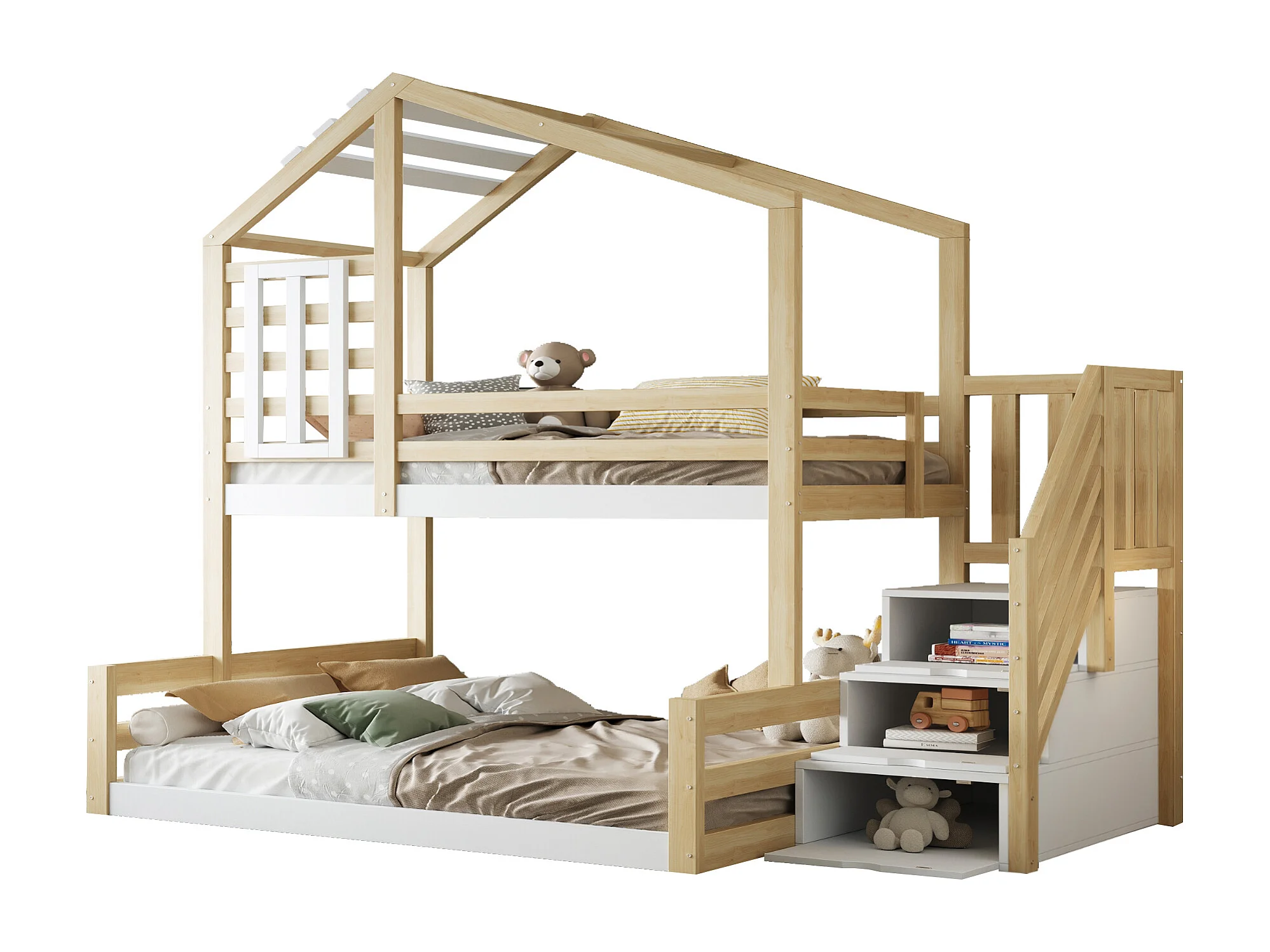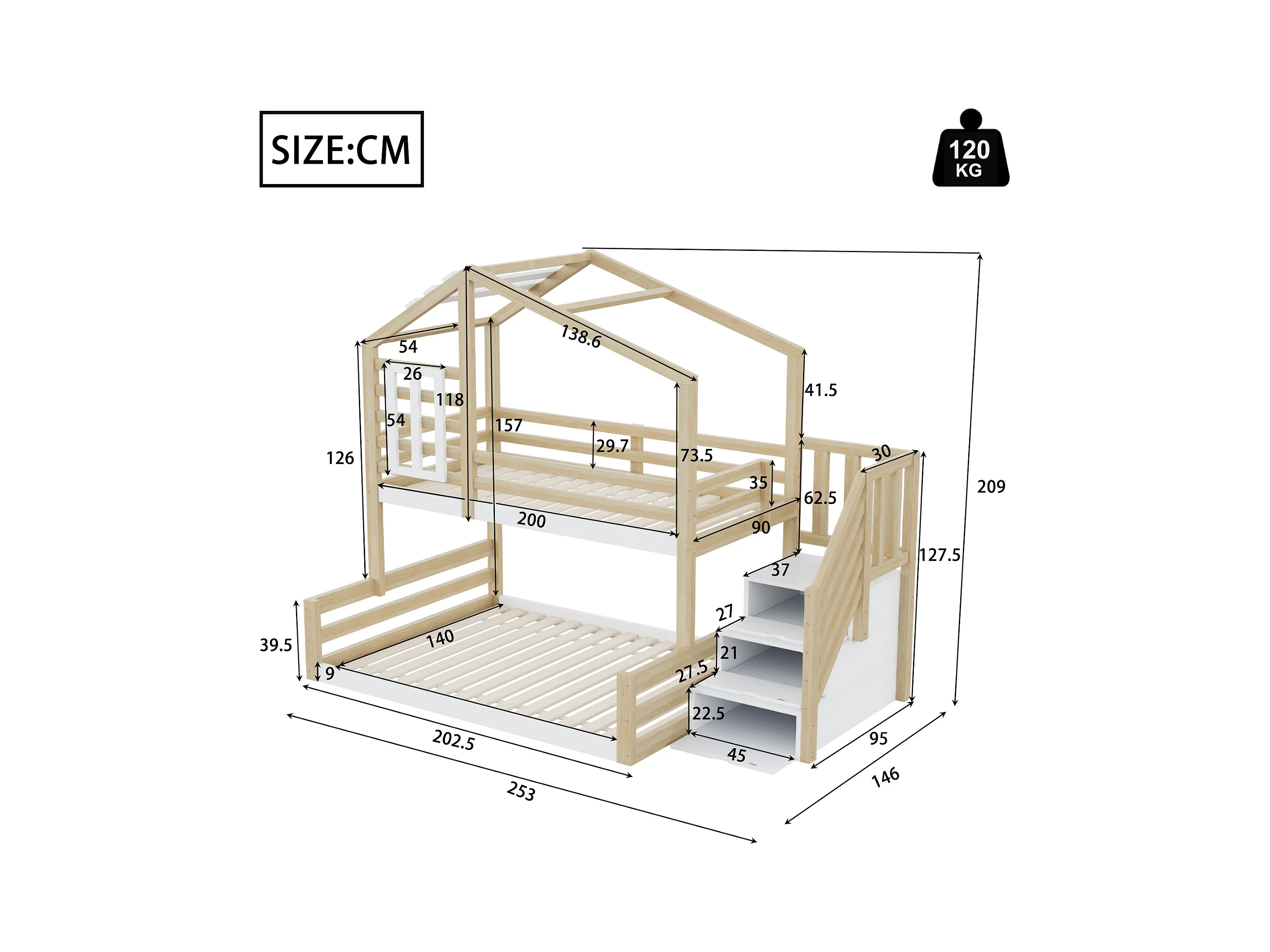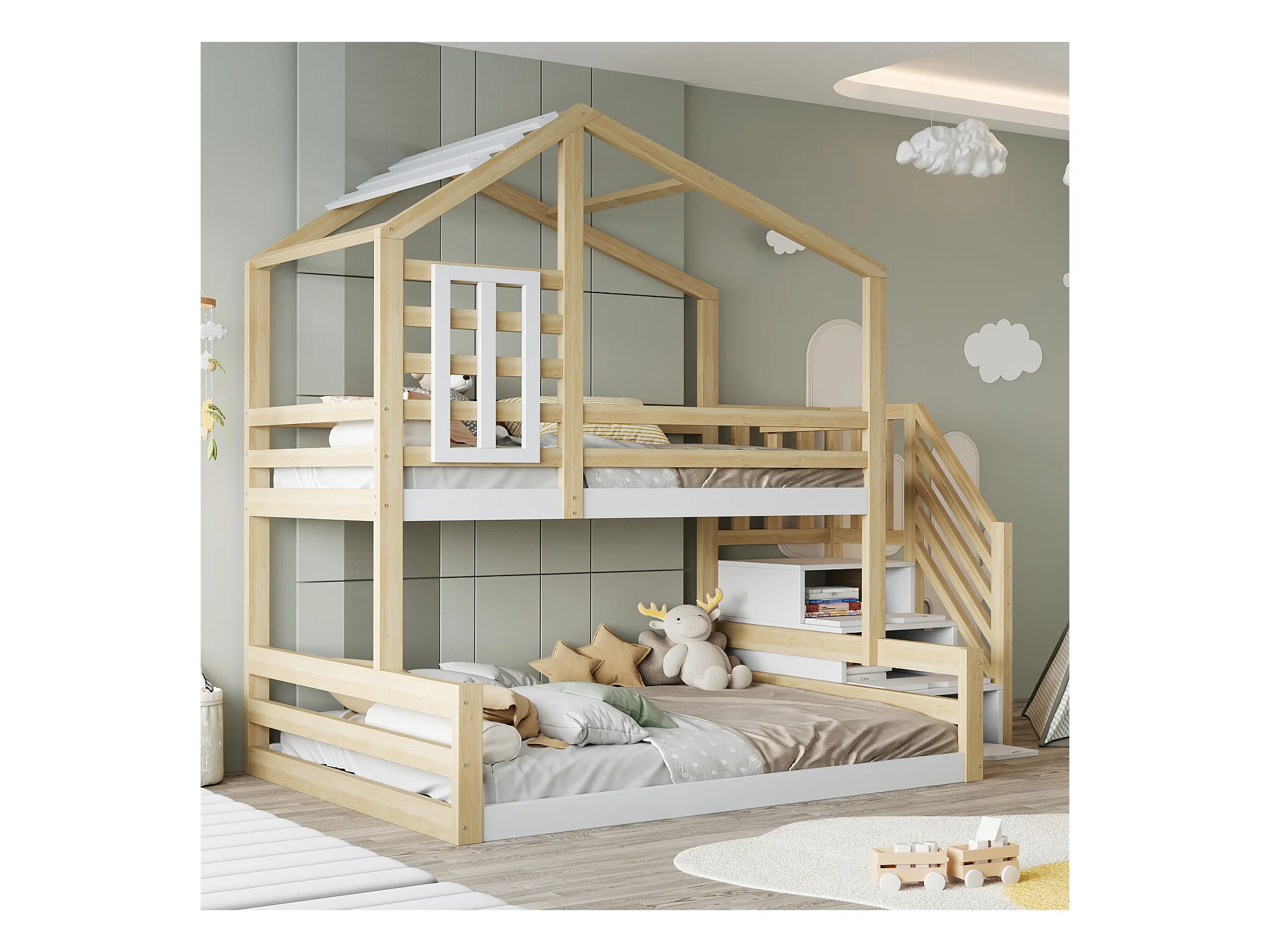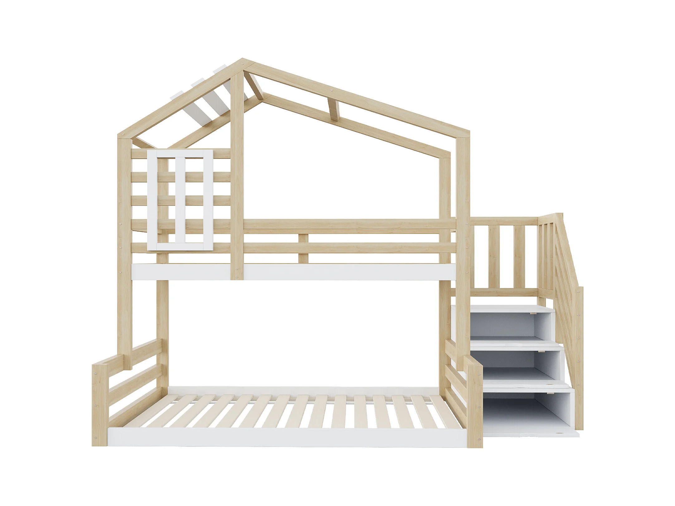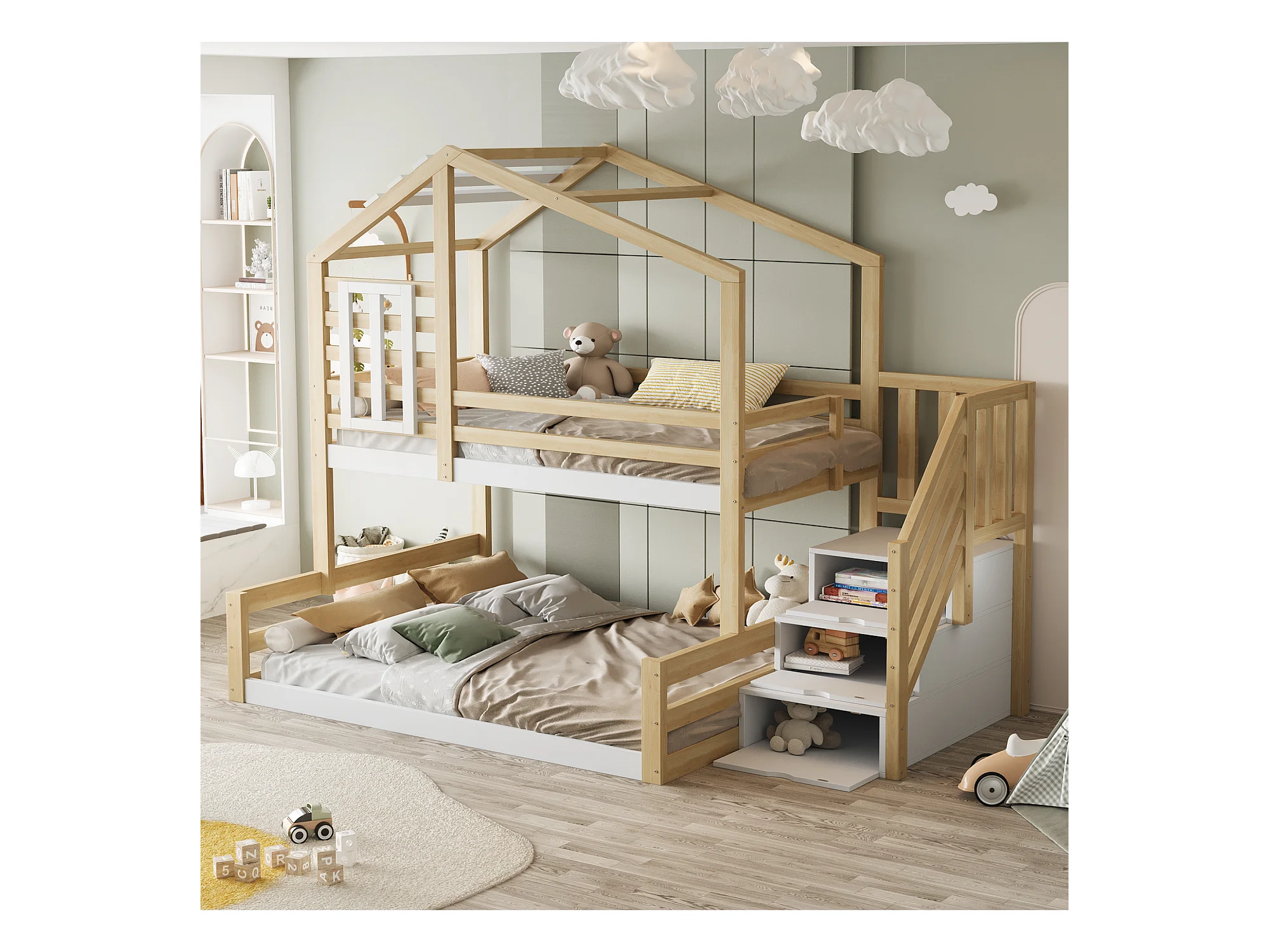 Etagenbetten 2 x 90 x 200 cm mit 3 Schubladen und Fenster – Kiefer + MDF – Naturholz und weiße Farben
