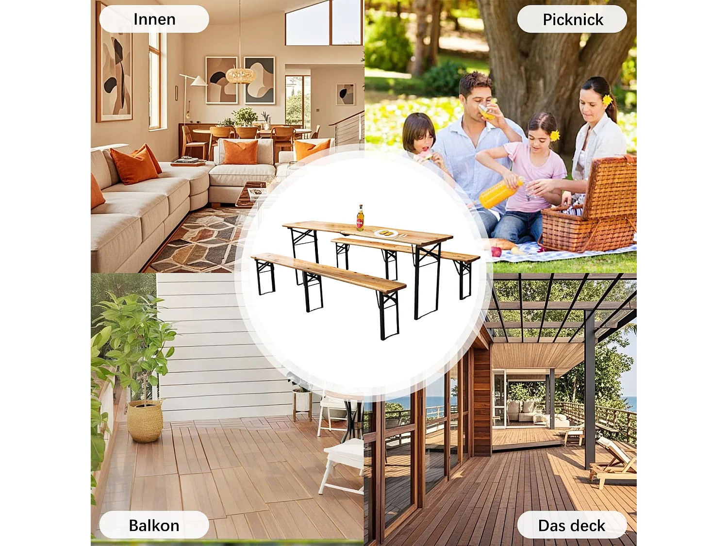 Faltbare Bierzeltgarnitur 220cm,3-teilig:1 Klapptisch+2 Bierbänke,wetterfeste Kiefer massiv,platzsparend, bis 200 kg, Biertischgarnitur Festzeltgarten
