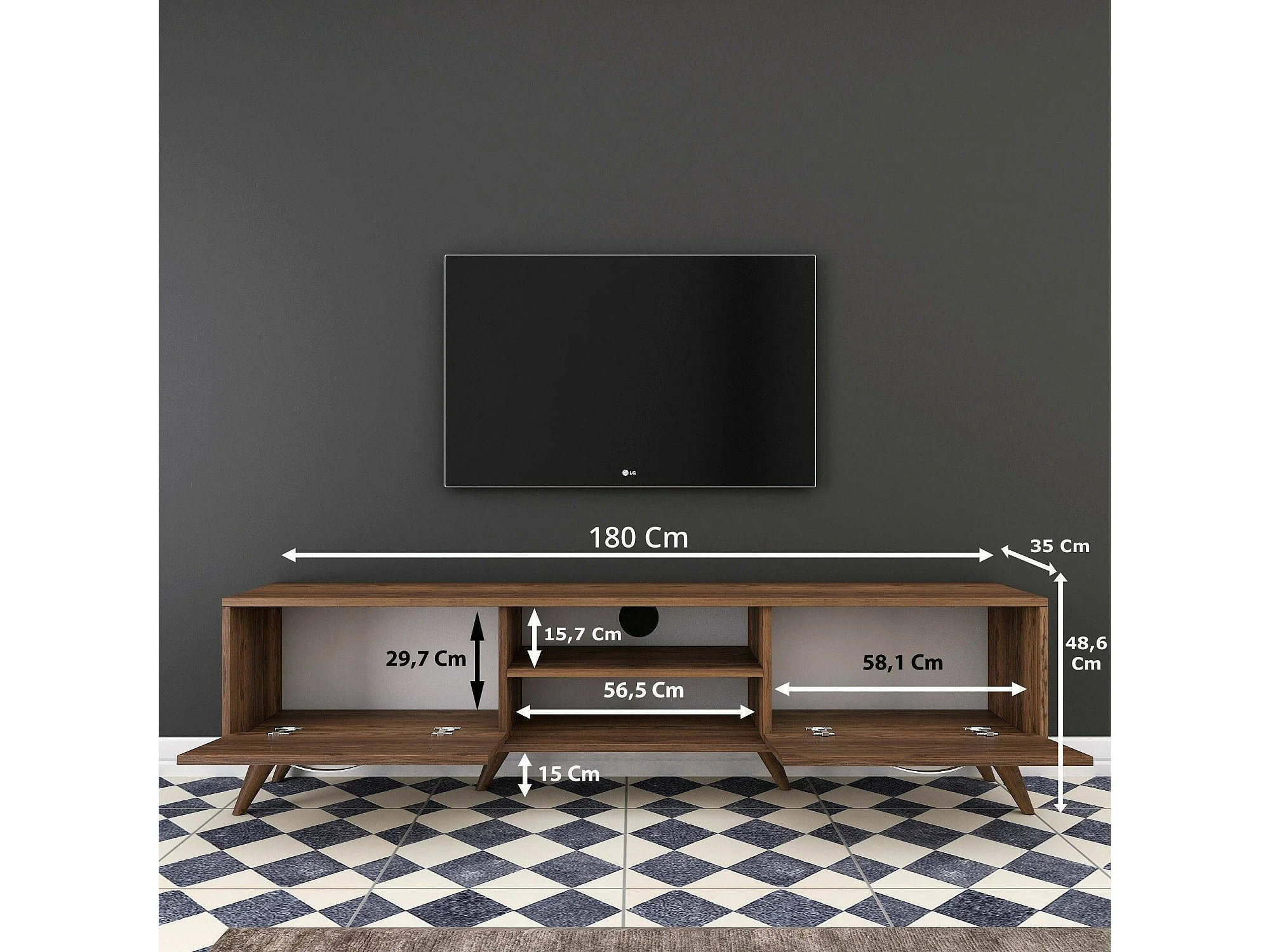Fernsehschrank Dbarar, Ständer für Wohnzimmerfernseher, Niedriges Wohnzimmer-Sideboard, TV-Ständerbasis, 180x35h49 cm, Nussbaum