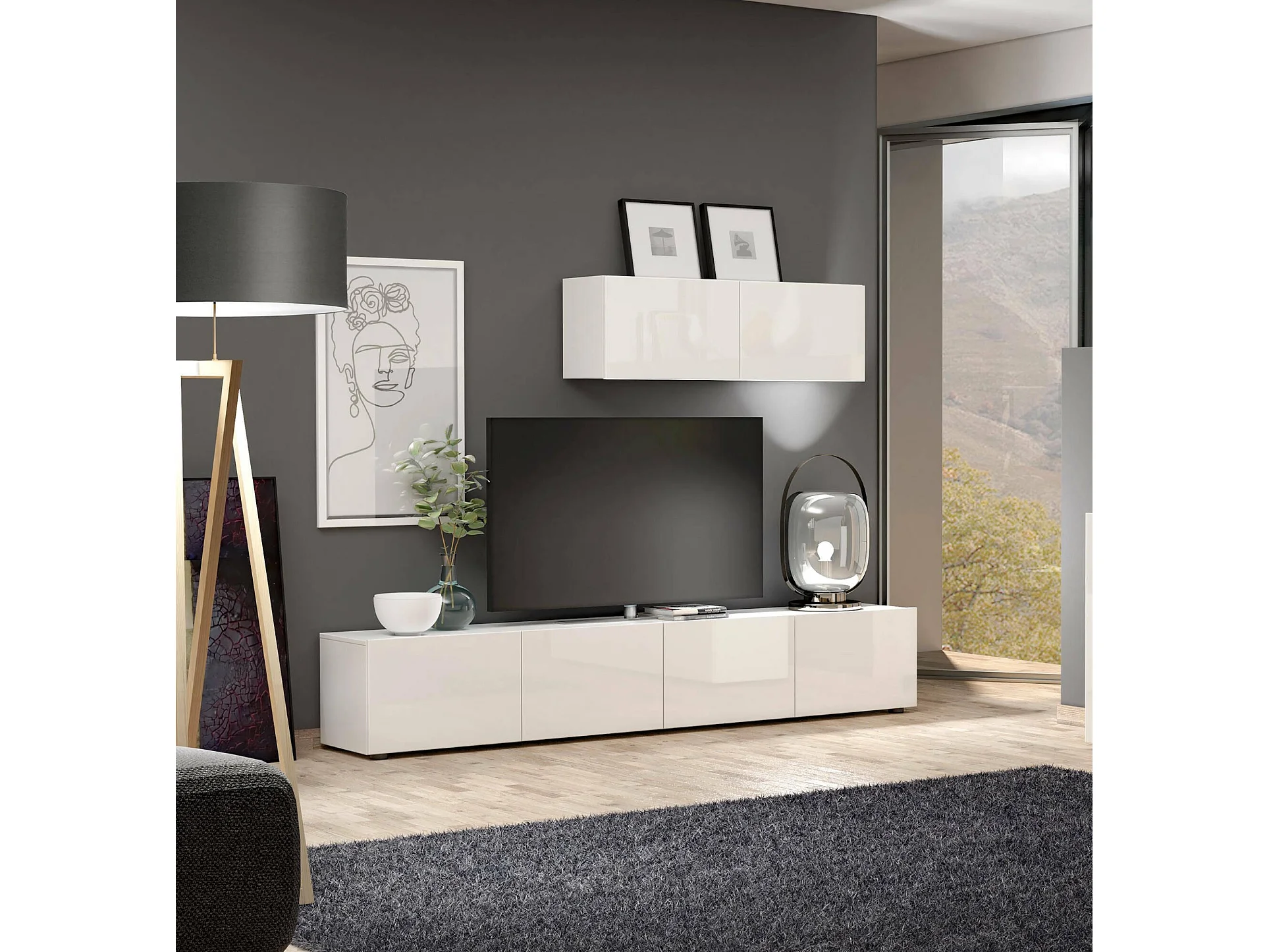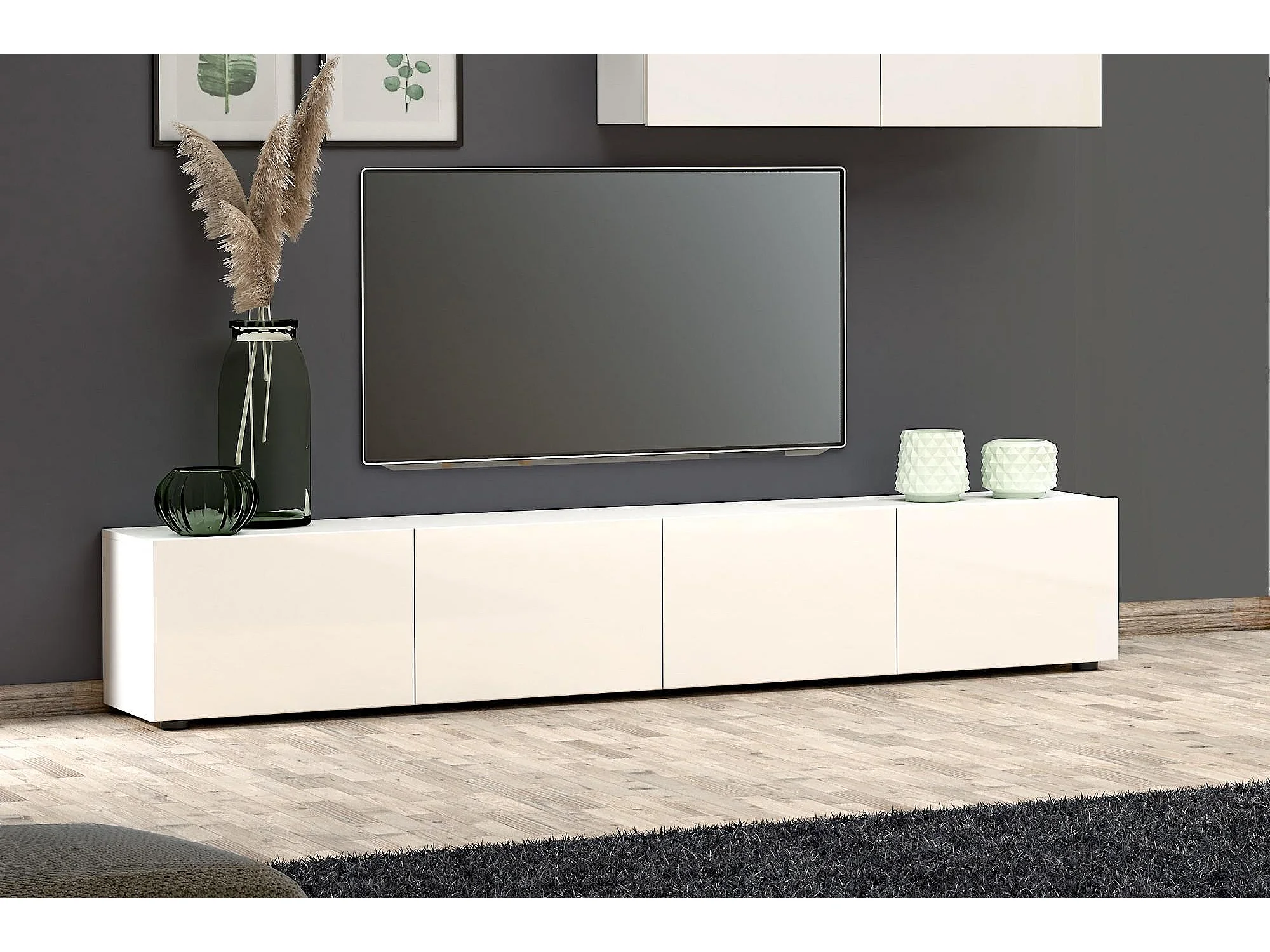 Fernsehschrank Dfalzeran, Ständer für Wohnzimmerfernseher, Niedriges Wohnzimmer-Sideboard, TV-Ständerbasis, Made in Italy, 225x38h39 cm, Glänzendes Weiß