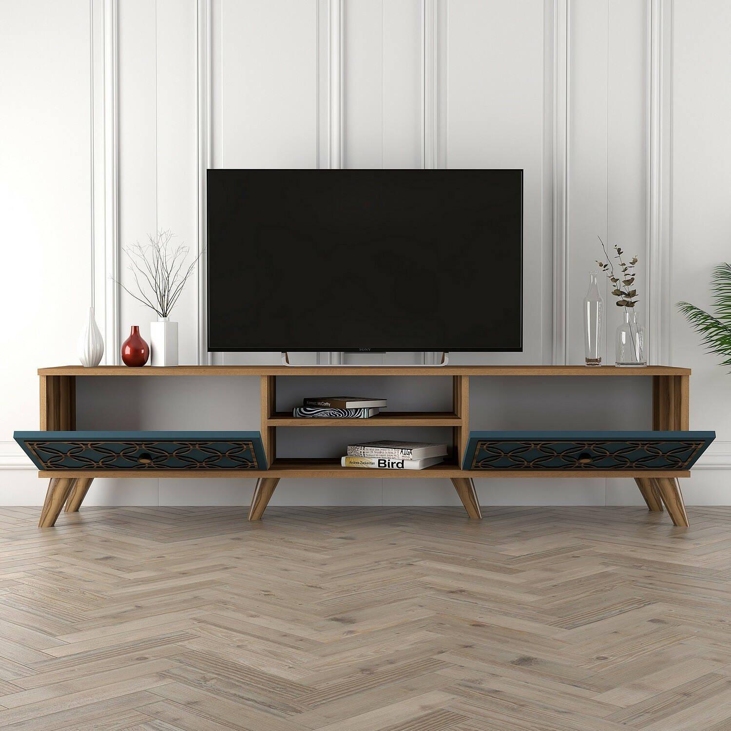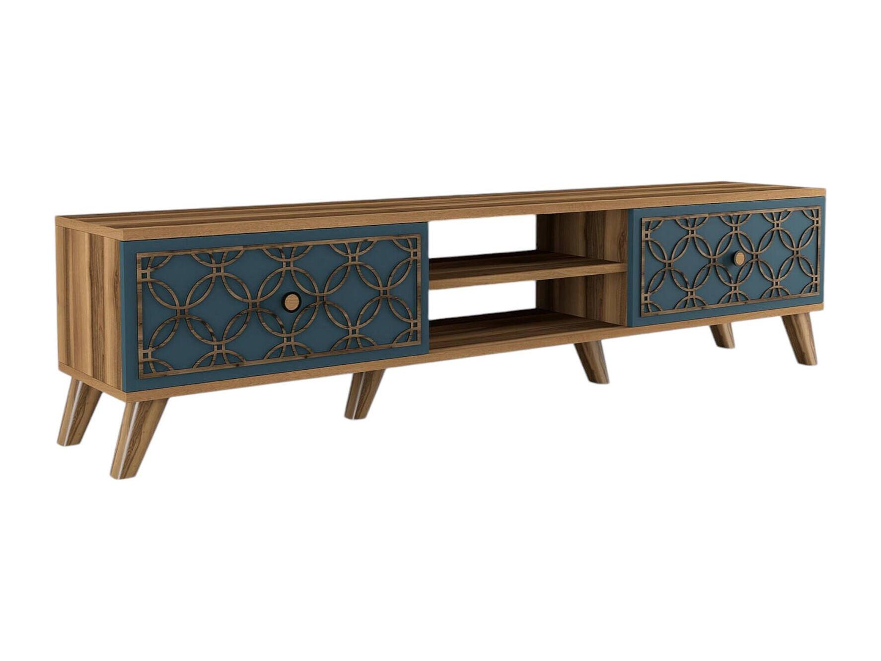 Fernsehschrank Dgabbiadin, Ständer für Wohnzimmerfernseher, Niedriges Wohnzimmer-Sideboard, TV-Ständerbasis, 180x35 h44 cm, Walnuss und Blau