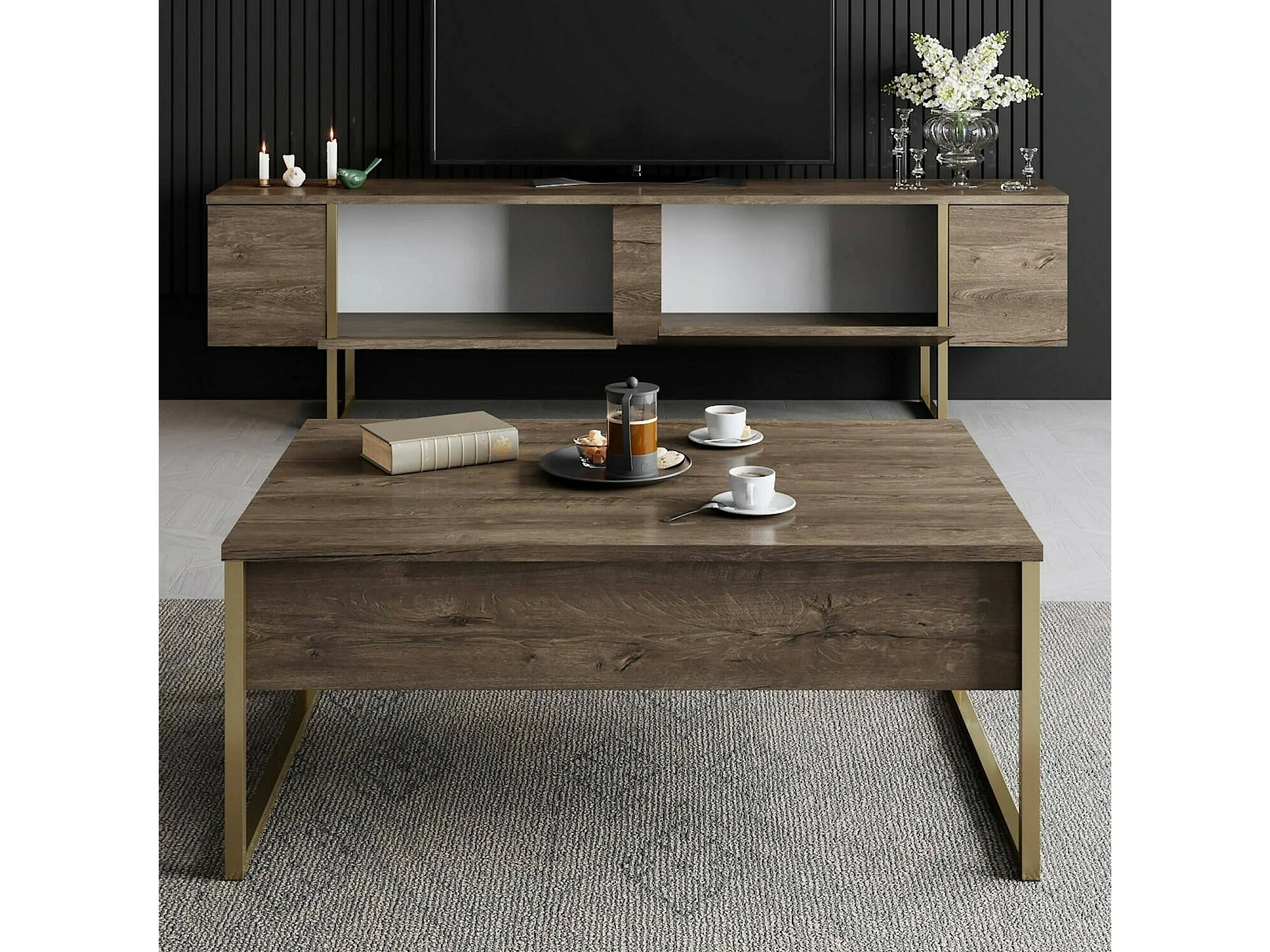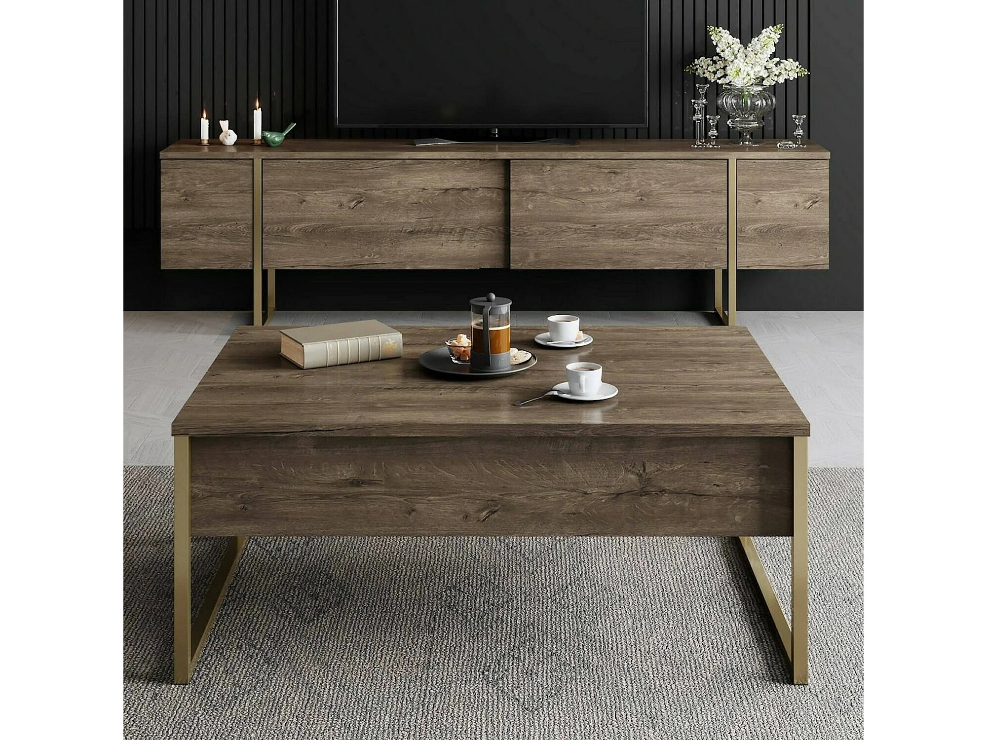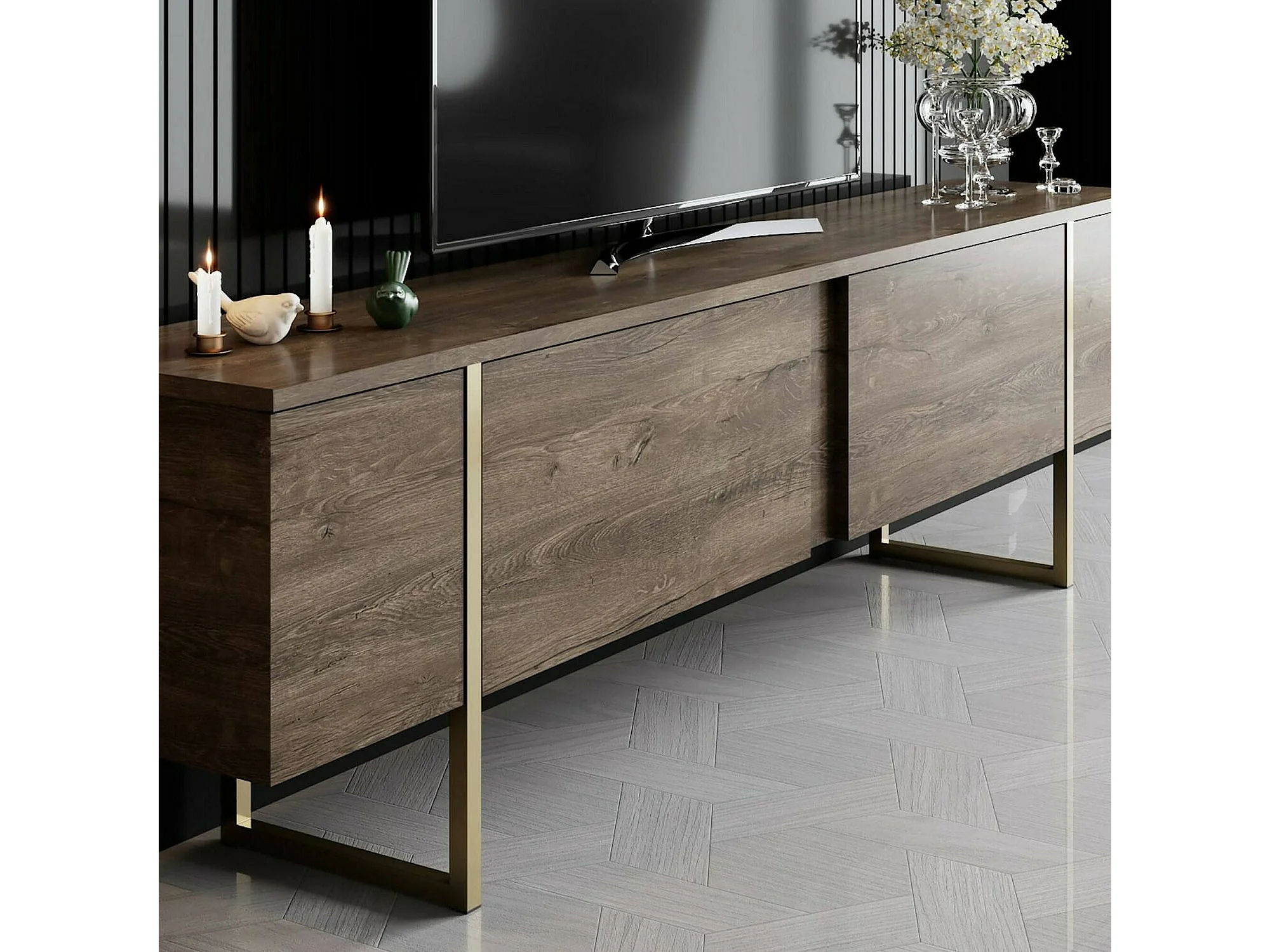 Fernsehschrank Dgridell, Ständer für Wohnzimmerfernseher, Niedriges Wohnzimmer-Sideboard, TV-Ständerbasis, 180x30h50 cm, Walnuss und Gold