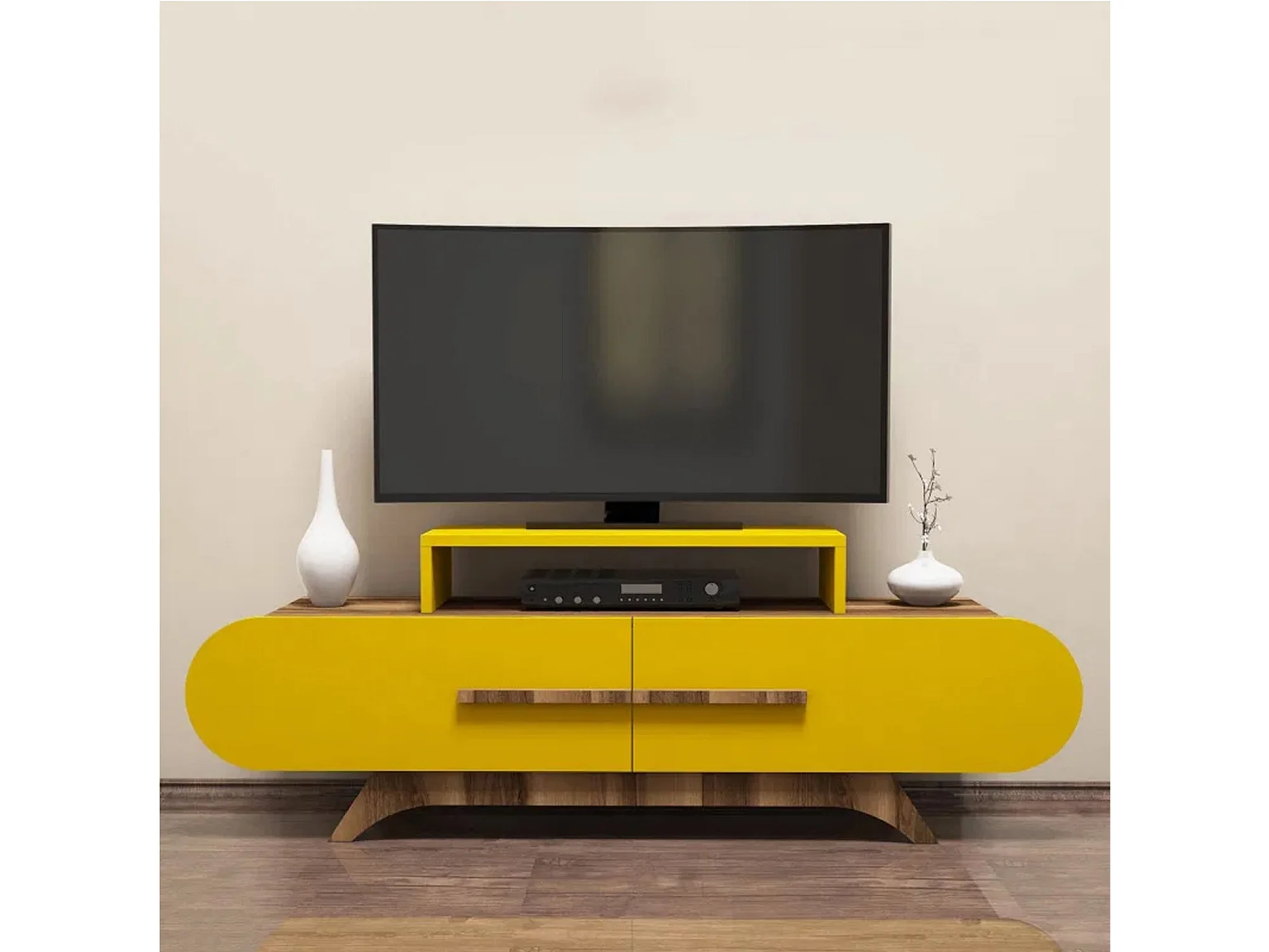 Fernsehschrank Dpittarell, Ständer für Wohnzimmerfernseher, Niedriges Wohnzimmer-Sideboard, TV-Ständerbasis, 145x37 h50 cm, Walnuss und Gelb