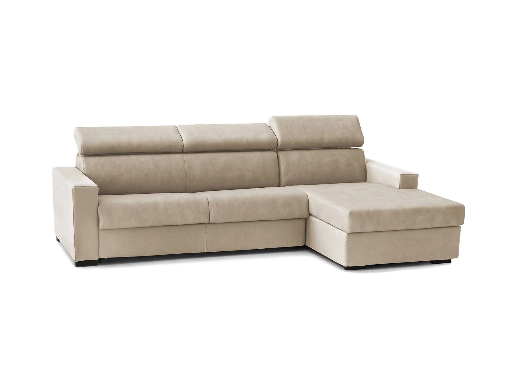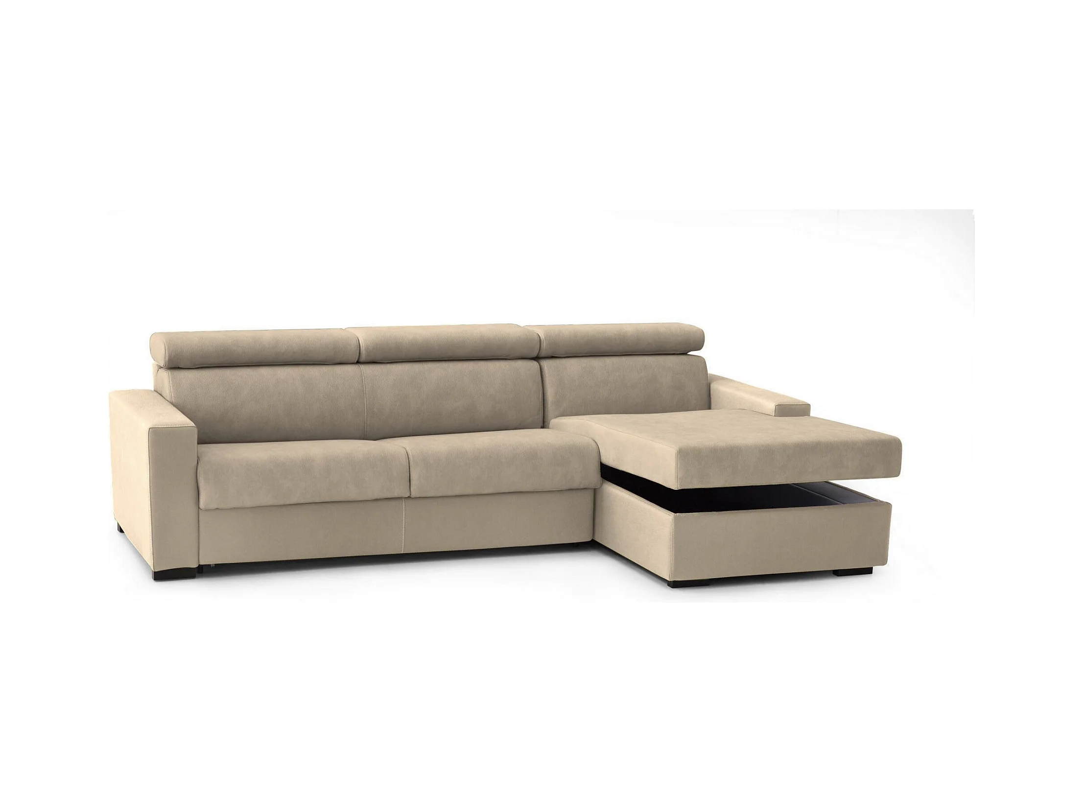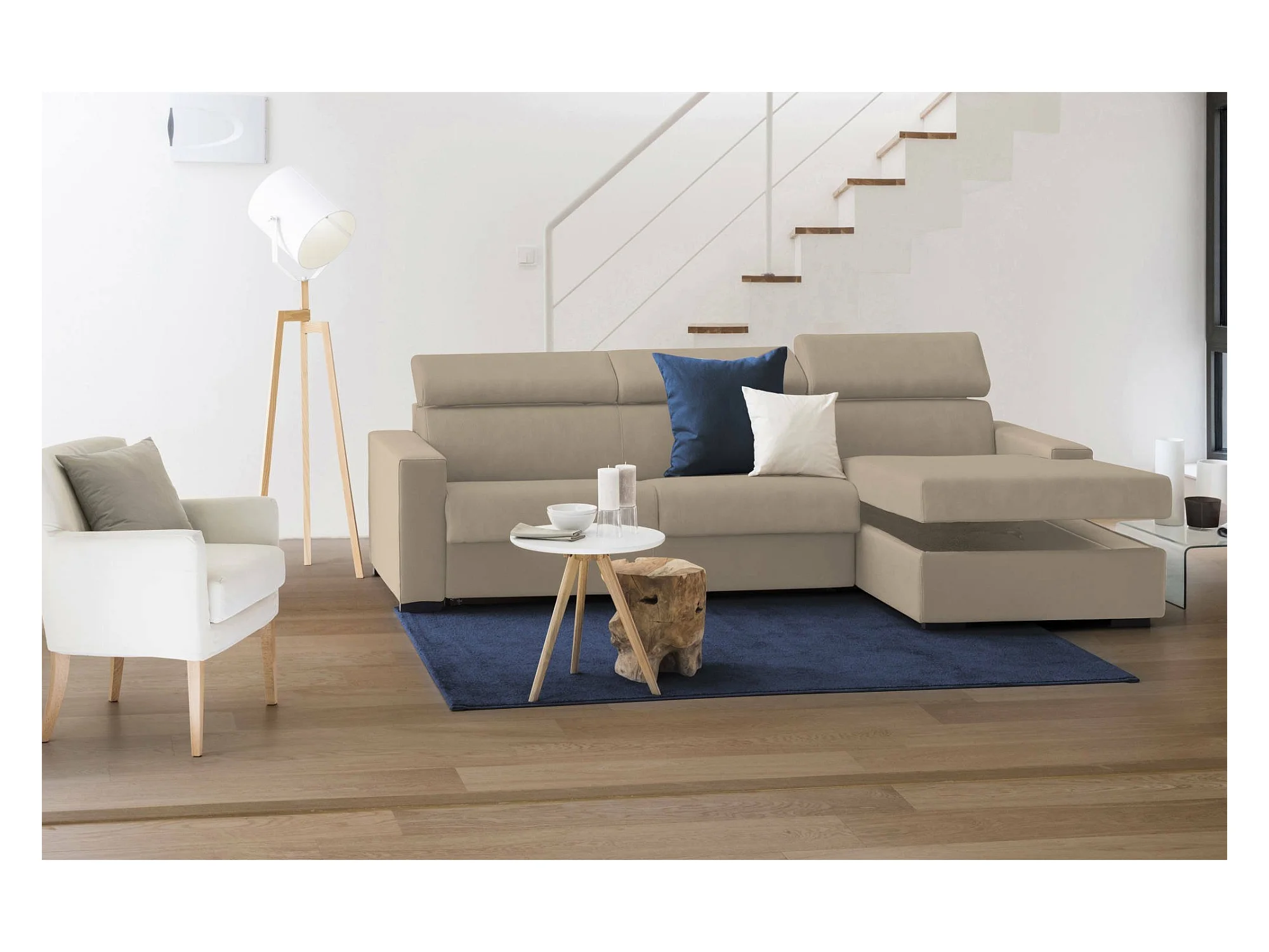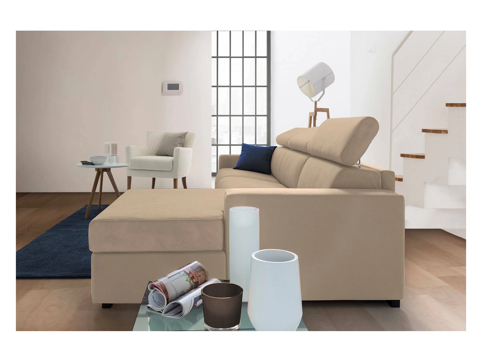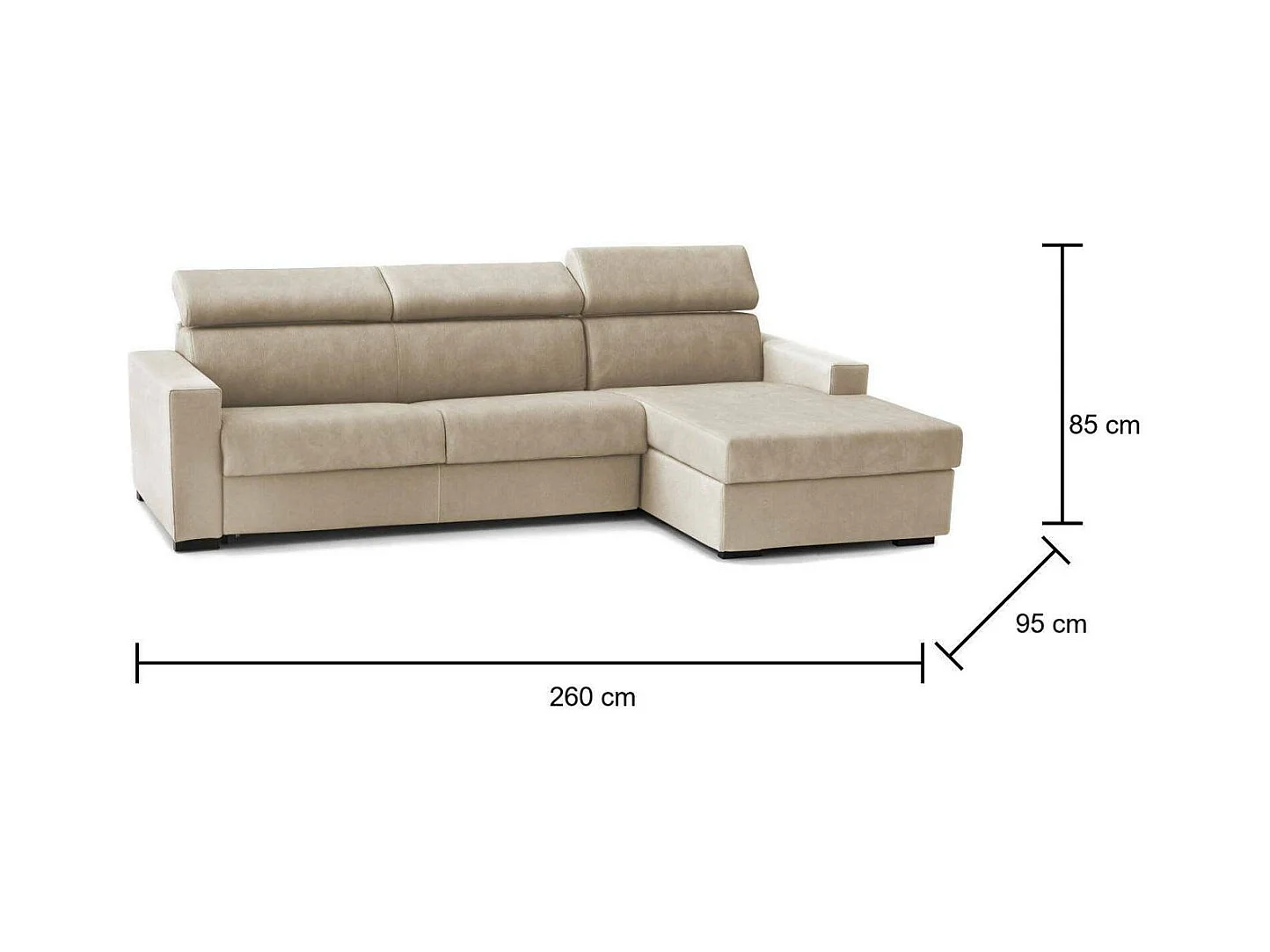 Sofá fijo con península Mikaela, sofá esquinero con chaise longue derecho de tela, reposabrazos finos, 100% Made in Italy, 260x95h85 cm, Beige