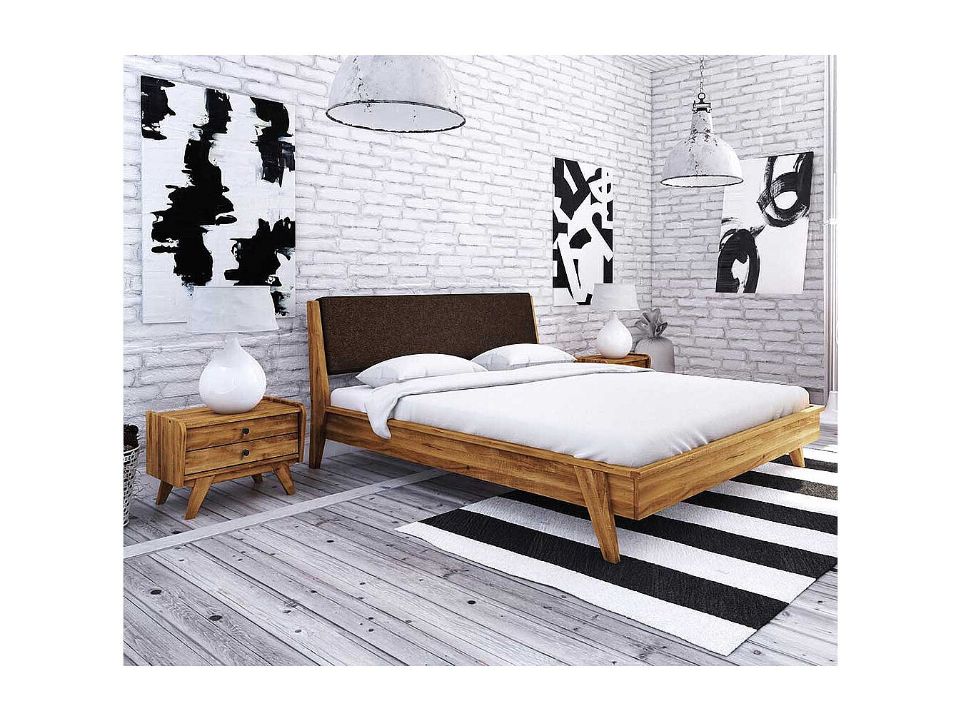 Flaches Bett aus Wildeiche Massivholz gepolstertem Kopfteil in Dunkelbraun (dreiteilig)