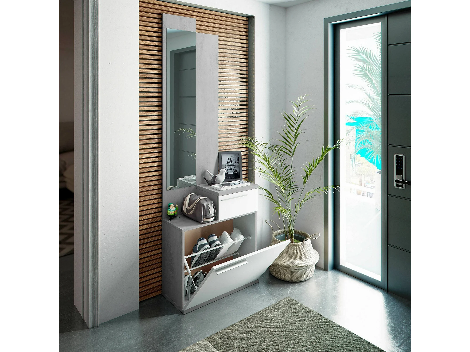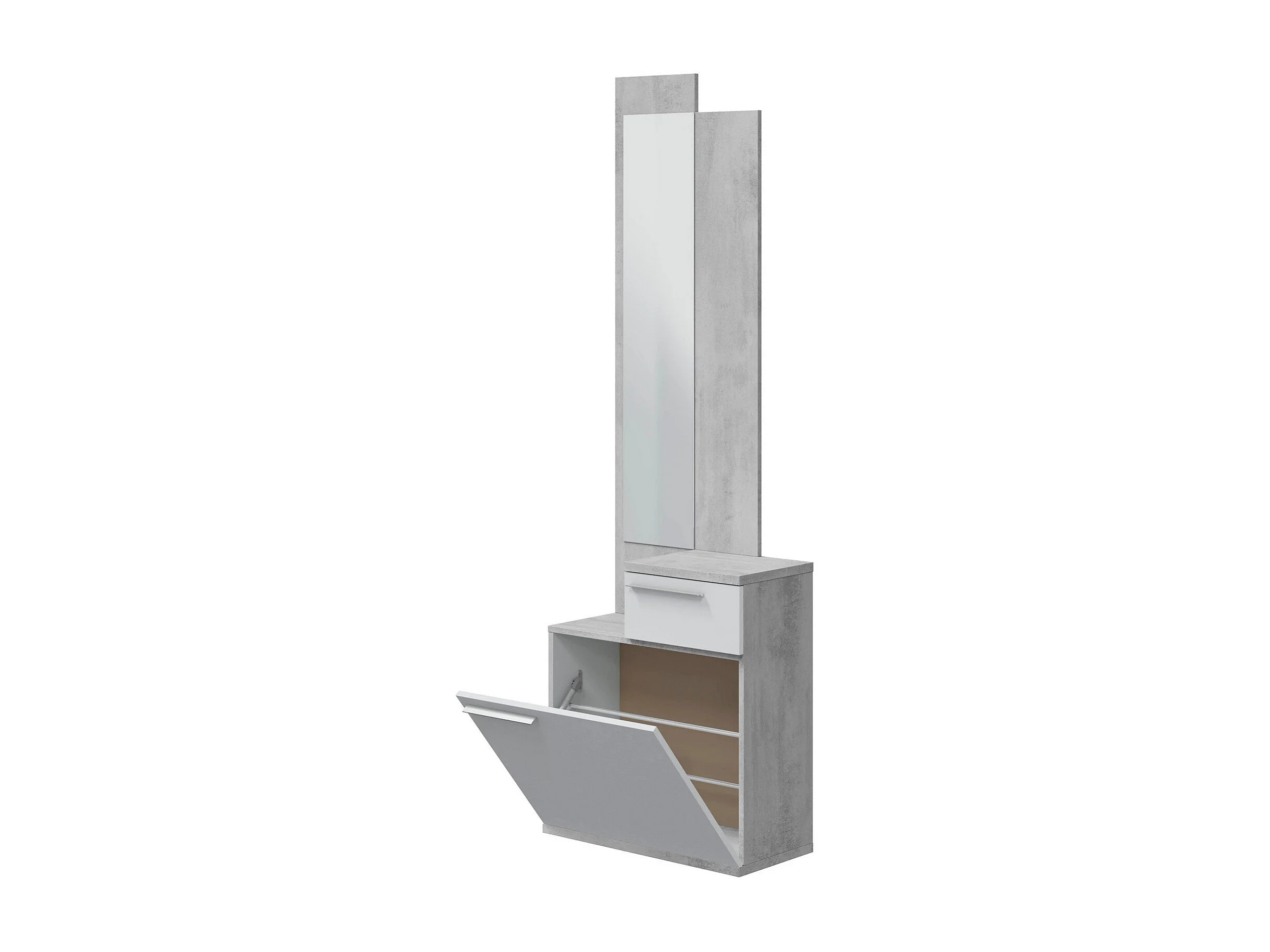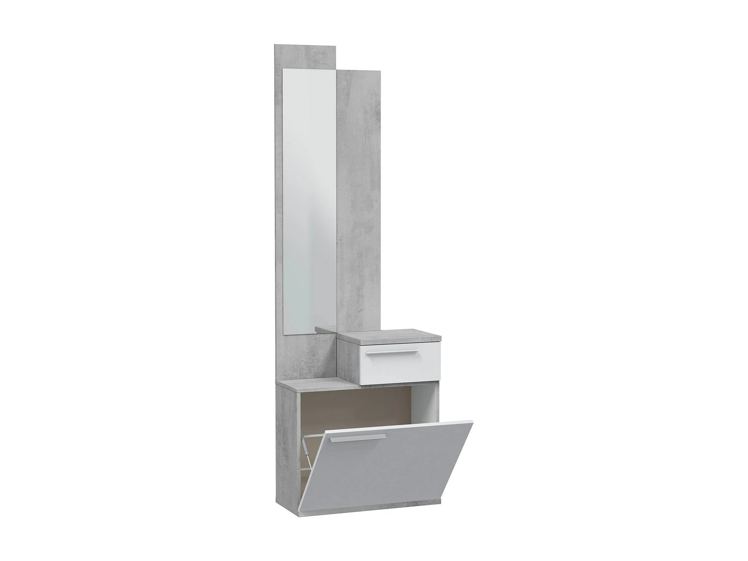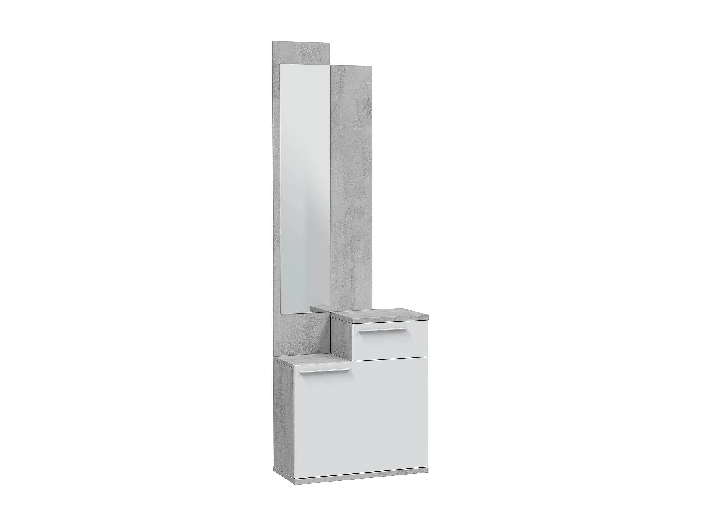 Flurmöbel Waltham, Multifunktions-Schuhregal mit Spiegel, Kleiderschrank mit 1 Tür und 1 Schublade, 61x28h185 cm, Zement und glänzendes Weiß