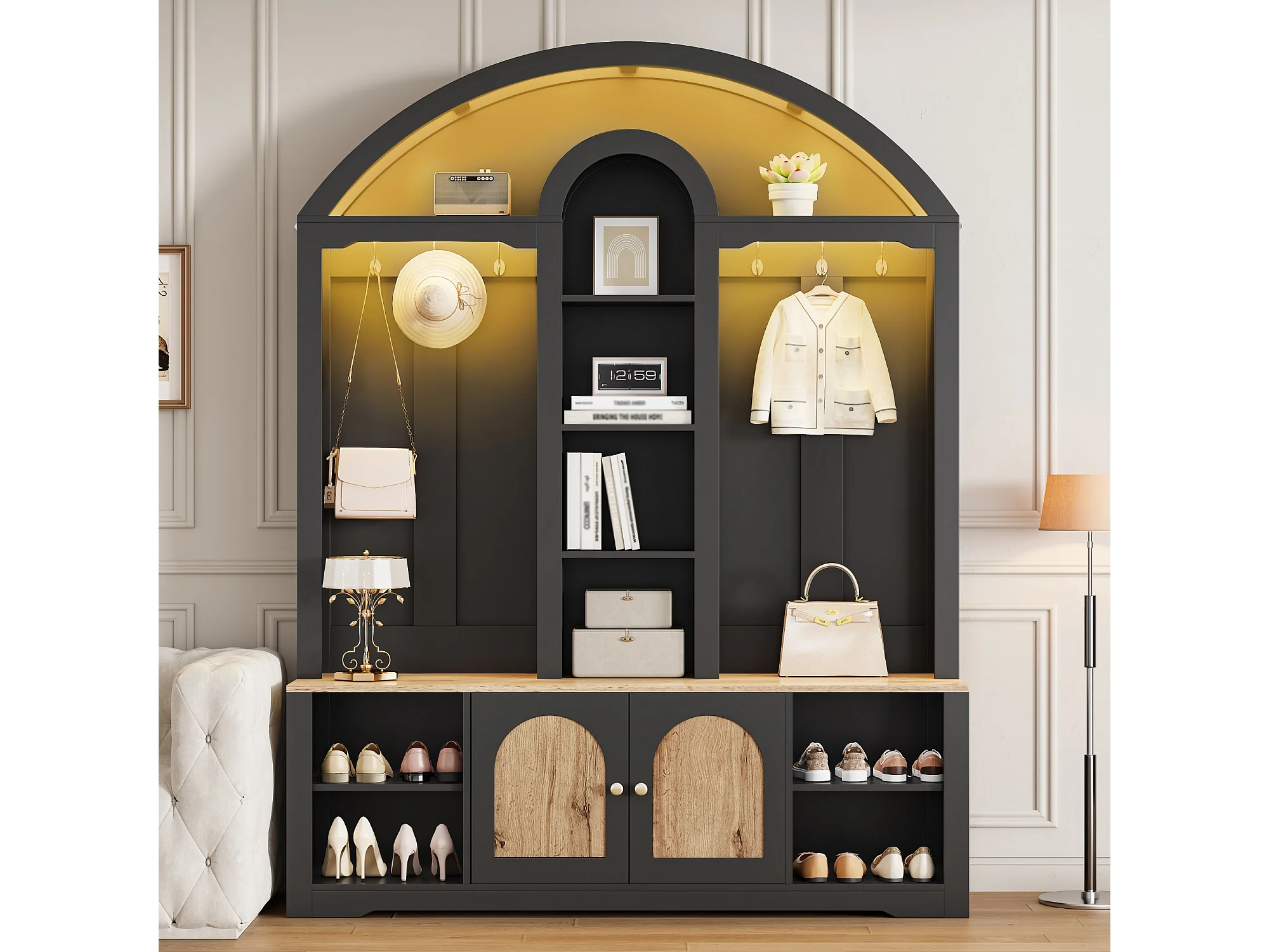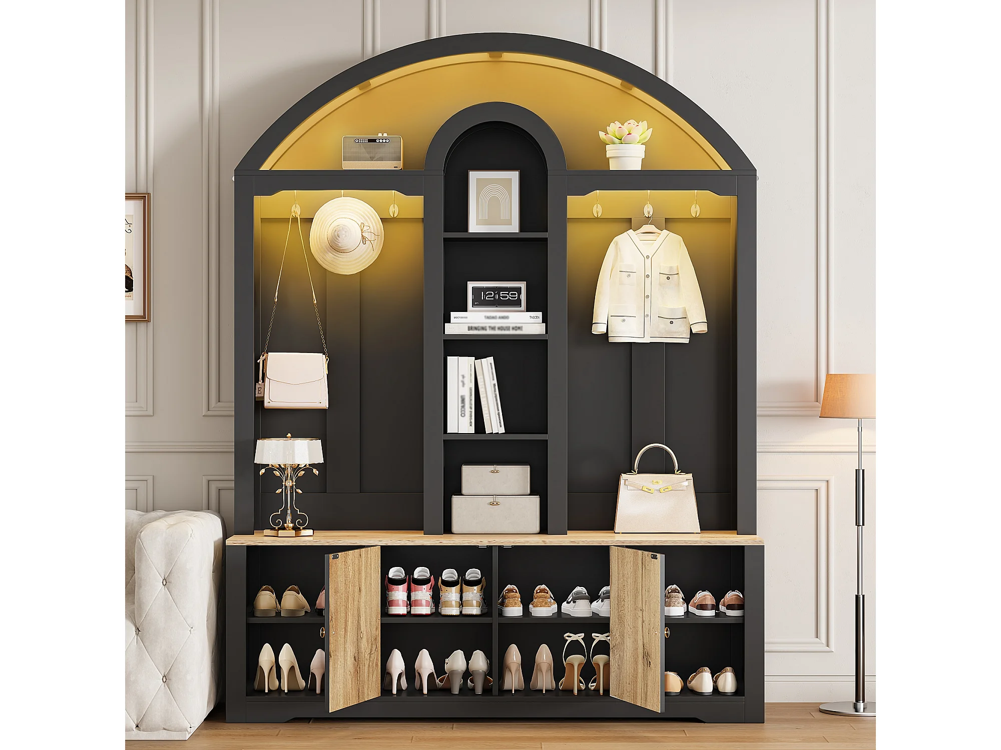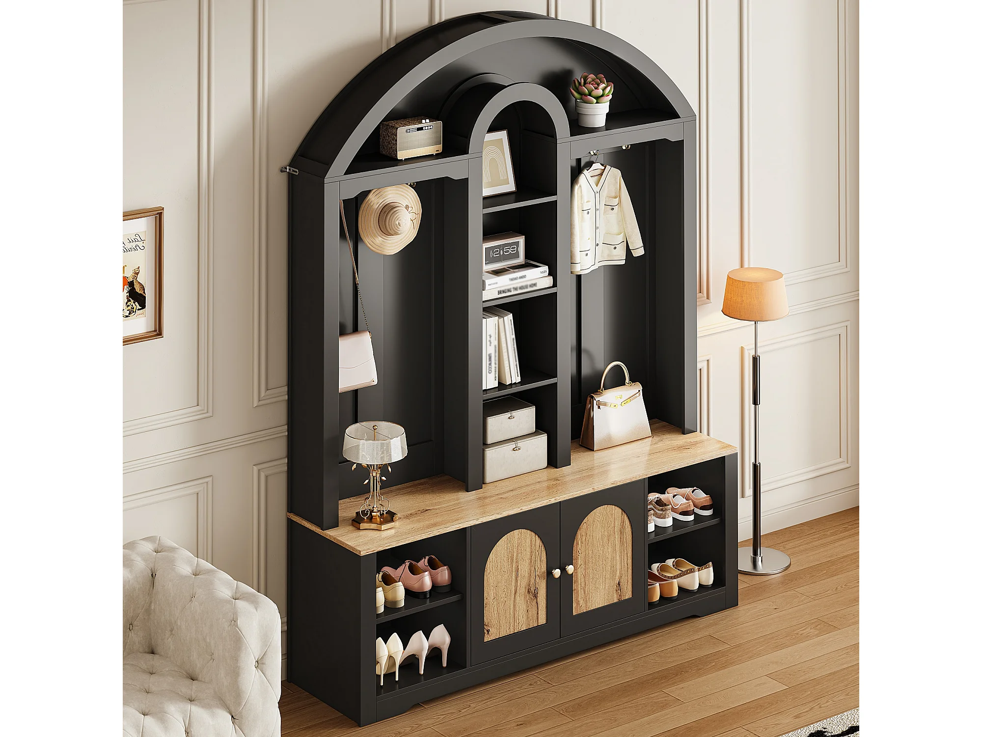 Flurschrank mit Schuhregal, Ablagen, Haken und 2 Türen – 150 x 40 x 195 cm – MDF – schwarz
