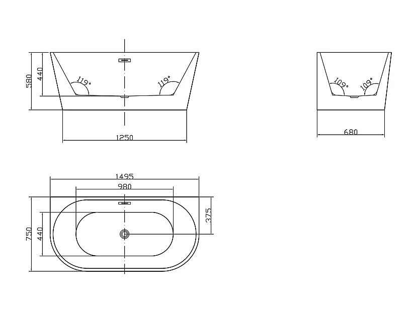 Halb freistehende Badewanne - 200L - 150 x 75 x 58 cm - Acryl - Schwarz matt - DIVINA