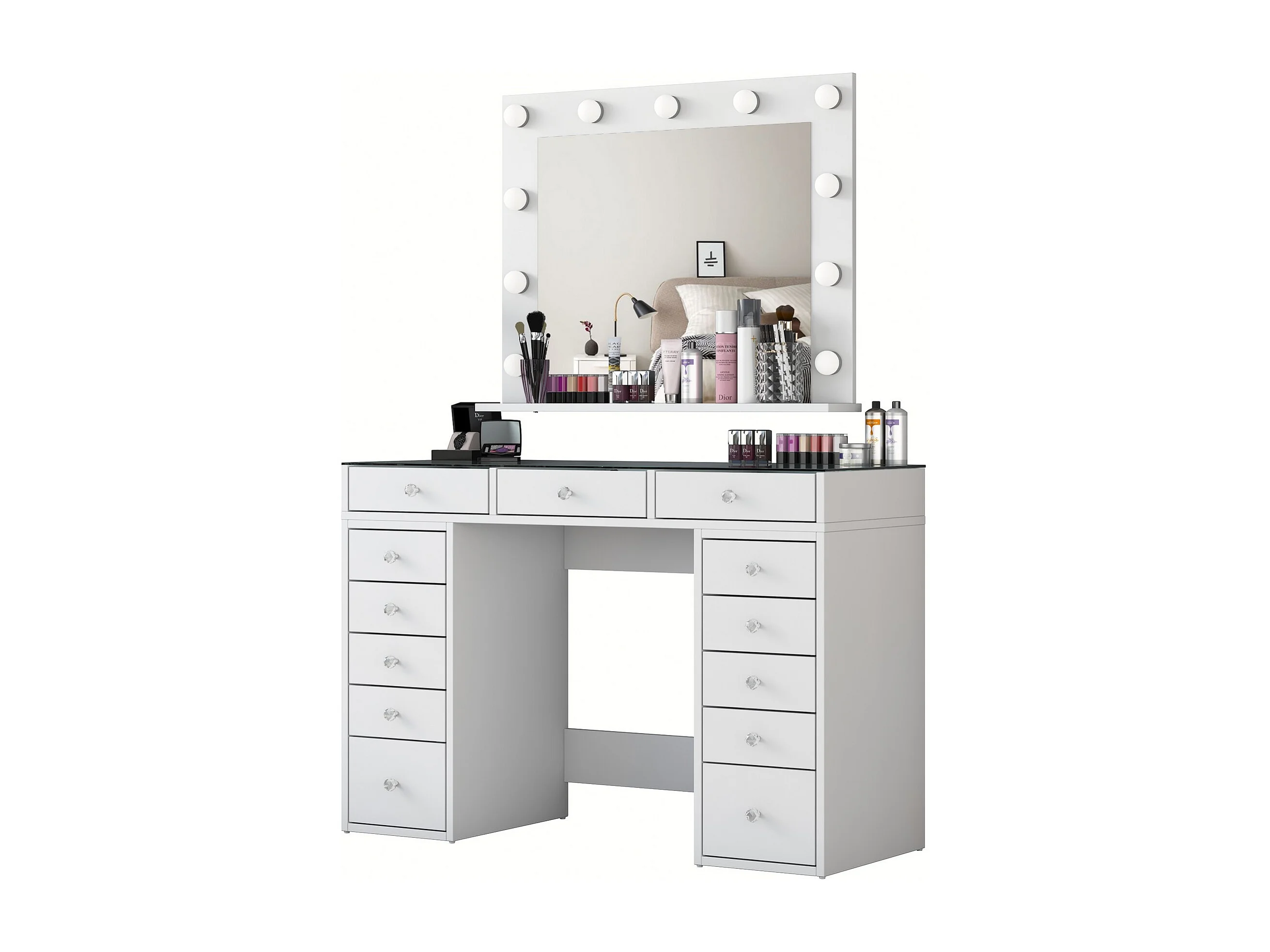 Frisiertisch Baria aus weißem Holz mit beleuchtetem Spiegel, 13 Schubladen und Ablage, 120x44x80 cm