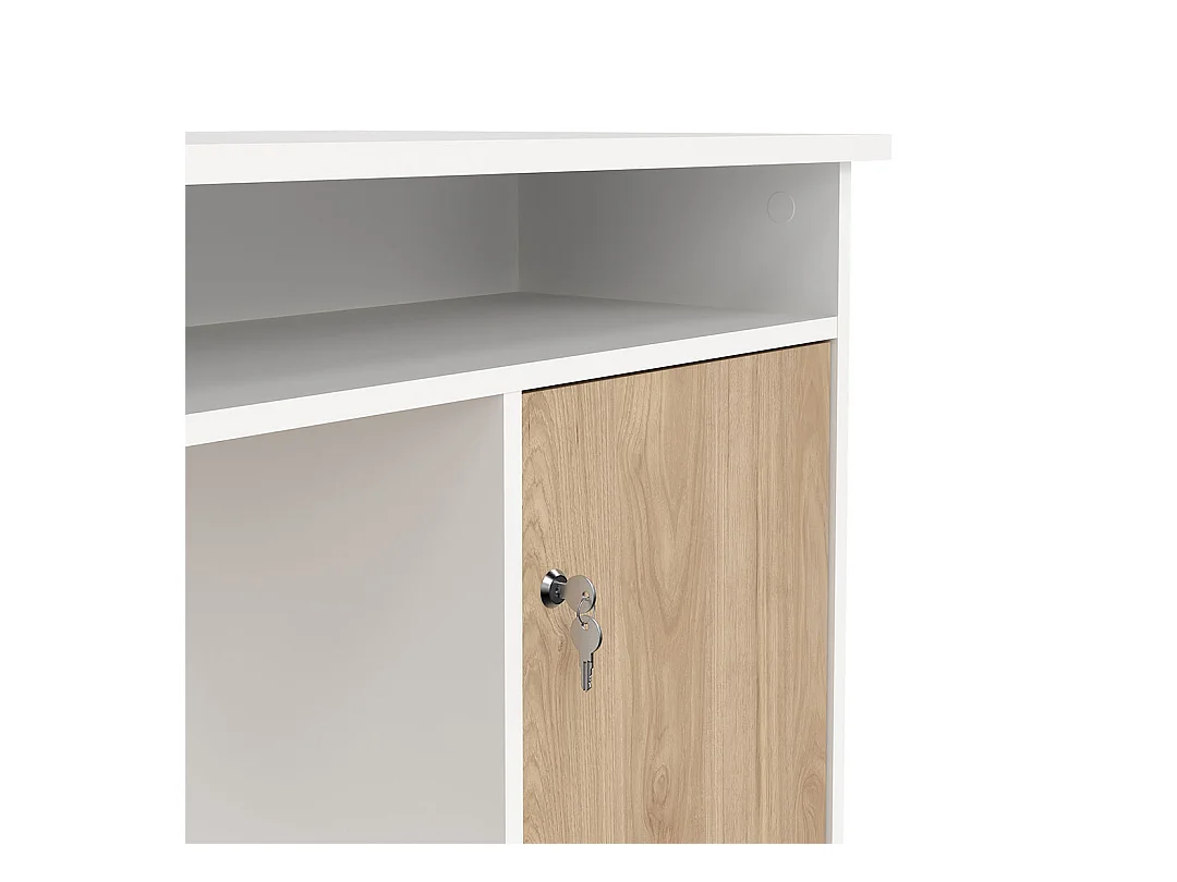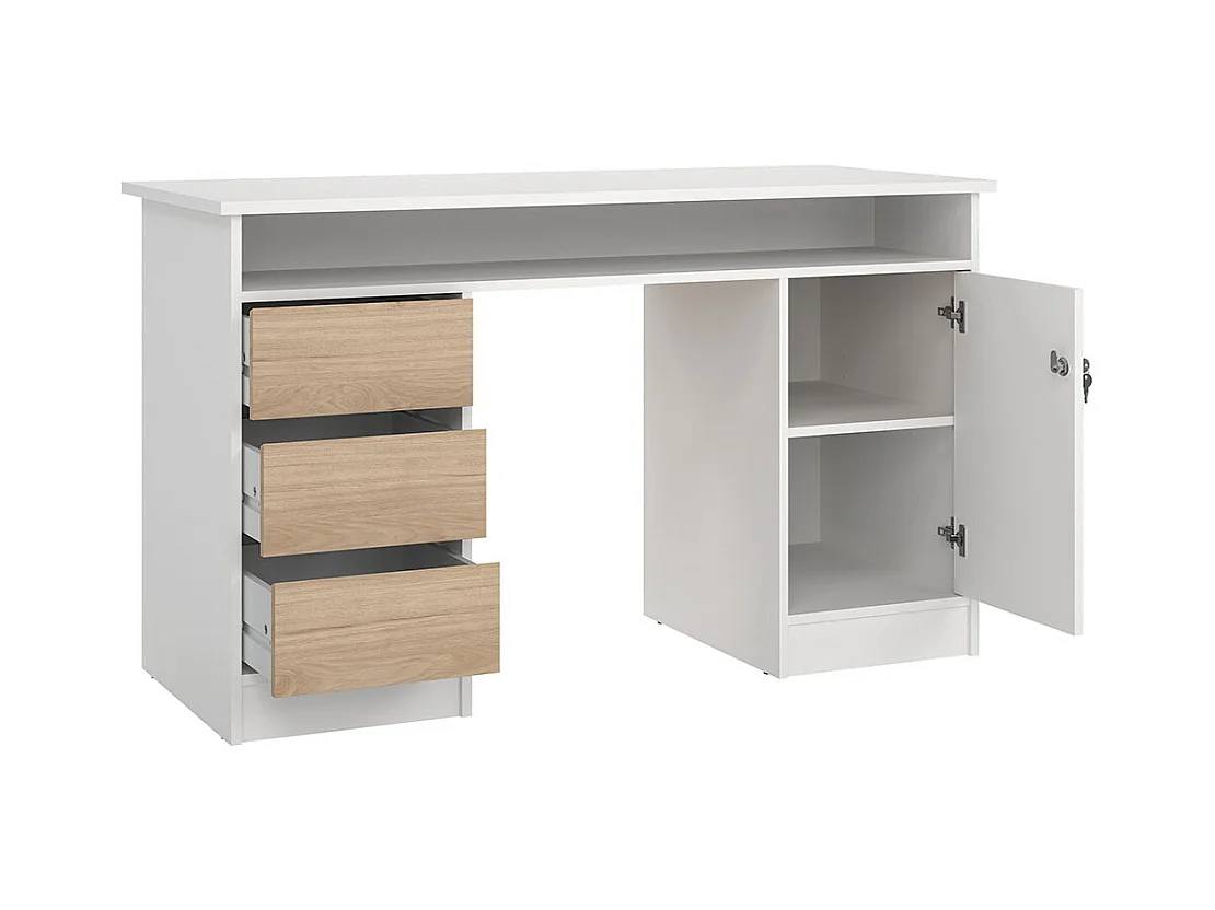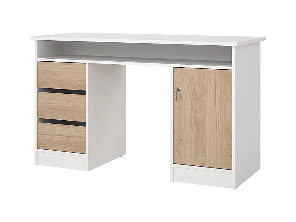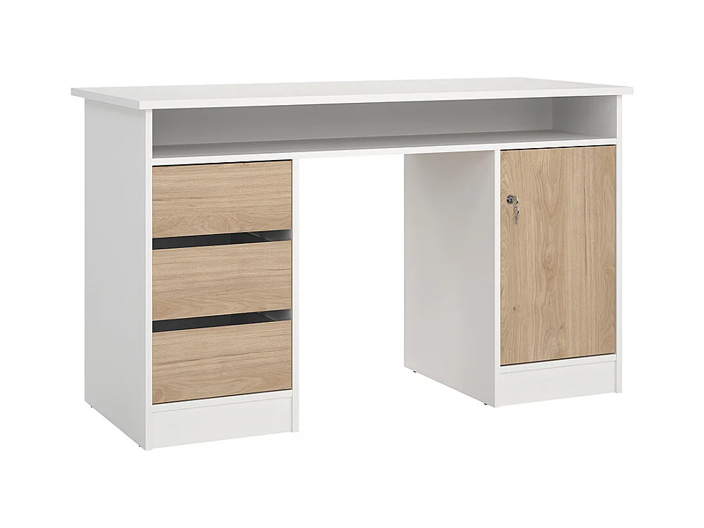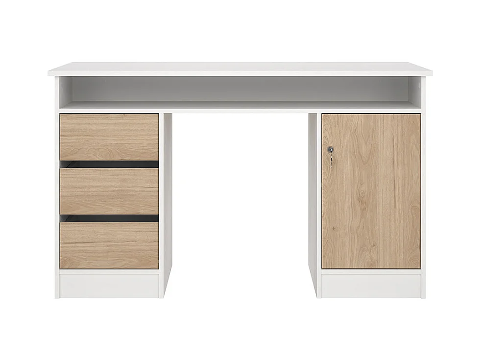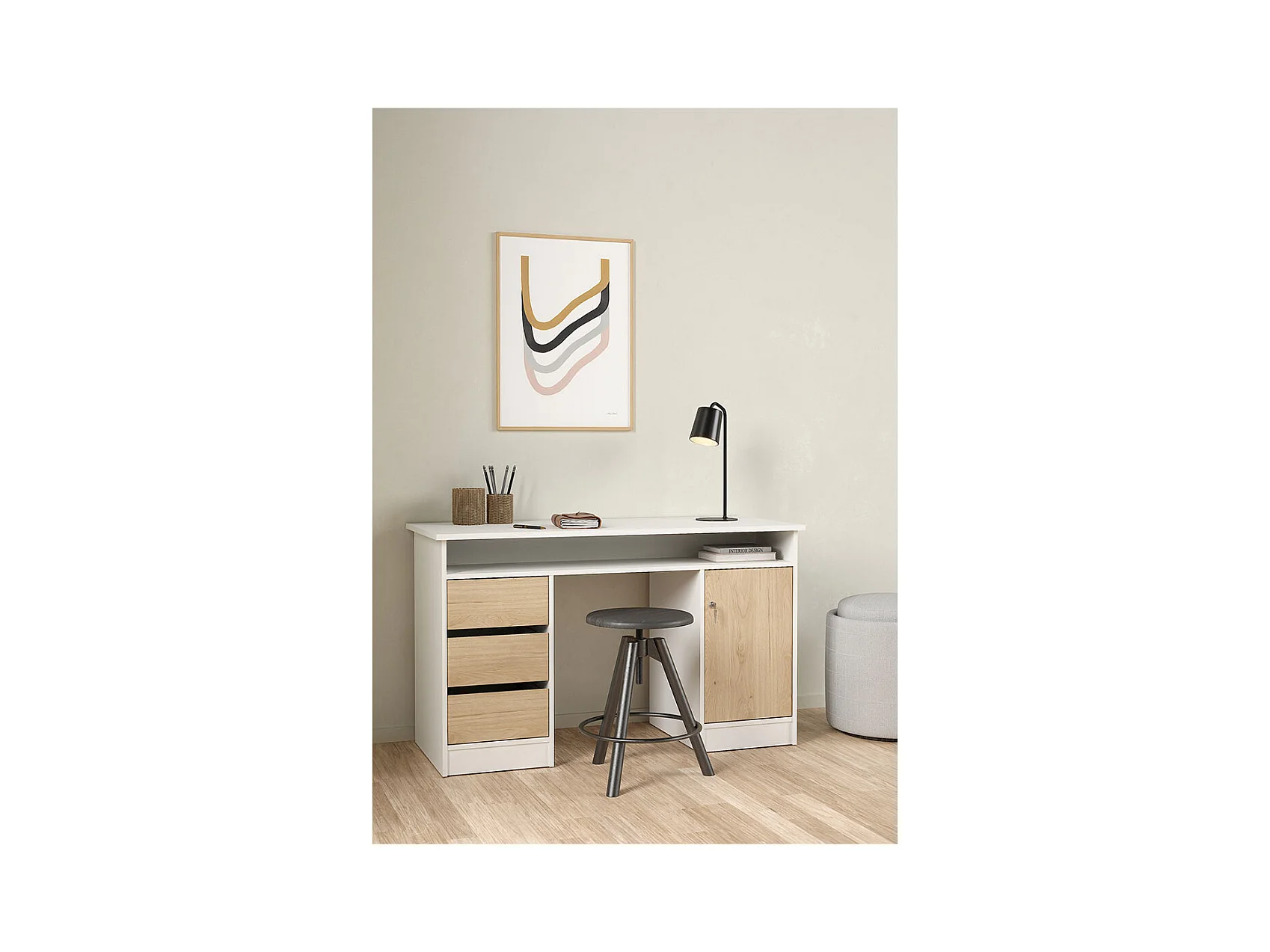FunctionPlus Schreibtisch 1 Ablage, 1 Tür, 3 Schubladen weiß, Eichen-Dekor.