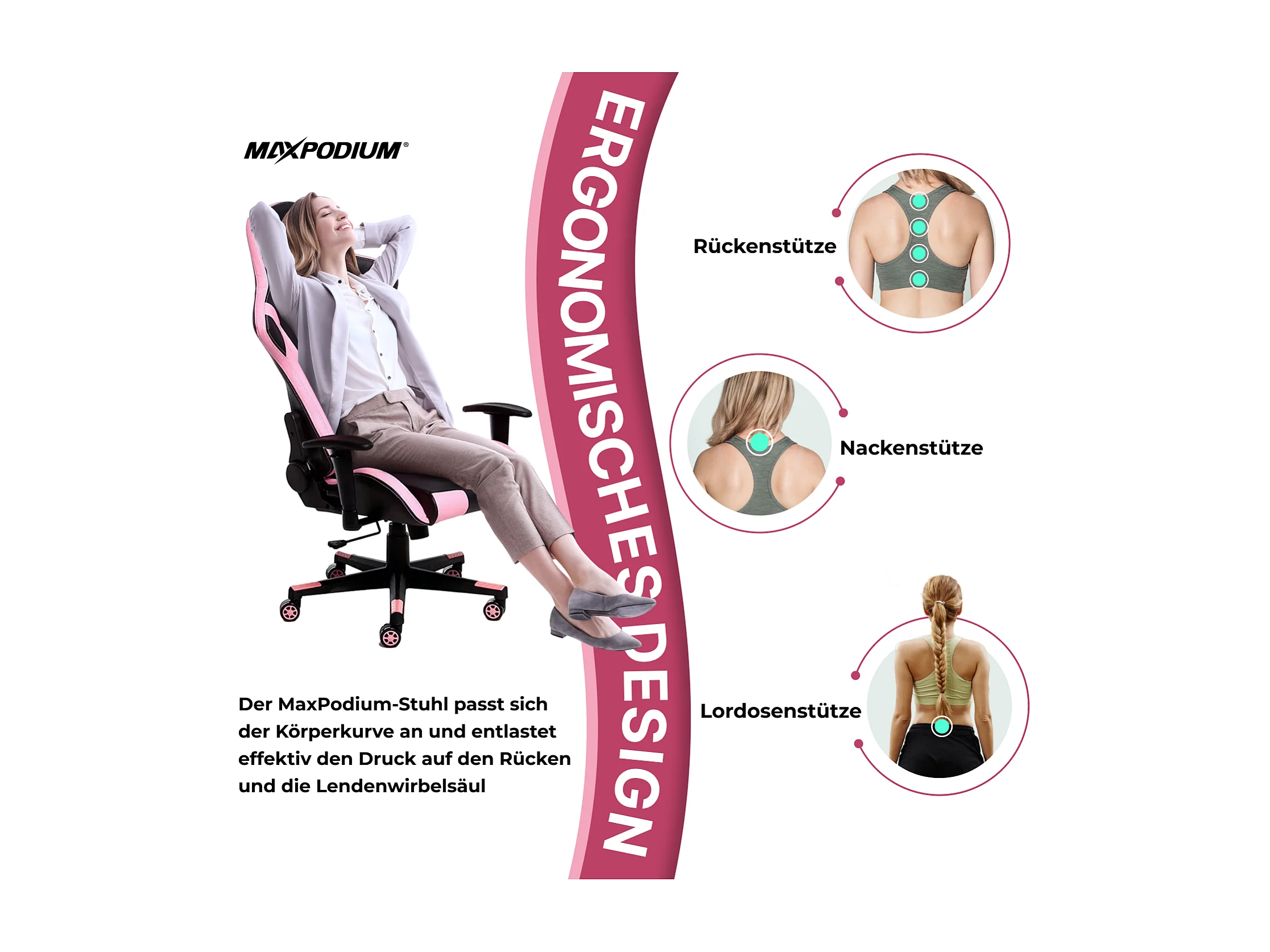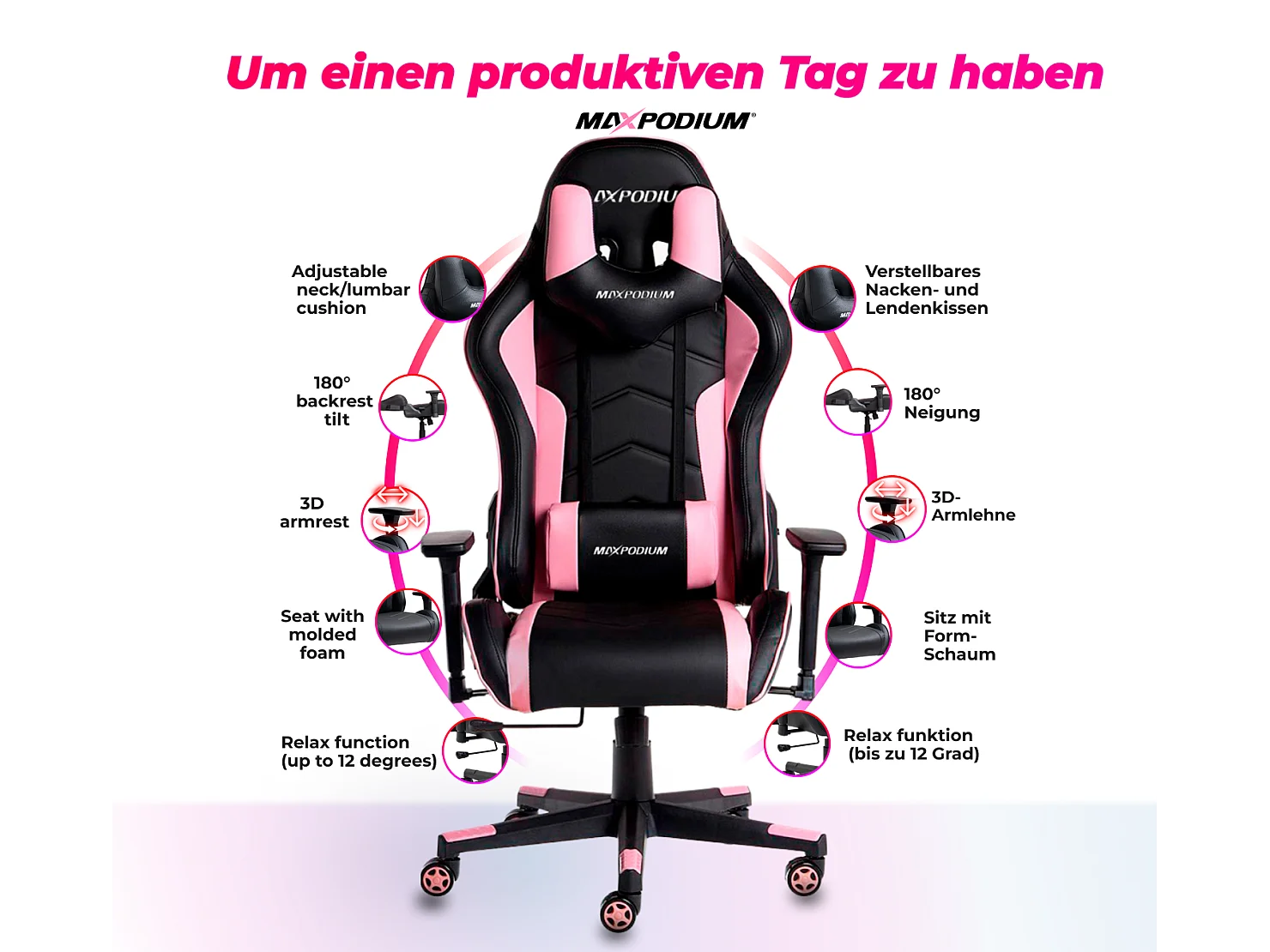 Gaming Stuhl – ergonomisch, extra breit, vielseitig einstellbar, bis 150 kg belastbar – MaxPodium Tactical, Schwarz und Rosa
