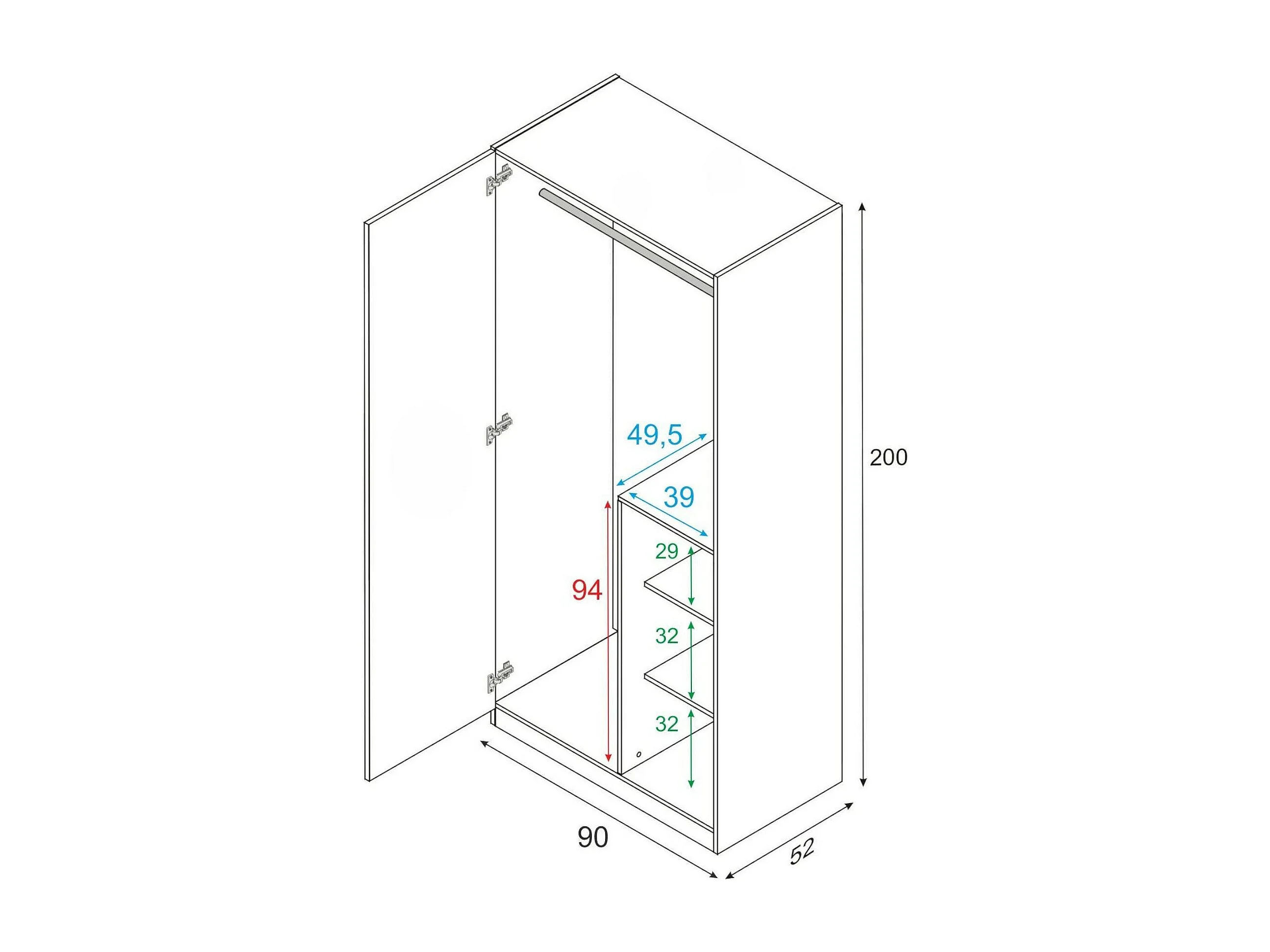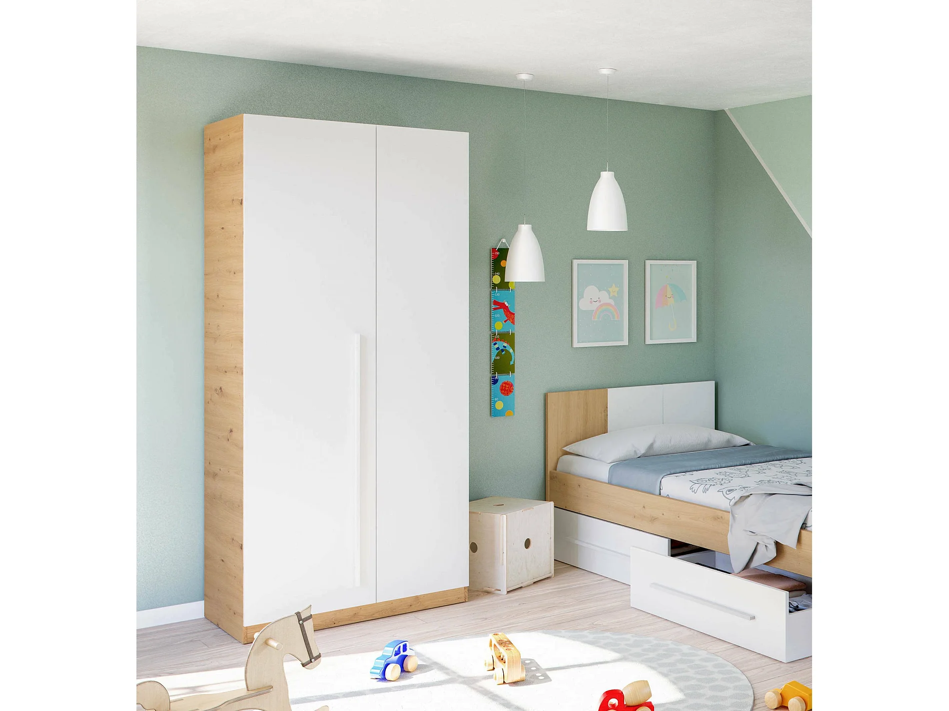 Garderobe Daabec, Schlafzimmer Kleiderschrank mit 2 Flügeltüren, Schrank mit 3 Einlegeböden und Kleiderstange, 90x52h200 cm, Geknotete Eiche und Weiß