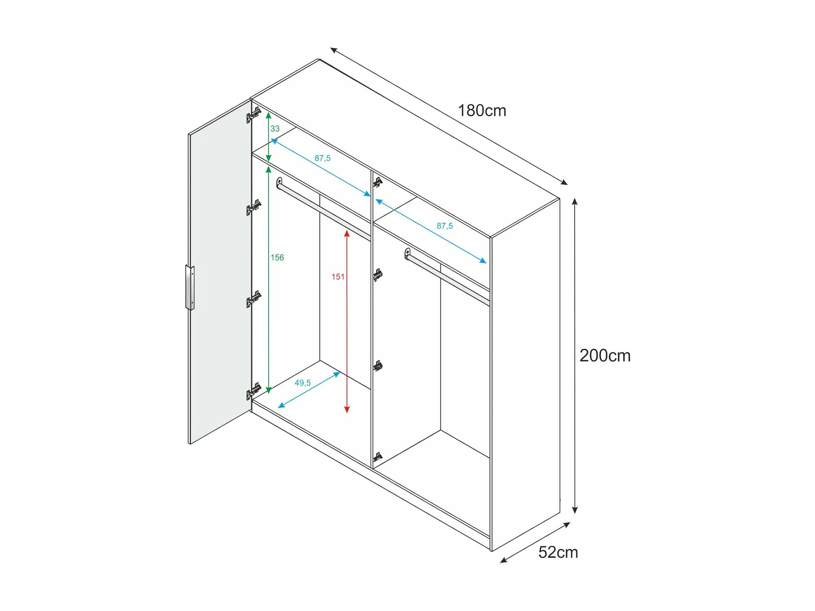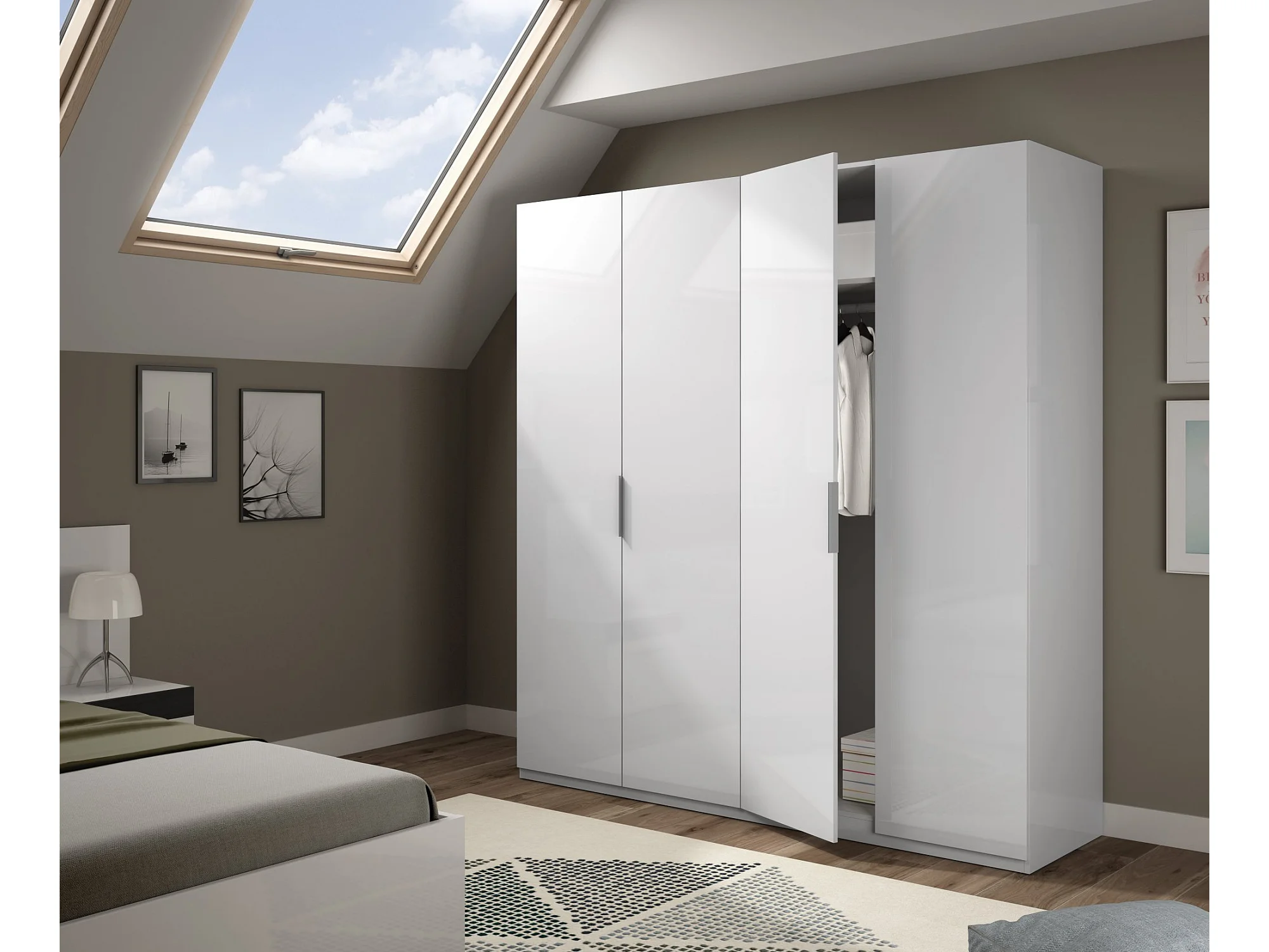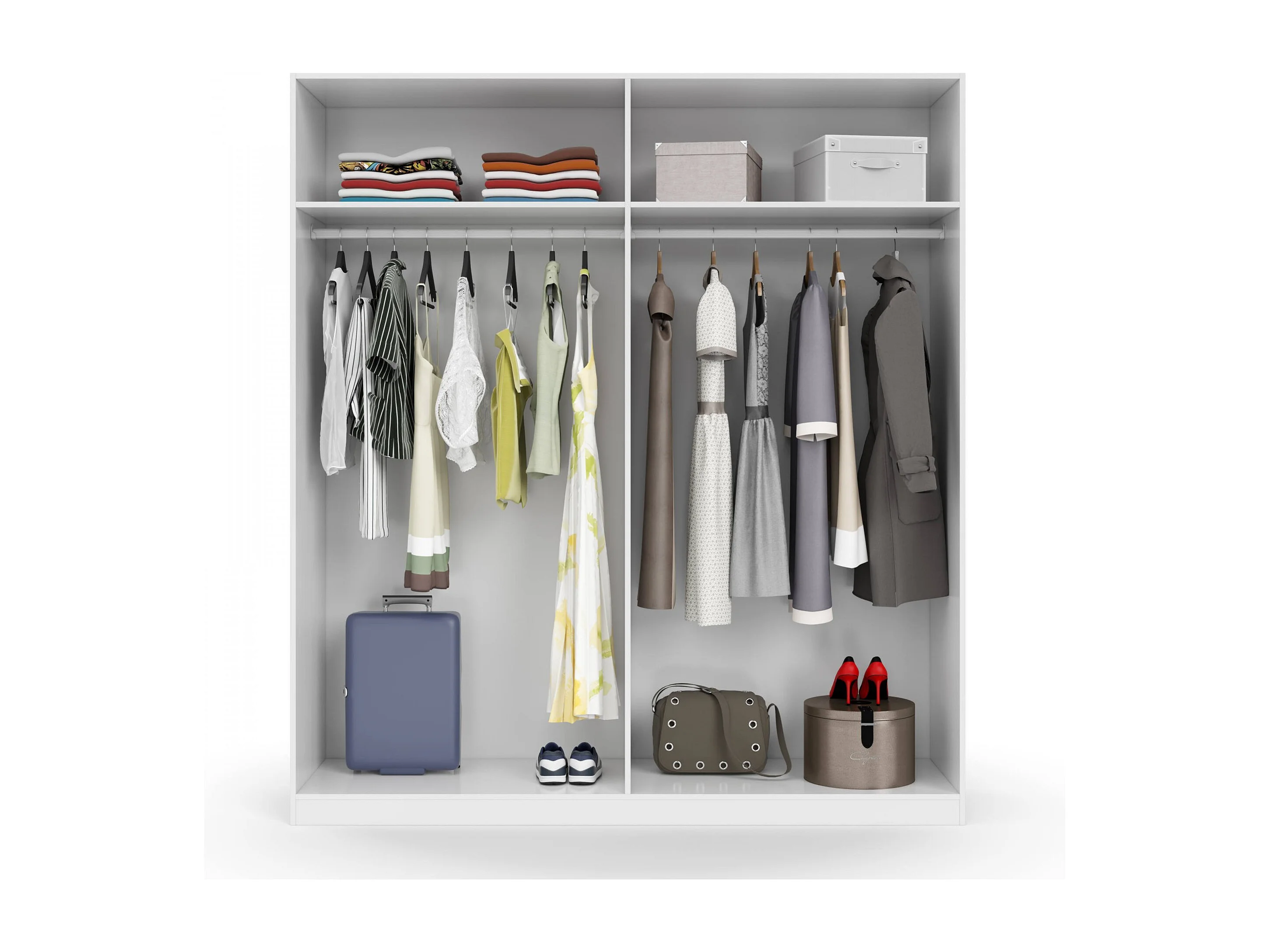 Garderobe Knoxville, Schlafzimmerschrank mit 4 Flügeltüren, Schrank mit 2 Einlegeböden und Kleiderstange, 180x52h200 cm, Weiß