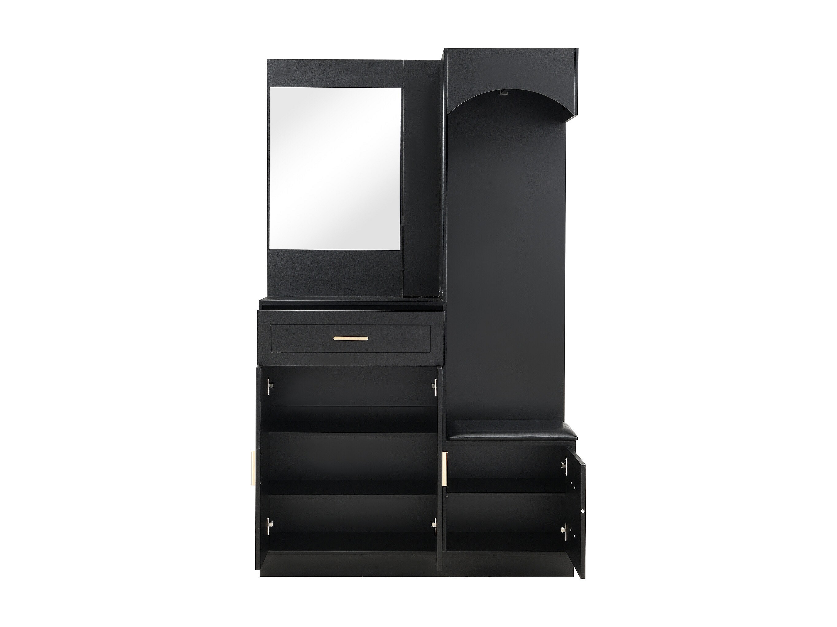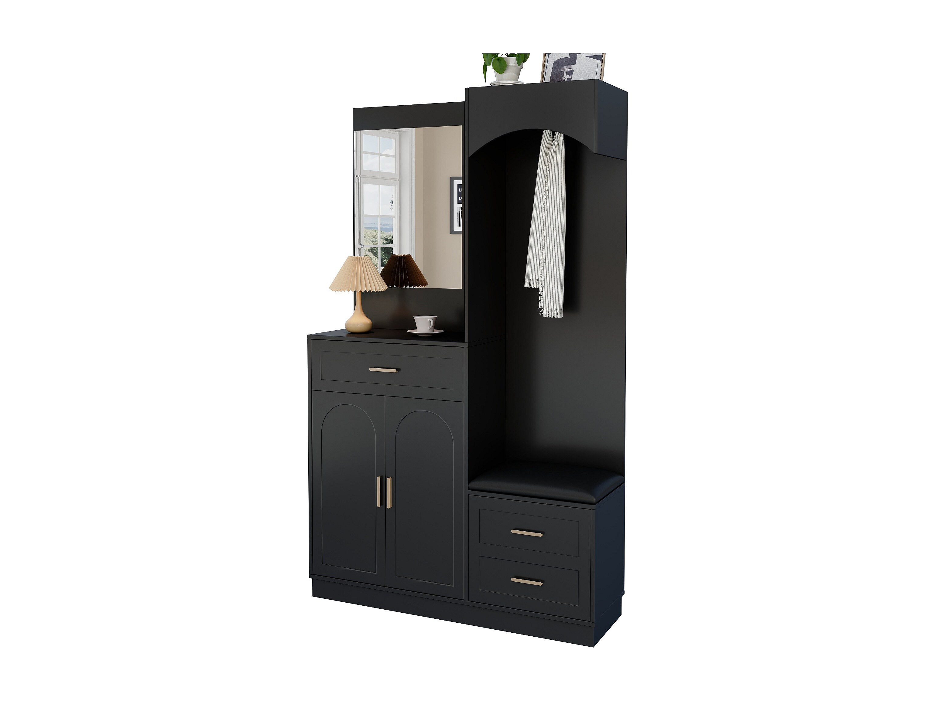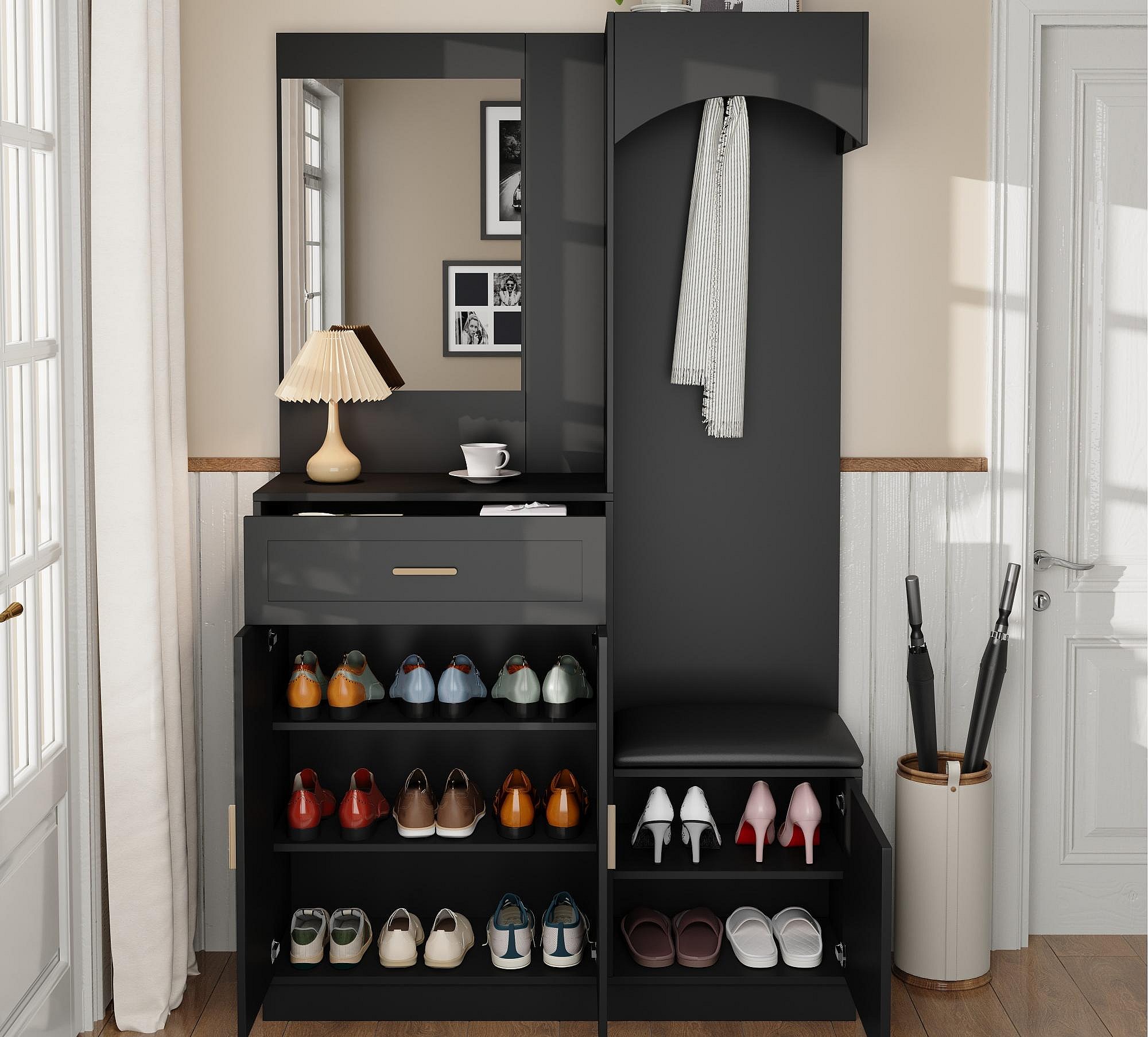 Dieses Set enthält eine Garderobe, einen Schuhschrank, einen Schminkspiegel und eine Schuhbank und bietet viel Stauraum und bequeme Sitzmöglichkeiten, um verschiedenen Aufbewahrungs- und Nutzungsbedürfnissen gerecht zu werden.