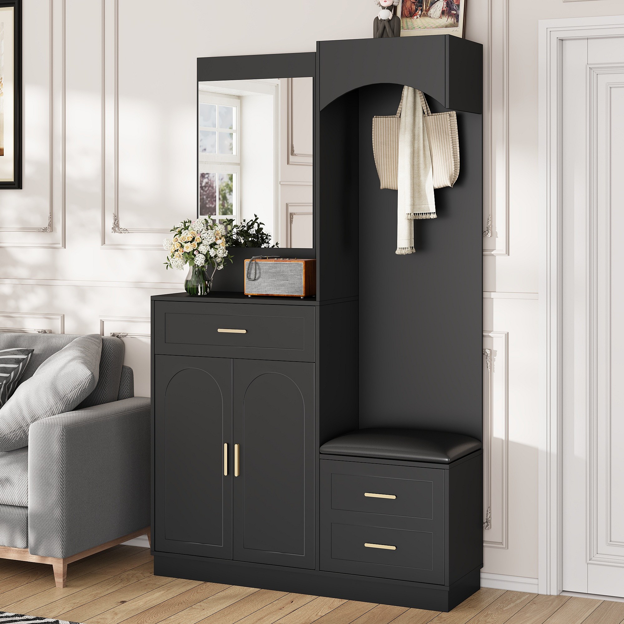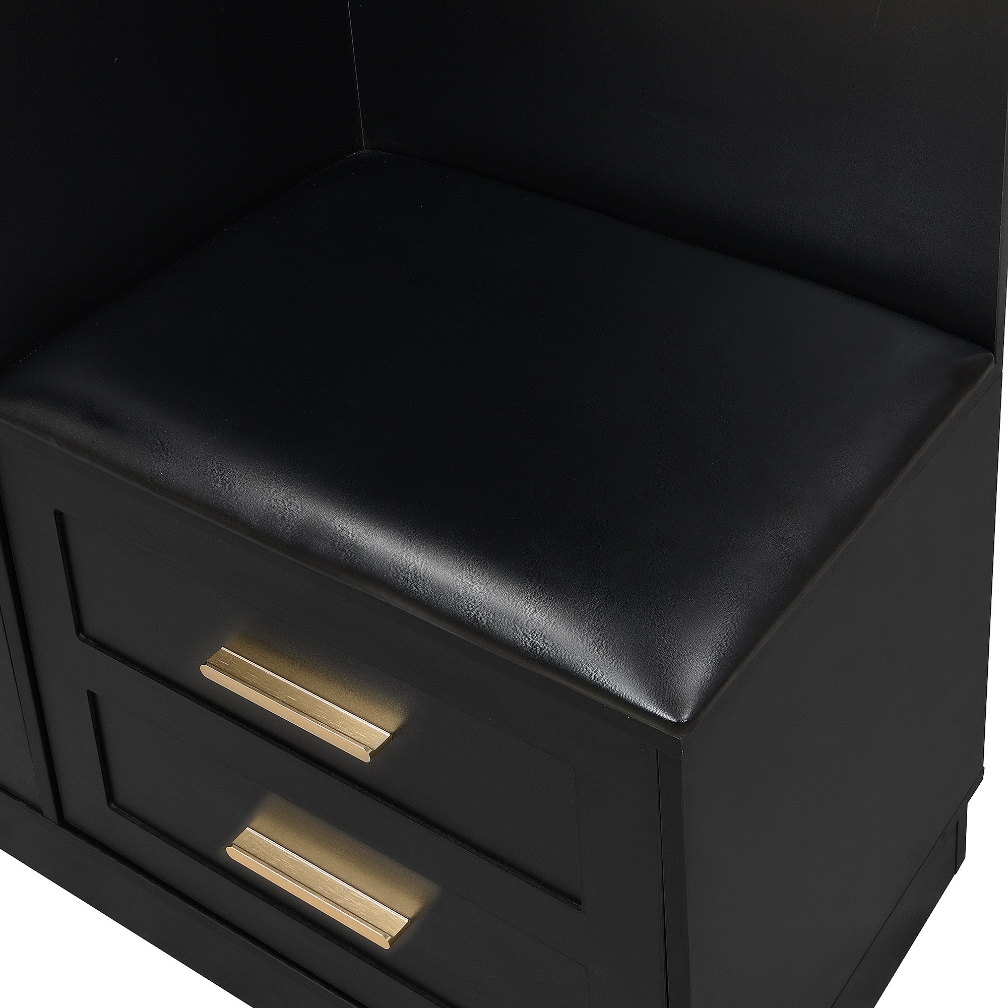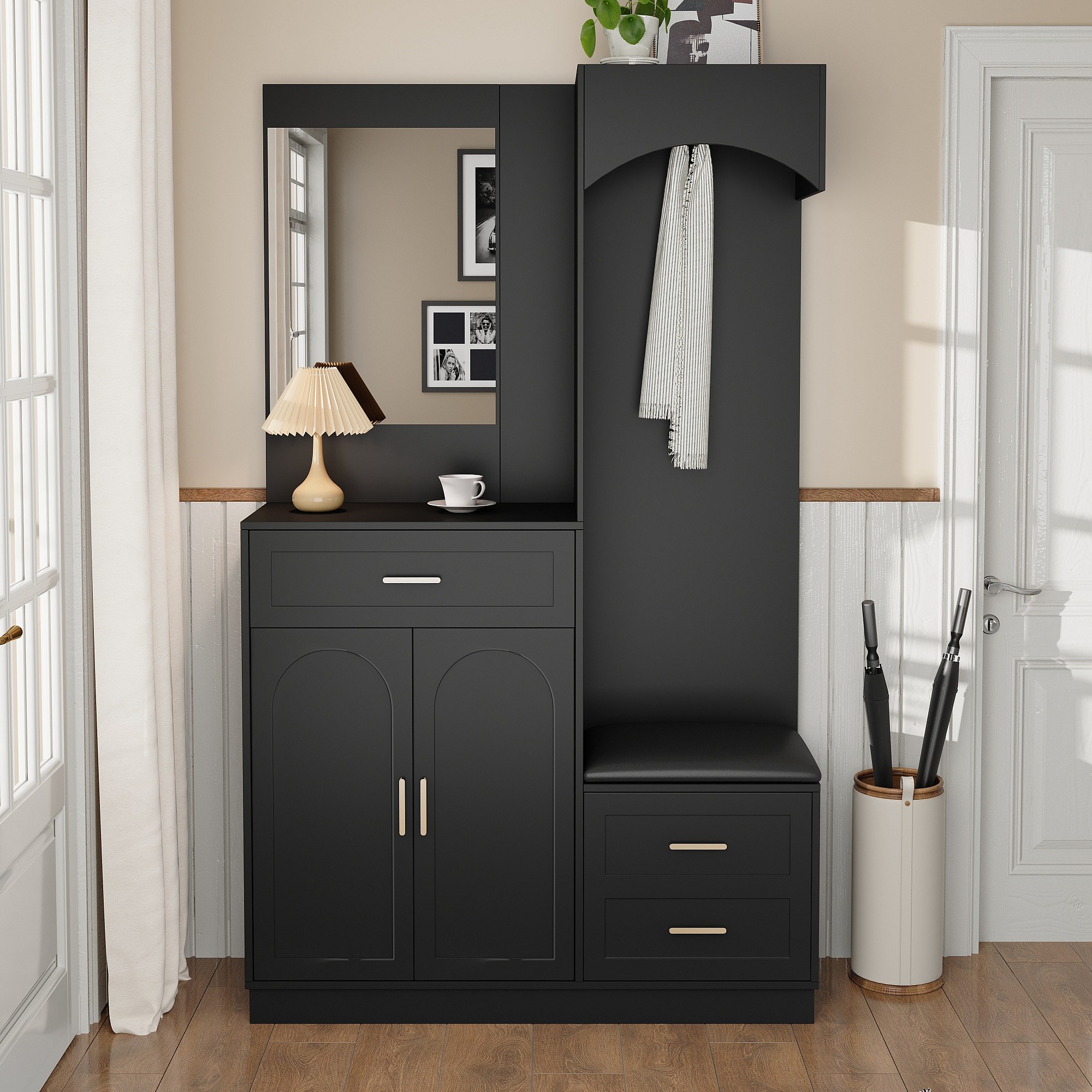 Dieses Set enthält eine Garderobe, einen Schuhschrank, einen Schminkspiegel und eine Schuhbank und bietet viel Stauraum und bequeme Sitzmöglichkeiten, um verschiedenen Aufbewahrungs- und Nutzungsbedürfnissen gerecht zu werden.