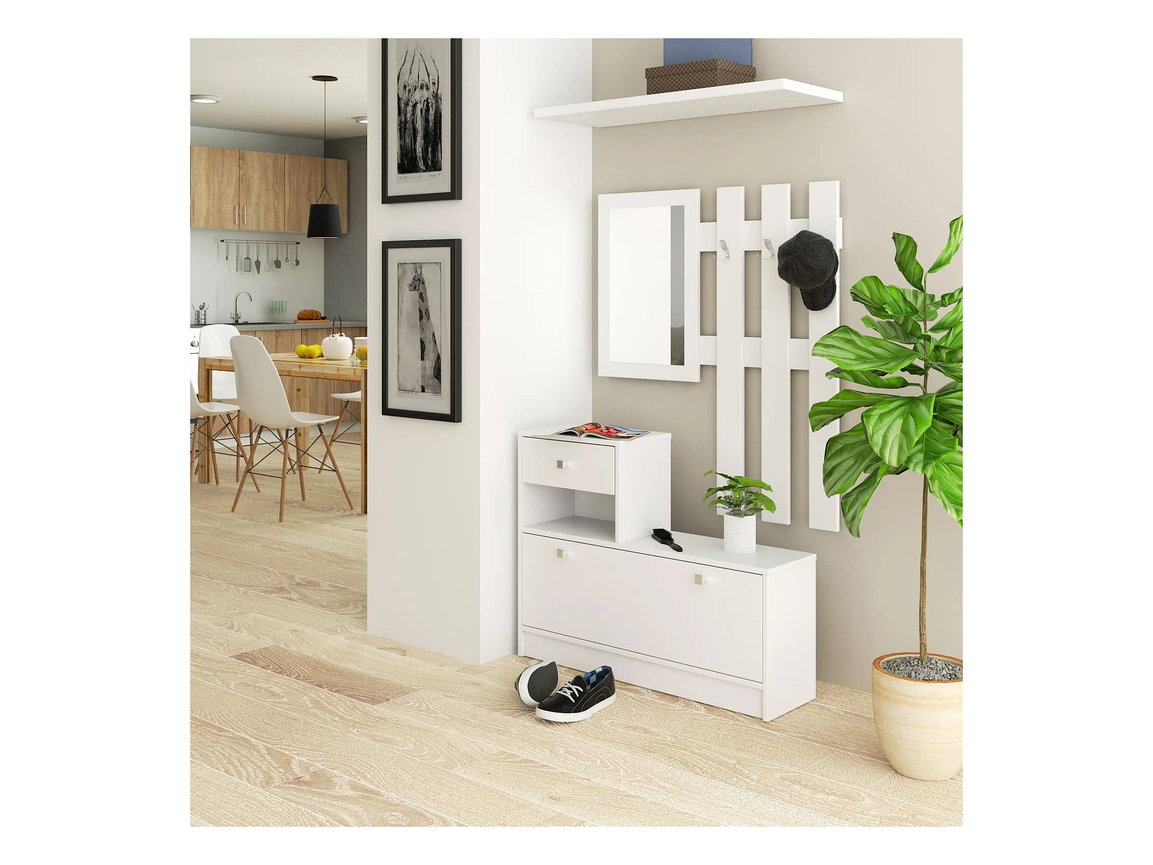 Garderoben-Set AKORD Schuhkommode mit Aufsatz in der Farbe Weiß mit 1 Schuhkipper B90 x H170 x T25 cm und Wandgarderobe mit Spiegel Gewicht 26,4 kg