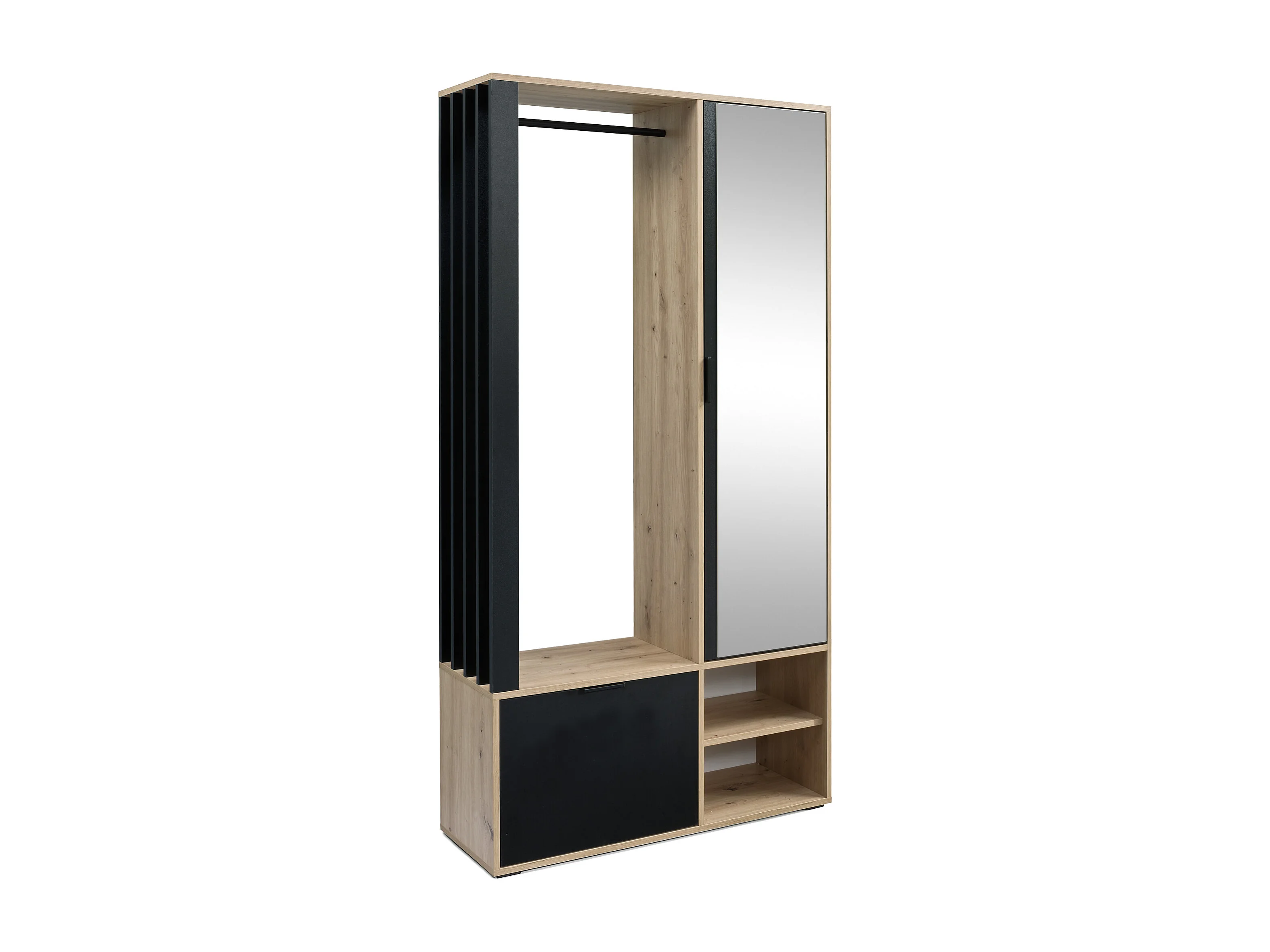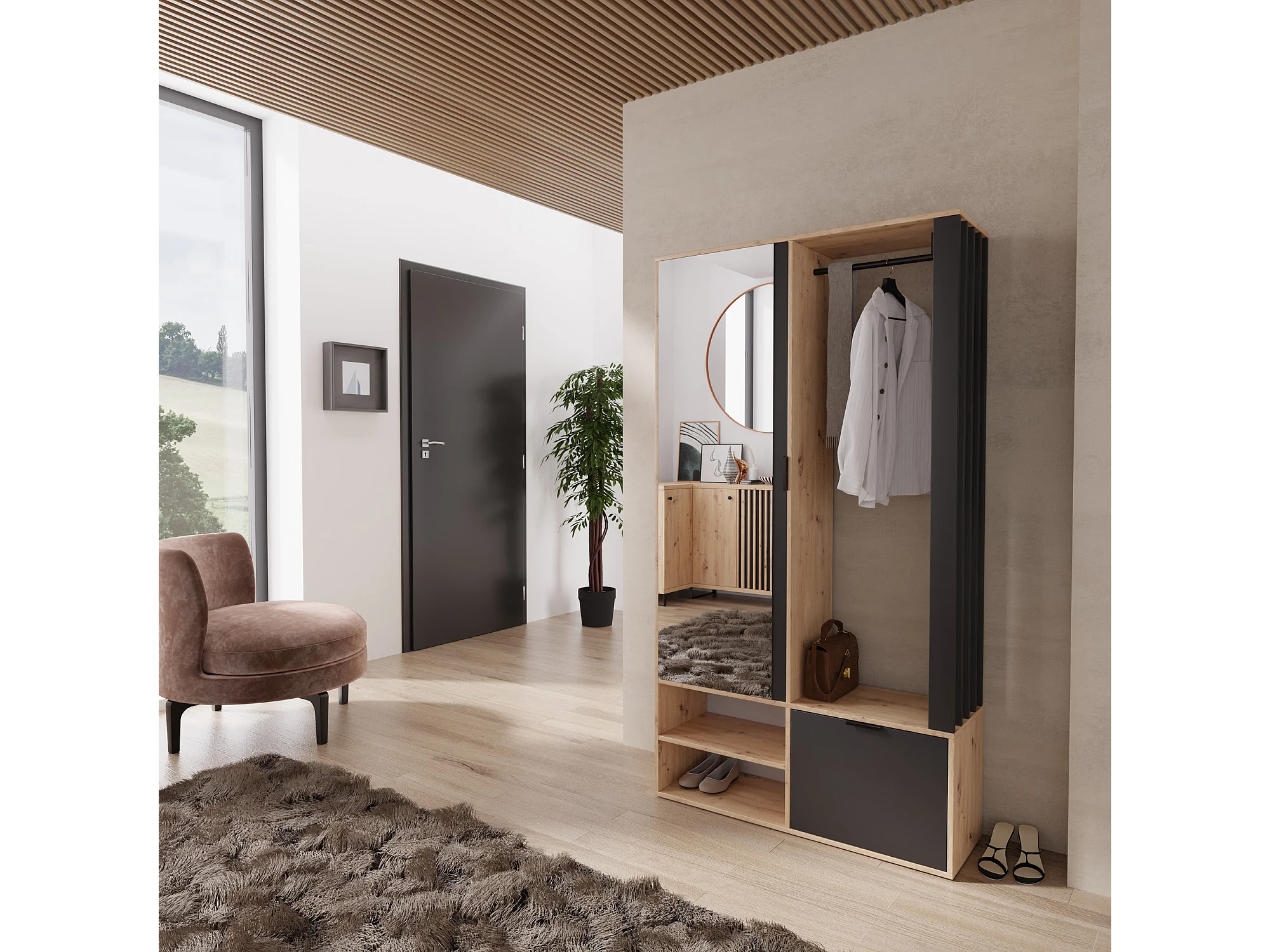 Garderoben-Set mit Spiegel & Sitzbank 100 – Flurgarderobe mit Kleiderstange, Ablage, Stauraum – Links oder Rechts – Artisan Eiche/ Schwarz – Garderobenschrank Lena
