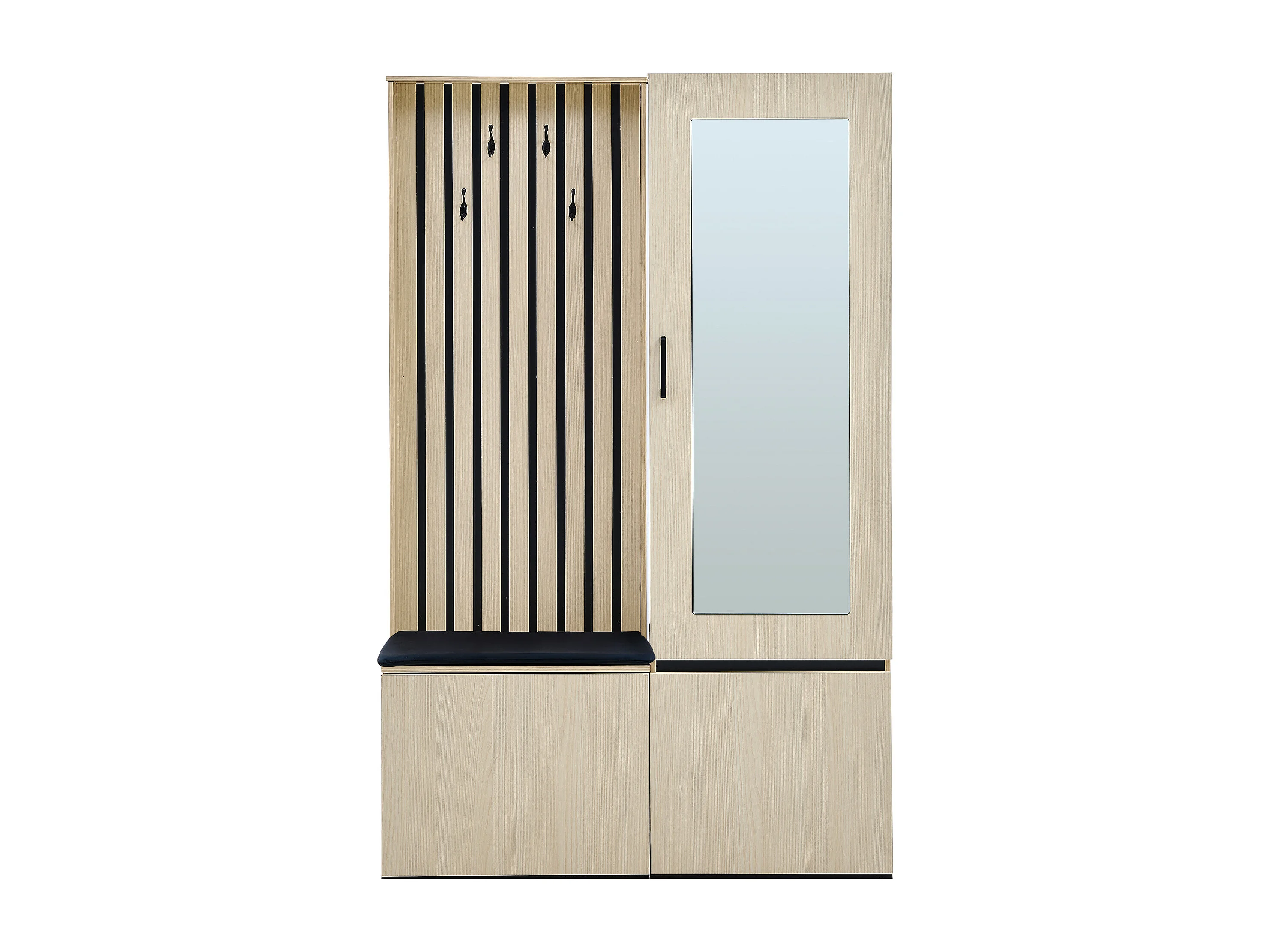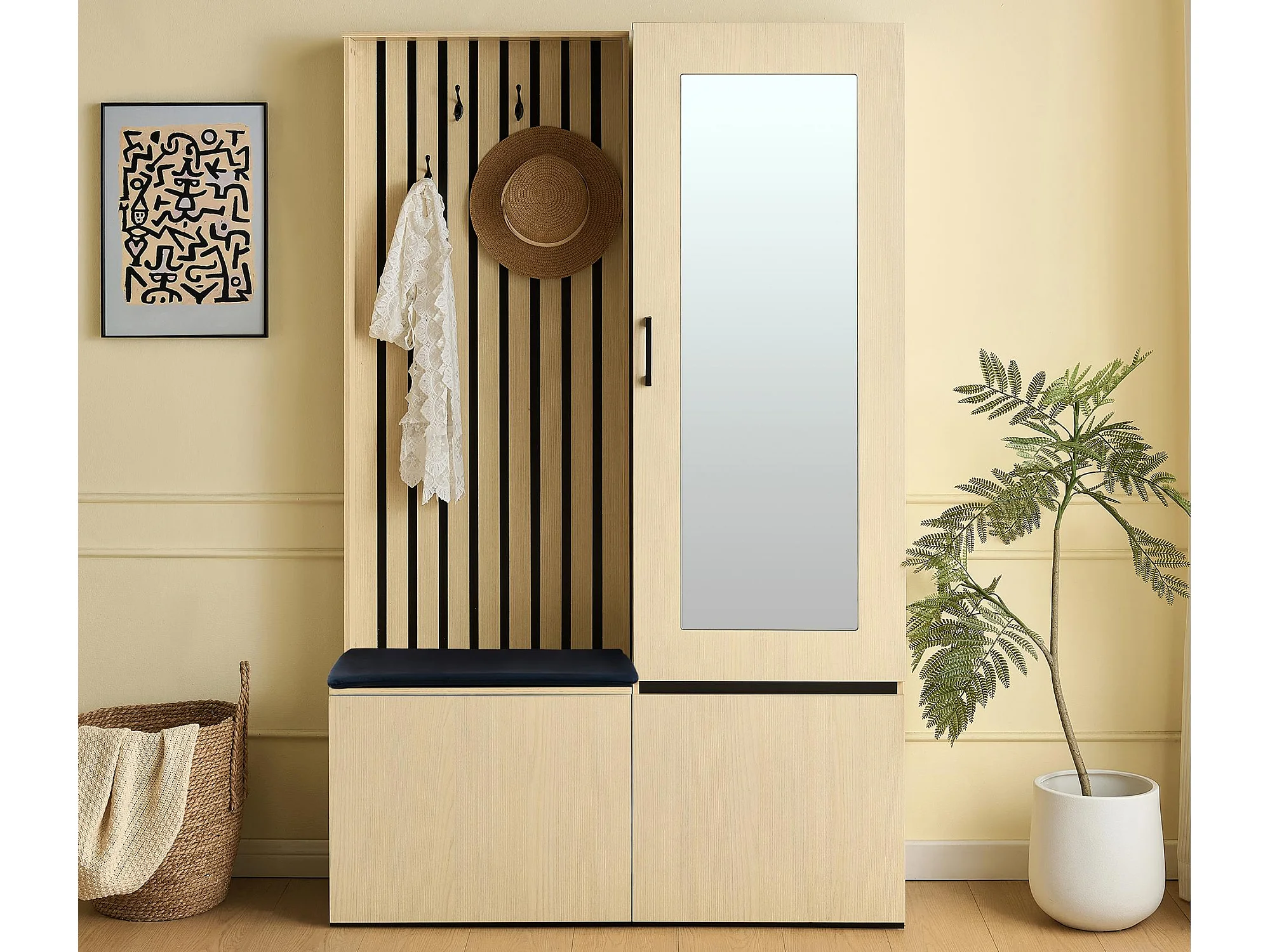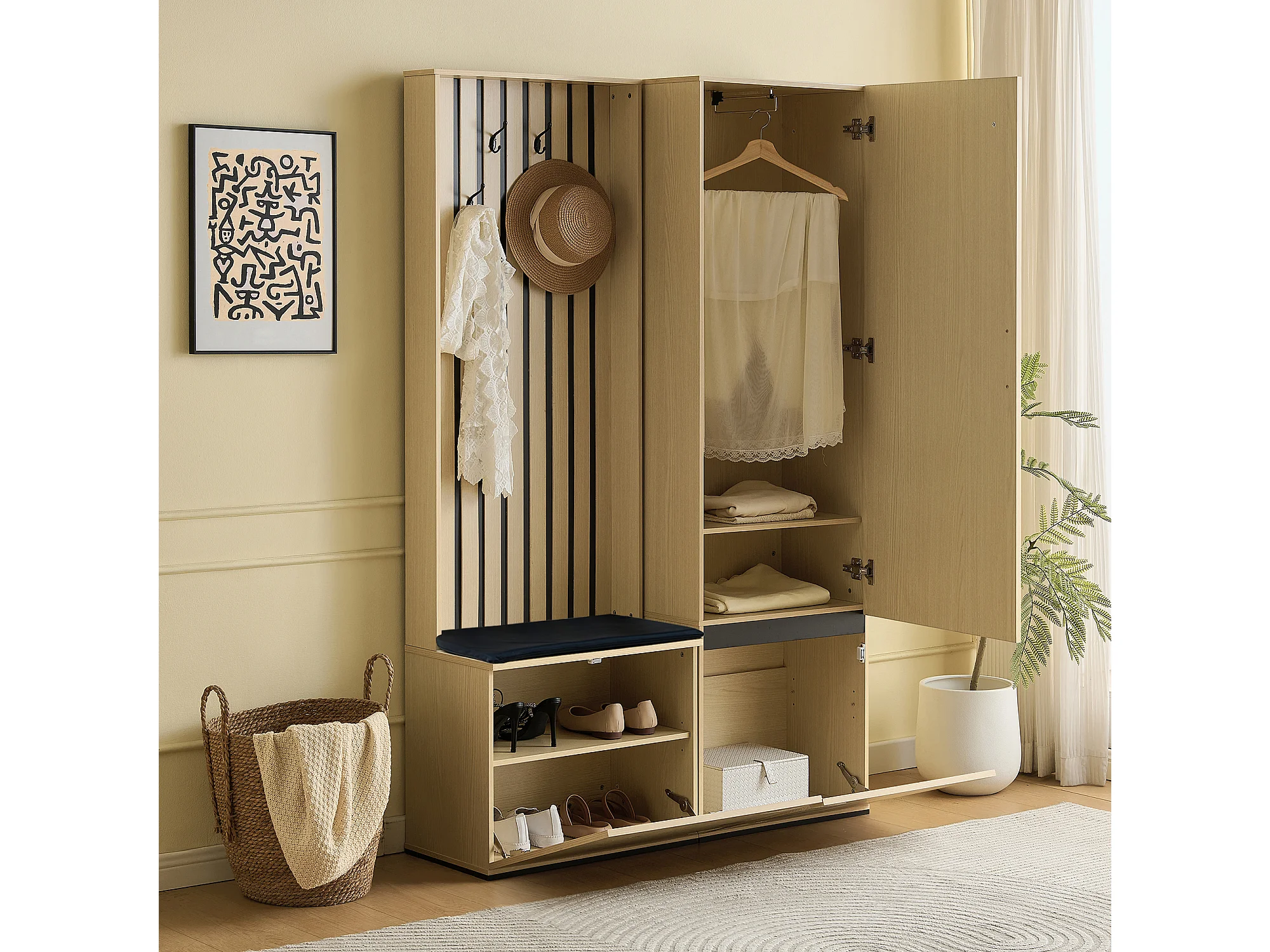 Garderobenset für den Eingangsbereich - Kleiderstange - Schuhschrank und gepolsterte Bank - mit Spiegel und 4 Haken - Natur