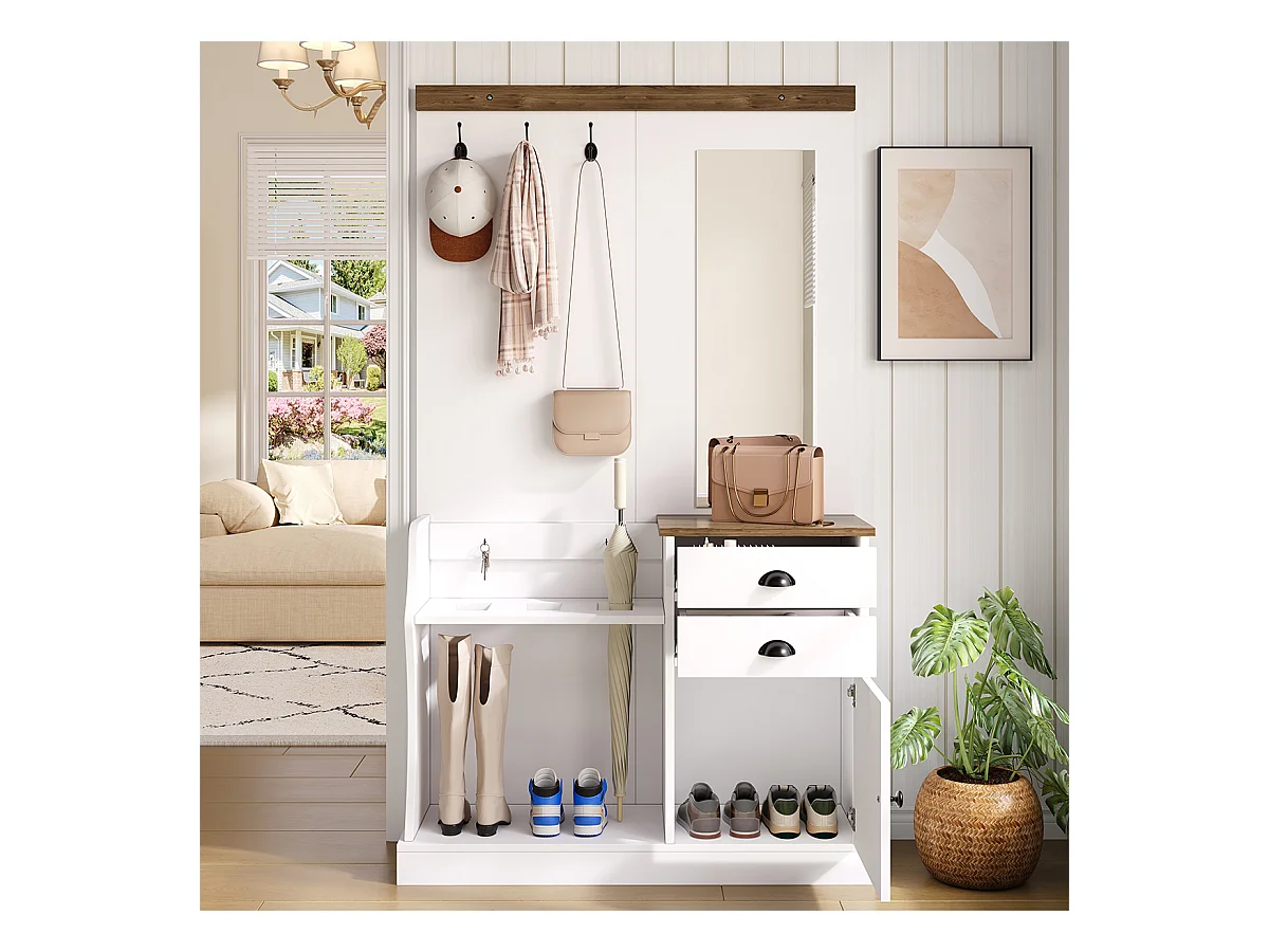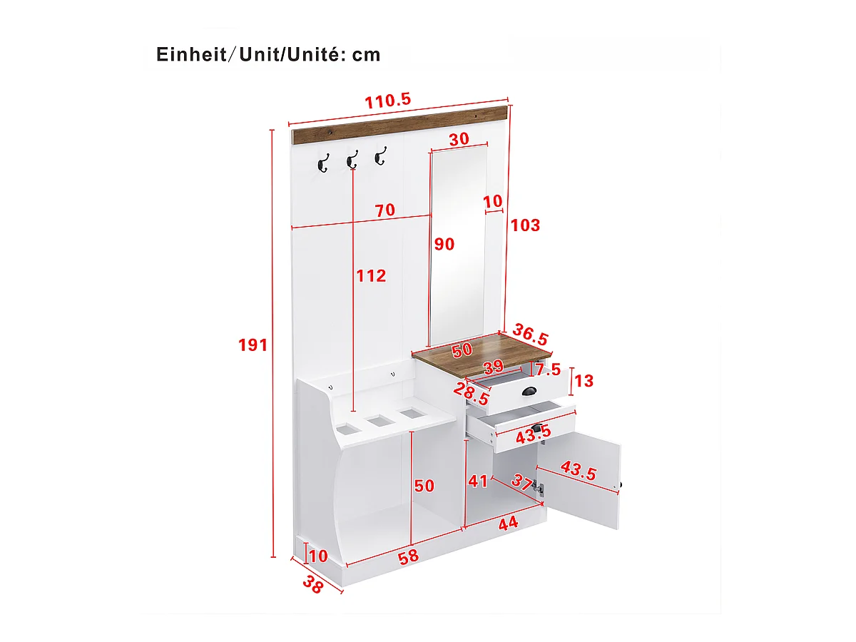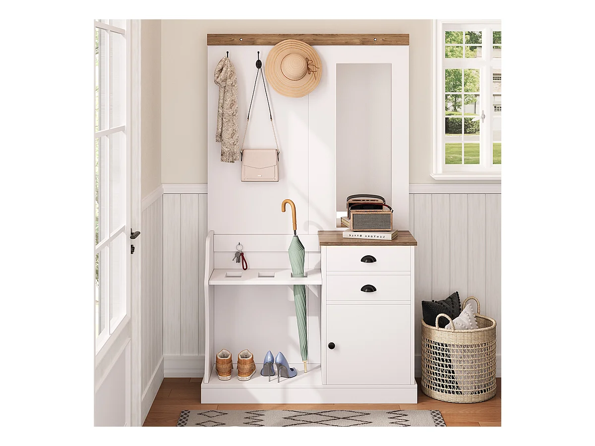 Garderobenset mit Spiegel Haken Schubladen und Schirmständer Flurgarderobe Wandgarderoben-Set 110.5 L x 38 B x 191 H Weiß